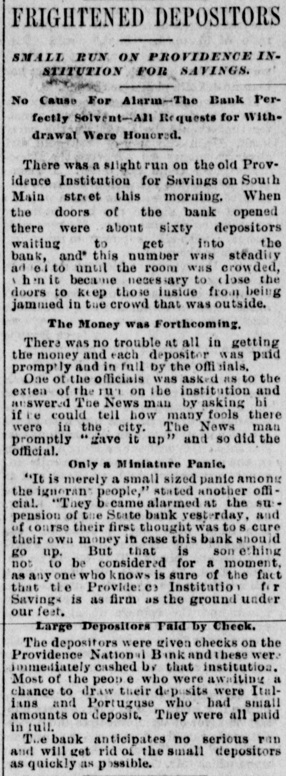 BUSINESS IN PROVIDENCE. COTTON MILLS CLOSING DOWN-RUN ON A BANK -TO CELEBRATE LABOR DAY. Providence, R. I., Aug. 5 (Special).-The industrial situation in Rhode Island is gradually growing worse. and beginning with this week a very large number of people will be out of employment temporarily. The Clyde Print Works in Warwick shut down several days ago. This is the largest print works in the country and employed a large number of people. The great cotton mills of B. B. & R. Knight. located in various villages in the town of Warwick, shut down to-night and will not start up again until the business prospects are brighter. These mills employ thousands of people, and there is consequently considerable uneasiness Zelt among them as to the future. The banks of Providence are generally supposed to be on a firm foundation. Their property is invested largely in real estate mortgages on Rhode Island property, and in first-class bonds and securitles. The fact that many people are out of work, added to the fear that the epidemic of bank failures will extend to this section, has induced many people to withdraw their deposits from savings banks. The result has been that all the larger banks, with one exception, are enforcing the ninety-day rule. In cases of extreme necessity, depositors are allowed to draw sums not exceeding $100 without notice. In this case they are obliged to take checks instead of currency. The exception noted above is the Providence Institution for Savings. That is the largest and strongest bank in the State, having at the last report 31,053 depositors. Many of its depositors are Poles, Itallans and other foreigners, who are easily frightened in times like this. These people have started a run of considerable proportions upon this bank, and their money is being paid to them as fast as they call for it. The run is a senseless one, and will result in the bank declining to take deposits from persons closing their accounts at this time. The State Bank failed on Friday. This is one of er banks of the city, being chartered in May, the 1850. It is a small institution, its entire resources amounting to $336,794. according to the last report of the bank commissioner. It held at that time about $200,000 in deposits. The descendants of Joseph Williams, who was a son of Roger Williams, the founder of Rhode Island. held a reunion at Roger Williams Park on Thursday. The occasion was made very informal, the only business of importance being the appointment of the committee to arrange for future reunions. On this committee are Professor Alonzo Williams. of Brown University, and Bowen R. Church, leader of the American Band. The Central Labor Union have made arrangements 'for a Labor Day demonstration at Rocky Point on September 4. It is proposed to have a large street parade in Providence in the morning, with speaking and sports at Rocky Point. The new electric railway, running from Market Square through East Providence to Crescent, Park, was opened this week, and has been carrying large numbers of passengers. The Continental Steamboat Company, which has hitherto had the monopoly of the Crescent Park business. has reduced its fares, so that the trip costs only ten cents where package tickets are purchased. By the electric road the fare is twenty cents. A lively competition is promised. The city is to erect a building at Roger Williams Park, to be used as a museum, at the expense of $40,000. The motive for this building was given by the fact that John Steere, a wealthy Californian and a former resident of this city, bequeathed to the city of Providence a very fine collection of stuffed birds and animals, upon condition that a suitable museum should be erected for them in Roger Williams Park B. B. & R. Knight, who are the owners of the village of River Point. located on the Pawtuxet River, have begun the construction of a system of sewers, to take care of sewage from the tenements and factories in that village, so that the Pawtuxet water, which is used by the people of Providence for drinking purposes. win no longer be contaminated from that source.