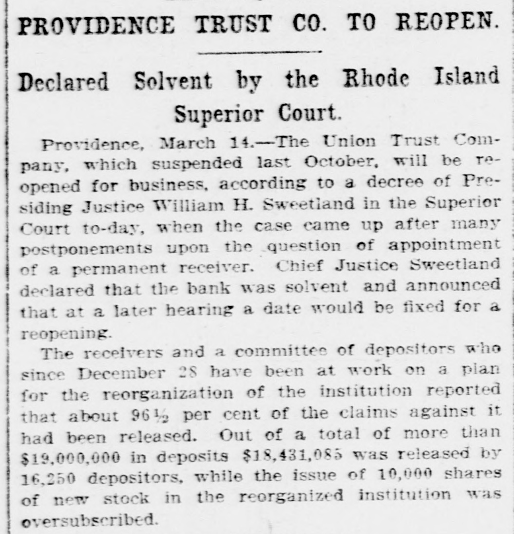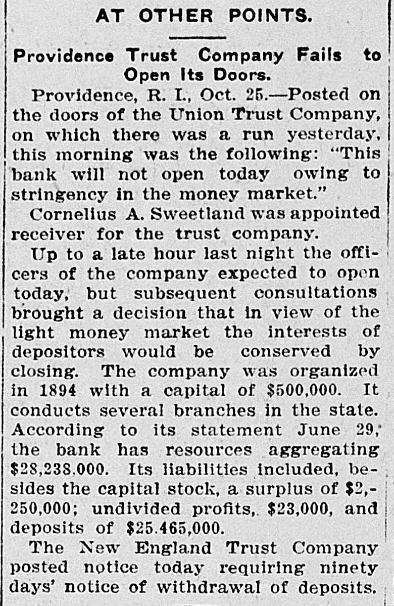 AT OTHER POINTS. Providence Trust Company Fails to Open Its Doors. Providence, R. I., Oct. 25.-Posted on the doors of the Union Trust Company, on which there was a run yesterday, this morning was the following: "This bank will not open today owing to stringency in the money market." Cornelius A. Sweetland was appointed receiver for the trust company. Up to a late hour last night the officers of the company expected to open today, but subsequent consultations brought a decision that in view of the light money market the interests of depositors would be conserved by closing. The company was organized in 1894 with a capital of $500,000. It conducts several branches in the state. According to its statement June 29, the bank has resources aggregating $28,238.000. Its liabilities included, besides the capital stock, a surplus of $2,250,000; undivided profits, $23,000, and deposits of $25.465,000. The New England Trust Company posted notice today requiring ninety days' notice of withdrawal of deposits.