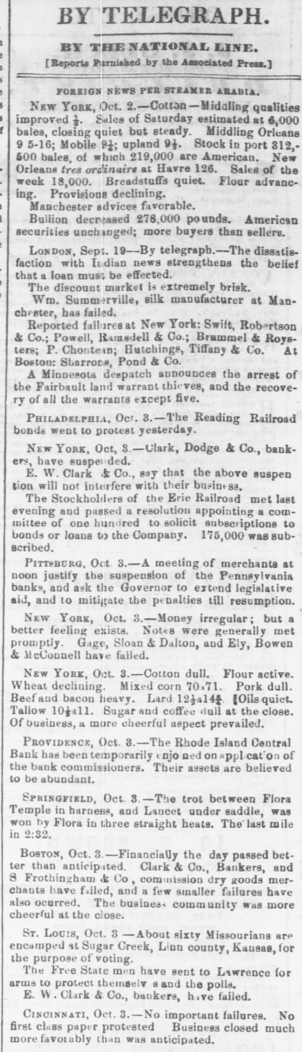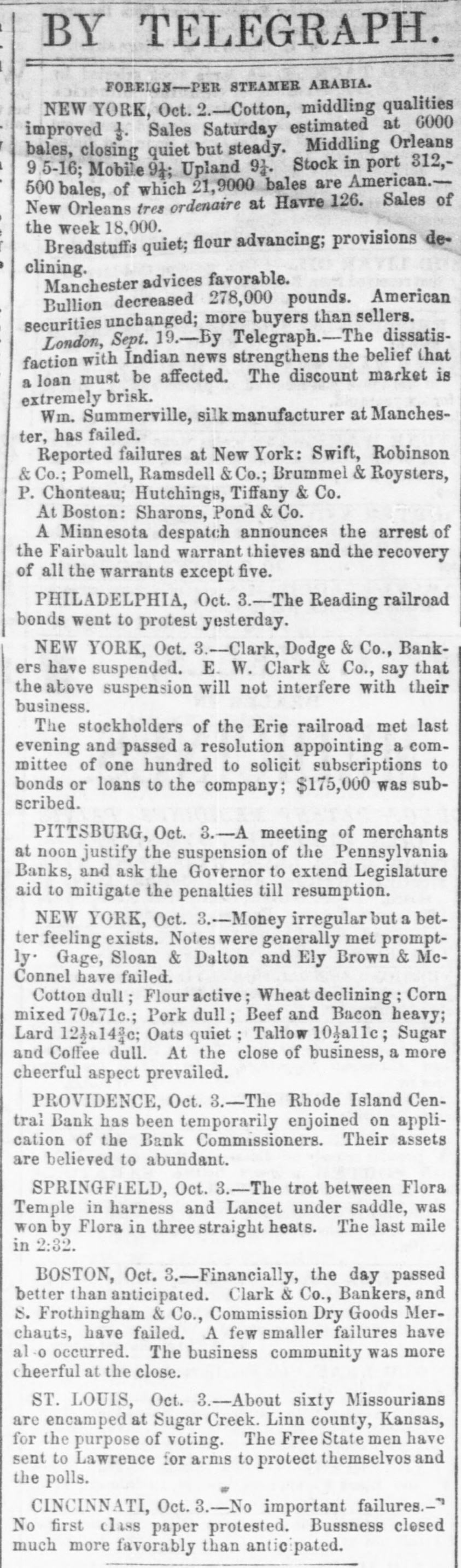 BY TELEGRAPH. FOREIGN-PER STEAMER ARABIA. NEW YORK, Oct. 2.-Cotton, middling qualities improved 1. Sales Saturday estimated at 6000 bales, closing quiet but steady. Middling Orleans 9 5-16; Mobile 91; Upland 91. Stock in port 312,500 bales, of which 21,9000 bales are American.New Orleans tres ordenaire at Havre 126. Sales of the week 18,000. Breadstuffs quiet; flour advancing; provisions declining. Manchester advices favorable. Bullion decreased 278,000 pounds. American securities unchanged; more buyers than sellers. London, Sept. 19.-By Telegraph.-The dissatisfaction with Indian news strengthens the belief that a loan must be affected. The discount market is extremely brisk. Wm. Summerville, silk manufacturer at Manchester, has failed. Reported failures at New York: Swift, Robinson & Co.; Pomell, Ramsdell & Co.; Brummel & Roysters, P. Chonteau; Hutchings, Tiffany & Co. At Boston: Sharons, Pond & Co. A Minnesota despatch announces the arrest of the Fairbault land warrant thieves and the recovery of all the warrants except five. PHILADELPHIA, Oct. 3.-The Reading railroad bonds went to protest yesterday. NEW YORK, Oct. 3.-Clark, Dodge & Co., Bankers have suspended. E. W. Clark & Co., say that the above suspension will not interfere with their business. The stockholders of the Erie railroad met last evening and passed a resolution appointing a committee of one hundred to solicit subscriptions to bonds or loans to the company; $175,000 was subscribed. PITTSBURG, Oct. 3.-A meeting of merchants at noon justify the suspension of the Pennsylvania Banks, and ask the Governor to extend Legislature aid to mitigate the penalties till resumption. NEW YORK, Oct. 3.-Money irregular but a better feeling exists. Notes were generally met promptly. Gage, Sloan & Dalton and Ely Brown & McConnel have failed. Cotton dull; Flour active; Wheat declining Corn mixed 70a71c.; Pork dull; Beef and Bacon heavy; Lard 12}a14{c; Oats quiet; Tallow 10}allc; Sugar and Coffee dull. At the close of business, a more cheerful aspect prevailed. PROVIDENCE, Oct. 3.-The Rhode Island Central Bank has been temporarily enjoined on application of the Bank Commissioners. Their assets are believed to abundant. SPRINGFIELD, Oct. 3.-The trot between Flora Temple in harness and Lancet under saddle, was won by Flora in three straight heats. The last mile in 2:32. BOSTON, Oct. 3.-Financially, the day passed better than anticipated. Clark & Co., Bankers, and S. Frothingham & Co., Commission Dry Goods Merchauts, have failed. A few smaller failures have al o occurred. The business community was more cheerful at the close. ST. LOUIS, Oct. 3.-About sixty Missourians are encamped at Sugar Creek. Linn county, Kansas, for the purpose of voting. The Free State men have sent to Lawrence for arms to protect themselvos and the polls. CINCINNATI, Oct. 3.-No important failures.-" No first class paper protested. Bussness closed much more favorably than antic pated.