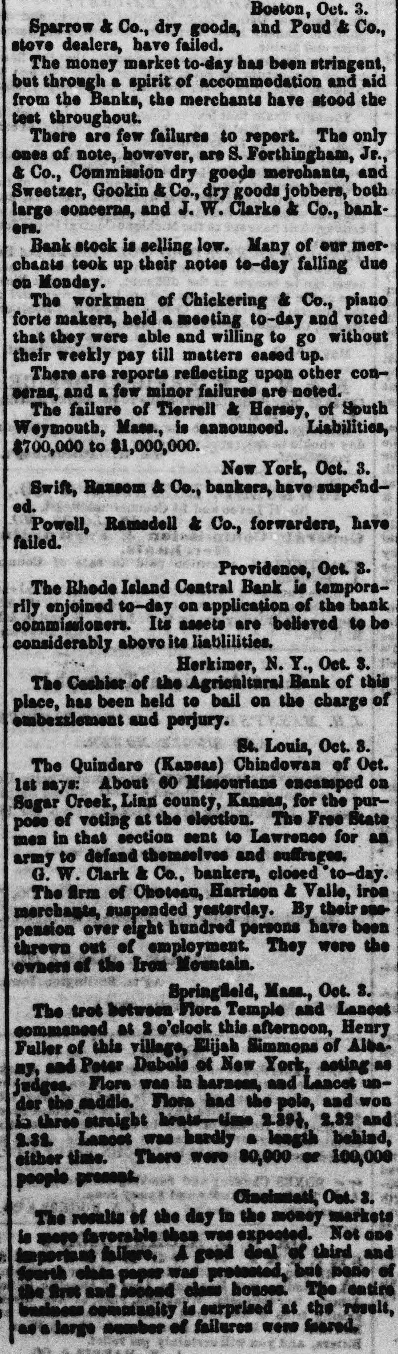 Boston, Oct. 3. Sparrow & Co., dry goods, and Poud & Co., stove dealers, have failed. The money market to-day has been stringent, but through a spirit of accommodation and aid from the Banks, the merchants have stood the test throughout. There are few failures to report. The only ones of note, however, are S. Forthingham, Jr., & Co., Commission dry goods merchants, and Sweetzer, Gookin & Co., dry goods jobbers, both large concerns, and J. W. Clarke & Co., bankers. Bank stock is selling low. Many of our merchants took up their notes to-day falling due on Monday. The workmen of Chickering & Co., piano forte makers, held a meeting to-day and voted that they were able and willing to go without their weekly pay till matters eased up. There are reports reflecting upon other conoerns, and a few minor failures are noted. The failure of Tierrell & Hersey, of South Weymouth, Mass., is announced. Liabilities, $700,000 to $1,000,000. New York, Oct. 3. Swift, Ransom & Co., bankers, have suspended. Powell, Ramsdell & Co., forwarders, have failed. Providence, Oct. 3. The Rhode Island Central Bank is temporarily enjoined to-day on application of the bank commissioners. Its assets are believed to be considerably above its liablilities. Herkimer, N. Y., Oct. 3. The Cashier of the Agricultural Bank of this place, has been held to bail on the charge of embezziement and perjury. St. Louis, Oct. 3. The Quindaro (Kansas) Chindowan of Oct. 1st says: About 60 Missourians encamped on Sugar Creek, Lian county, Kansas, for the purpose of voting at the election. The Free State men in that section sent to Lawrence for an army to defand themselves and suffrages. G. W. Clark & Co., bankers, closed to-day. The firm of Choteau, Harrison & Valle, irom merchants, suspended yesterday. By their suspension over eight hundred persons have been thrown out of employment. They were the owners of the Iron Mountain. Springfield, Mass., Oct. 3. The trot between Flora Temple and Lancet commenced at 2 o'clock this afternoon, Henry Fuller of this village, Elijah Simmons of Albamy, and Peter Dubois of New York, acting as judges. Flora was in harness, and Lancet under the saddle. Flora had the pole, and won ia three straight brats-time 2.39t, 2.32 and 2.32. Lancet was hardly a length behind, either time. There were 80,000 or 100,000 people present. Cincinnati, Oct. 3. The results of the day in the money markets is more favorable then was expected. Not one important failure. s good deal of third and fourth claim paper was protected, but nene of the first and second class houses. The entire business community is surprised at the result, as a large number of failures were feared.