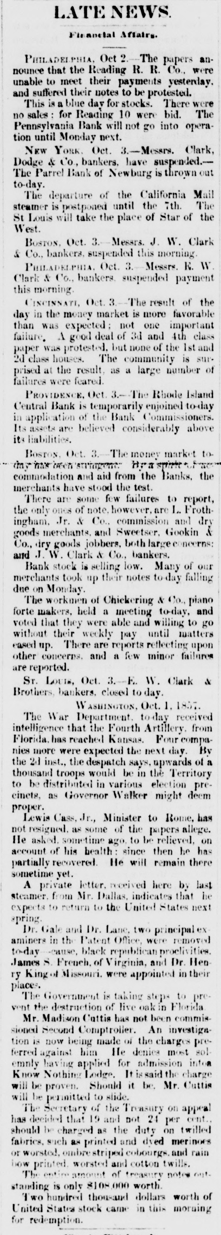 LATE NEWS. Financial Affairs. PHILADELPHIA, Oct 2.-The papers an nounce that the Reading R. R. Co., were unable to meet their payments yesterday and suffered their notes to be protested. This is a blue day for stocks. There were no sales: for Reading 10 were bid. The Pennsylvania Bank will not go into opera tion until Monday next. NEW YORK. Oct. 3.-Messrs. Clark Dodge & Co., bankers. have suspended.The Parrel Bank of Newburg is thrown ou to-day. The departure of the California Mai steamer is postponed until the 7th. The St Louis will take the place of Star of the West. BOSTON, Oct. 3.-Messrs. J. W. Clarl & Co., bankers, suspended this morning. PHILADELPHIA, Oct. 3.-Messrs. R. W Clark & Co., bankers. suspended paymen this morning. CINCINNATI, Oct. 3.-The result of the day in the money market is more favorable than was expected : not one importan failure. A good deal of 3d and 4th clas paper was protested, but none of the 1st and 2d class houses. The community is sur prised at the result, as a large number o failures were feared. PROVIDENCE, Oct. 3.-The Rhode Island Central Bank is temporarily enjoined to-day in application of the Bank Commissioners Its assets are believed considerably above its liabilities. BOSTON, Oct. The money market to day has suingent. commodation and aid from the Banks, the merchants have stood the test. There are some few failures to report the only ones of note. however, are L. Froth ingham, Jr. & Co., commission and dry goods merchants. and Sweetser, Gookin & Co., dry goods jobbers, both large concerns and J. W. Clark & Co., bankers. Bank stock is selling low. Many of oui merchants took up their notes to-day falling due on Monday. The workmen of Chickering & Co., piano forte makers, held a meeting to-day, and voted that they were able and willing to go without their weekly pay until matters eased up. There are reports reflecting upor other concerns. and a few minor failure are reported. Sr. LOUIS, Oct. 3.-E. W. Clark & Brothers, bankers. closed to day. WASHINGTON, Oct. 1. 1857. The War Department. to-day received intelligence that the Fourth Artillery. from Florida. has reached Kansas. Four compa nies more were expected the next day. By the 2d inst., the despatch says, upwards of a thousand troops would be in the Territory to be distributed in various election precinets, as Governor Walker might deem proper. Lewis Cass, Jr., Minister to Rome, has not resigned. as some of the papers allege.