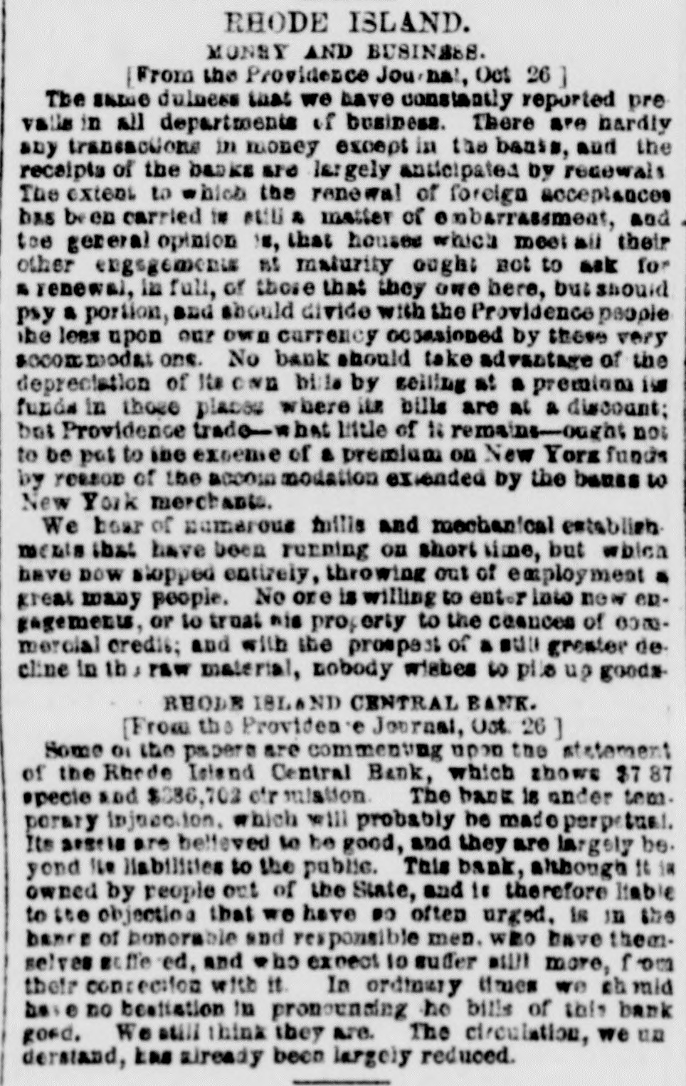 RHODE ISLAND. MONRY AND BUSINESS. From the Providence Journal, Oct 26 The INDOB dulness that we have constantly reported prevalls in all departments of business. There are hardly any transactions in money except in the banis, and the receipts of the backs are largely anticipated by reaewals The extent to which the renewal of foreign acceptances has been carried in alli & matter of embarrassment, and tee general opinion 18, that houses which meet all their other engsgements as malurity ought not to ask for & renewal, in full, of those that they owe here, but should psy a portion, and should divide with the Providence people he less upon our own currency occasioned by these very accommodal one. No bank should take advantage of the depreciation of Its own bills by selling at a premium iss funds in those places where its bills are ml a discount; bot Providence trade-what little of 16 remains-ought not to be put to the exseme of a premium on New York funds by reason of the accoun modation excended by the baues to New York merchants. We hour of numarous twills and mechanical establish. ments that have been running on short time, but which have now stopped entirely, throwing out of employment a great many people. No ore is willing to enter into new engagements, or to truat his property to the ceances of 0000mercial credit; and with the prospest of a add greater de. cline in th, raw material, nobody wisbes to pile up goodsRHODE ISLAND CENTRAL BANK. [From the Providence Journal, Ust. 26] Some 01 the papers are commenwing upon the statement of the Rhode Island Central Bank, which shows $7 87 specie and $886,702 otr mission. The bank is under tem. perary injustion. which will probably be made perpetual. Its assets are believed to be good, and they are largely be. yond ILe liabilities to the public. This bank, although It in owned by people out of the State, and is therefore liable to ste objection that we have DO often urged, is in the bance of bonorable and responsible men. who have themselves suffe ed, and who excect to suffer mill more, f on their concection with it. In ordinary times we mid have no bestistion in pronounsing he bills of this bank good. We atill think they are. The circulation, we un deratand, has already been largely reduced.