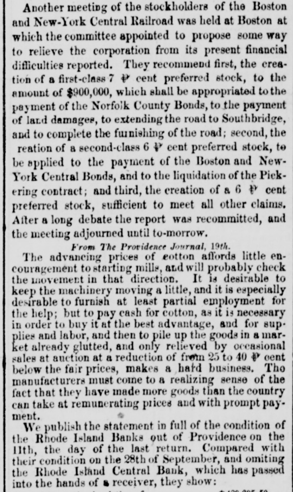 Another meeting of the stockholders of the Boston and New-York Central Railroad was held at Boston at which the committee appointed to propose some way to relieve the corporation from its present financial difficulties reported. They recommend first, the creation of a first-class 7 P cent preferred stock, to the amount of $900,000, which shall be appropriated to the payment of the Norfolk County Bonds, to the payment of land damages, to extending the road to Southbridge, and to complete the furnishing of the road; second, the reation of a second-class 6 P cent preferred stock, to be applied to the payment of the Boston and NewYork Central Bonds, and to the liquidation of the Pickering contract; and third, the creation of a 6 P cent preferred stock, sufficient to meet all other claims. After a long debate the report was recommitted, and the meeting adjourned until to-morrow. From The Providence Journal, 19th. The advancing prices of eotton affords little encouragement to starting mills, and will probably check the movement in that direction. It is desirable to keep the machinery moving a little, and it is especially desirable to furnish at least partial employment for the help; but to pay cash for cotton, as it is necessary in order to buy it at the best advantage, and for supplies and labor, and then to pile up the goods in a market already glutted, and only relieved by occasional sales at auction at a reduction of from 25 to 40 P cent below the fair prices, makes a hard business. The manufacturers must come to a realizing sense of the fact that they have made more goods than the country can take at remunerating prices and with prompt payment. We publish the statement in full of the condition of the Rhode Island Banks out of Providence on the 11th, the day of the last return. Compared with their condition on the 28th of September, and omiting the Rhode Island Central Bank, which has passed into the hands of & receiver, they show: