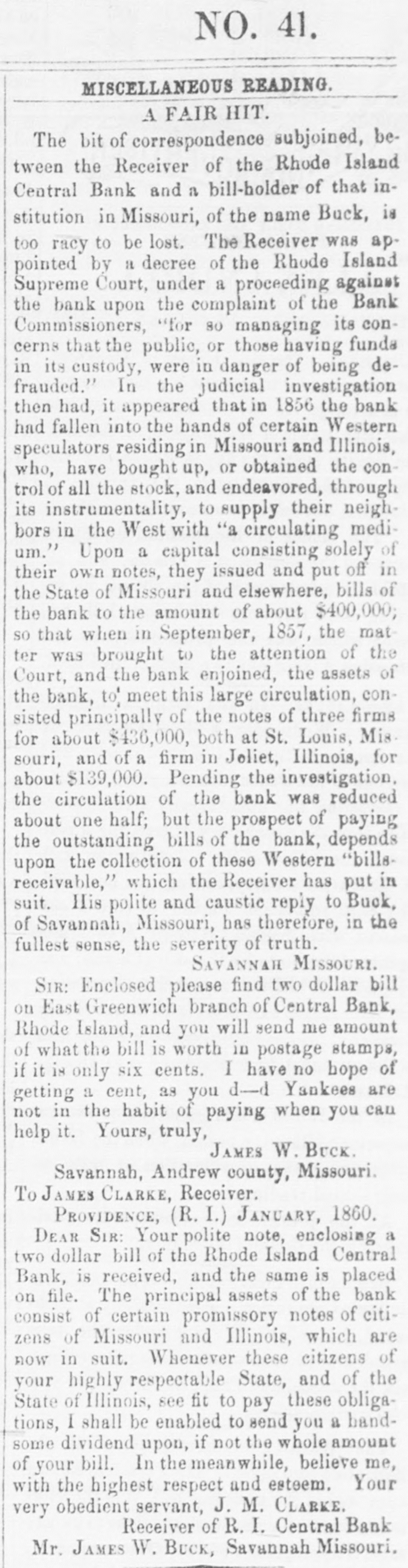 NO. 41, MISCELLANEOUS READING. A FAIR HIT. The bit of correspondence subjoined, between the Receiver of the Rhode Island Central Bank and a bill-holder of that institution in Missouri, of the name Buck, is too racy to be lost. The Receiver was ap. pointed by a decree of the Rhode Island Supreme Court, under a proceeding against the bank upon the complaint of the Bank Commissioners, "for 80 managing its concerns that the public, or those having funda in its custody, were in danger of being defrauded." In the judicial investigation then had, it appeared that in 1856 the bank had fallen into the hands of certain Western speculators residing in Missouri and Illinois, who, have bought up, or obtained the control of all the stock, and endeavored, through its instrumentality, to supply their neighbors in the West with "a circulating medium." Upon a capital consisting solely of their own notes, they issued and put off in the State of Missouri and elsewhere, bills of the bank to the amount of about $400,000; SO that when in September, 1857, the mat ter was brought to the attention of the Court, and the bank enjoined, the assets of the bank, to meet this large circulation, consisted principally of the notes of three firms for about $436,000, both at St. Louis, Mis souri, and of a firm in Joliet, Illinois, for about $139,000. Pending the investigation, the circulation of the bank was reduced about one half; but the prospect of paying the outstanding bills of the bank, depends upon the collection of these Western "billsreceivable," which the Receiver has put in suit. His polite and caustic reply to Buck, of Savannah, Missouri, has therefore, in the fullest sense, the severity of truth. SAVANNAH MISSOURI. SIR: Enclosed please find two dollar bill on East Greenwich branch of Central Bank, Rhode Island, and you will send me amount of what the bill is worth in postage stamps, if it is only six cents. I have no hope of getting a cent, as you d-d Yankees are not in the habit of paying when you can help it. Yours, truly, JAMES W. Buck. Savannah, Andrew county, Missouri. To JAMES CLARKE, Receiver. PROVIDENCE, (R.I.) JANUARY, 1860. DEAR SIR: Your polite note, enclosing a two dollar bill of the Rhode Island Central Bank, is received, and the same is placed on file. The principal assets of the bank consist of certain promissory notes of citizens of Missouri and Illinois, which are now in suit. Whenever these citizens of your highly respectable State, and of the State of Illinois, see fit to pay these obligations, I shall be enabled to send you a handsome dividend upon, if not the whole amount of your bill. In the meanwhile, believe me, with the highest respect and esteem. Your very obedient servant, J. M. CLARKE. Receiver of R. I. Central Bank Mr. JAMES W. Buck, Savannah Missouri.