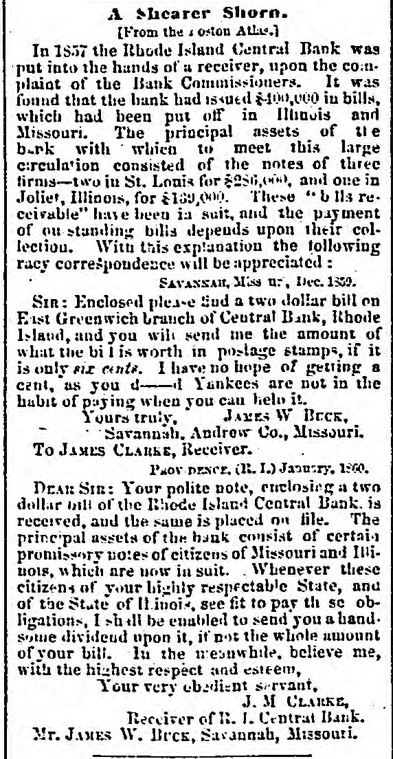 A Shearer Shorn. [From the 1 oston Atlas.) In 1857 the Rhode Island Central Bank was put into the hands of :1 receiver, upon the complaint of the Bank Commissioners. It was found that the bank had issued $400,000 in bills, which had been put off in Illinois and Missouri. The principal assets of 11 e bark with which to meet this large circulation consisted of the notes of three firms-two in St. Louis for $250,000, and one in Joliet, Illinois, for $189,000. These & 113 receivable" has been in suit, and the payment of on standing bills depends upon their collection. With this explanation the following racy correspondence will be appreciated : SAVANSAH, Miss u:, Dec. 1859. SIR: Enclosed please End a two dollar bill on East Greenwich branch of Central Bank, Rhode Island, and you will send me the amount of what the bi 1 is worth in postage stamps, if it is only FLI cents. I have no hope of getting a cent, as you Yankees are not in the habit of paying when you can helo it. JAMES W Beck. Yours truly. Savannah. Andrew Co., Missouri. To JAMES CLARKE, Receiver. Prov DENCE. (R. I.) January. 1860. DEAR Sm: Your polite note, enclosing a two dollar onli of the Rhode Island Central Bank. is received, and the same is placed 011 file. The principal assets of the hank consist of certain promissory notes of citizens of Missouri and IIIInois, which are now in suit. Whenever these citizens of your bighly respectable State, and of the State of ILinois, see fit to pay th se obligations, I sh ill be enabled to send you a hand. some dividend upon it, if not the whole amount of your bill. In the meanwhile, believe me, with the highest respect and esteem, Your very obsdient servant, J. M CLARKE, Receiver of R. I. Central Bank. Mr. JAMES W. Bros, Savannah, Missouri.