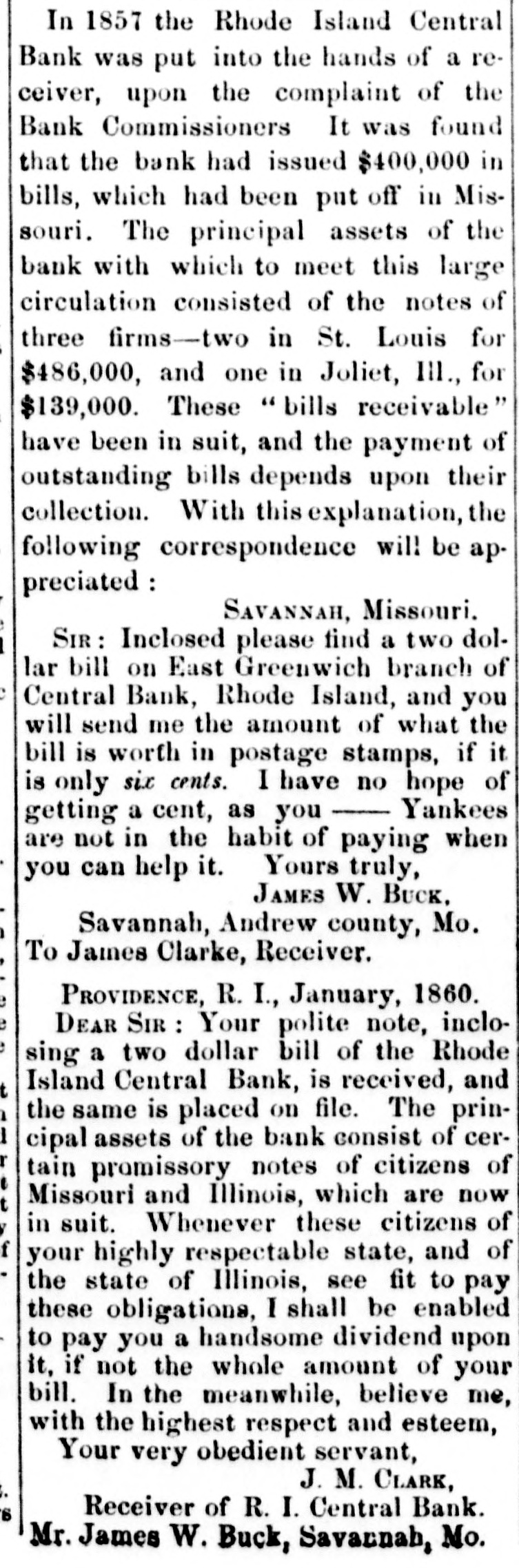 In 1857 the Rhode Island Central Bank was put into the hands of a receiver, upon the complaint of the Bank Commissioners It was found that the bank had issued $400,000 in bills, which had been put off in Missouri. The principal assets of the bank with which to meet this large circulation consisted of the notes of three firms-two in St. Louis for $486,000, and one in Joliet, IiI., for $139,000. These "bills receivable" have been in suit, and the payment of outstanding bills depends upon their collection. With this explanation, the following correspondence will be ap. preciated : SAVANNAH, Missouri. SIR: Inclosed please find a two dollar bill on East Greenwich branch of Central Bank, Rhode Island, and you will send me the amount of what the bill is worth in postage stamps, if it is only six cents. I have no hope of Yankees getting a cent, as you are not in the habit of paying when you can help it. Yours truly, JAMES W. BUCK. Savannah, Andrew county, Mo. To James Clarke, Receiver. PROVIDENCE, R. I., January, 1860. DEAR SIR : Your polite note, inclosing a two dollar bill of the Rhode Island Central Bank, is received, and the same is placed on file. The principal assets of the bank consist of certain promissory notes of citizens of Missouri and Illinois, which are now in suit. Whenever these citizens of your highly respectable state, and of the state of Illinois, see fit to pay these obligations, I shall be enabled to pay you a handsome dividend upon it, if not the whole amount of your bill. In the meanwhile, believe me, with the highest respect and esteem, Your very obedient servant, J. M. CLARK, Receiver of R. I. Central Bank. 6 Mr. James W. Buck, Savannah, Mo.