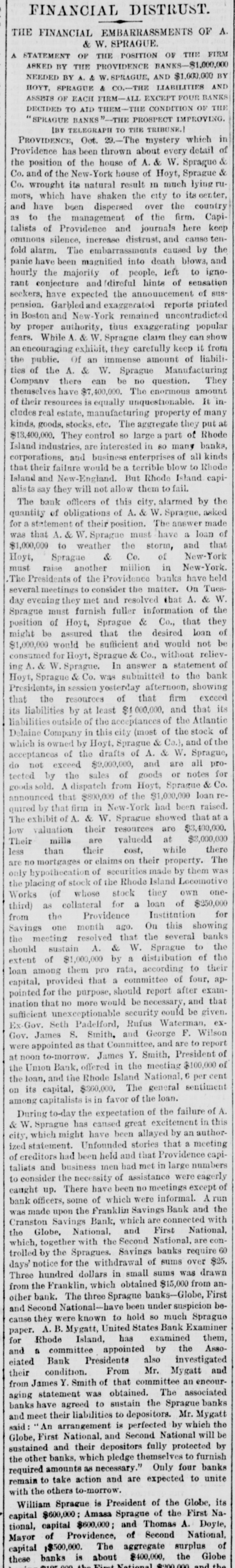 FINANCIAL DISTRUST. THE FINANCIAL EMBARRASSMENTS OF A. & W. SPRAGUE. A STATEMENT OF THE POSITION OF THE FIRM ARKED BY THE PROVIDENCE BANKS-$1,000,000 NEEDED BY A. & .SPRAGUE, AND $1,000,000 BY HOYT, SPRAGUE & CO.-THE LIABILITIES AND ASSETS OF EACH FIRM-ALL EXCEPT FOUR BANKS DECIDED TO AID THEM-T CONDITION OF THE 'SPRAGUE BANKS "--THE PROSPECT IMPROVING. LBY TELEGRAPH TO THE TRIBUNE. PROVIDENCE, Oct. 29.-The mystery which in Providence has been thrown about every detail of the position of the house of A. & W. Sprague Co. and of the New-York house of Hoyt, Sprague Co. wrought its natural result in much lying ru mors, which have shaken the city to its center, and have been dispersed over the country as to the management of the firm. Capitalists of Providence and journals here keep ominous silence, increase distrust, and cause tenfold alarm. The embarrassments caused by the panic have been magnified into death blows, and hourly the majority of people, left to ignorant conjecture and !direful hints of sensation seekers, have expected the announcement of suspension. Garbled and exaggerated reports printed in Boston and New-York remained uncontradicted by proper authority, thus exaggerating popular fears. While A. & W. Spragne claim they can show an encouraging exhibit, they carefully keep it from the public. Of an immense amount of liabilities of the A. & W. Sprague Manufacturing Company there can be no question. They themselves have $7,400,000. The enormous amount of their resources is equally unquestionable. It includes real estate, manufacturing property of many kinds, goods, stocks. etc. The aggregate they put at $13,400,000. They control 80 large a part of Rhode Island industries, are interested in 80 many banks, corporations, and business enterprises of all kinds that their failure would be a terrible blow to Rhode Island and New-England. But Rhode Island capialista say they will not allow them to fail. The bank officers of this city, alarmed by the quantity of obligations of A. & W. Sprague, asked for a statement of their position. The answer made was that A. & W. Sprague must have a loan of $1,000,000 to weather the storm, and that Hoyt, Sprague & Co. of New-York must raise another million in New-York. The Presidents of the Providence banks have held several meetings to consider the matter. On Tues day evening they met and resolved that A. & W. Sprague must furnish fuller information of the position of Hoyt, Sprague & Co., that they might be assured that the desired loan of $1,000,000 would be sufficient and would not be consumed for Hoyt, Sprague & Co., without relieving A. & W. Sprague. In answer a statement of Hoyt, Sprague & Co. was submitted to the bank Presidents, in session yesterday afternoon, showing that the resources of that firm exceed its liabilities by at least $4 000,000. and that its liabilities outside of the acceptances of the Atlantic Delaine Company in this city (most of the stock of which is owned by Hoyt, Sprague & Co.), and of the acceptances of the drafts of A. & W. Sprague, do not exceed $9,000,000, and are all protected by the sales of goods or notes for goods sold. A dispatch from Hoyt, Sprague & Co. announced that $800,000 of the $1,000,000 loan that firm in New-York of A. & W. Sprague quired The exhibit by had showed been $3,400,000. that raised. at their resources are mills are valuedd at their cost, less low Their valuation than while $3,000,000 there The mortgages or claims on their property. of securities made of stock of the Rhode Island are the only placing no hypothecation by Locomotive own them one- was Works (of whose stock they third) as collateral for a loan of $250,000 for from the Providence Institution Savings one month ago. On this showing banks the meeting resolved that the several sustain A. & W. Sprague to the extent should of $1,000,000 by a distribution of their the loan among them pro rata, according to capital. provided that a committee of four, appointed for the purpose, should report after exam- that ination that no more would be necessary, and sufficient unexceptionable security could be given. exEx-Gov. Seth Padelford, Rufus Waterman, James S. Smith, and George F. Wilson Gov. appointed as that Committee, and are to report were noon to-morrow. James Y. Smith, President of at the Union Bank, offered in the meeting $100,000 cent of the loan, and the Rhode Island National, 6 per on its capital, $360,000. The general sentiment among capitalista is in favor of the loan. During to-day the expectation of the failure of A. & W. Sprague has cansed great excitement in this city, which might have been allayed by an authorized statement. Unfounded stories that a meeting of creditors had been held and that Providence capitalists and business men had met in large numbers to consider the necessity of assistance were eagerly caught up. There have been no meetings except of bank officers, some of which were informal. A run the made upon the Franklin Savings Bank and with Cranston Savings Bank, which are connected National, the Globe, National, and First which, together with the Second National, are controlled by the Spragues. Savings banks require 60 days' notice for the withdrawal of sums over $25. Three hundred dollars in small sums was drawn from the Franklin, which obtained $15,000 from another bank. The three Sprague banks-Globe, First National-have been under cause were known to hold so Mygatt, United States paper. and Second they A.B. examined Bank much suspicion Examiner Sprague them, beRhode Island, has and for a committee appointed by the Assoeiated Bank Presidente also investigated and condition. From Mr. Mygatt from their James Y. Smith of that committee an encourstatement was obtained. The associated aging banks have agreed to sustain the Sprague banks and meet their liabilities to depositors. Mr. Mygatt said: An arrangement is perfected by which the Globe, First National, and Second National will be sustained and their depositors fully