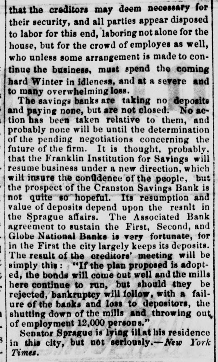 that the creditors may deem necessary for their security, and all parties appear disposed to labor for this end, laboring not alone for the house, but for the crowd of employes as well, who unless some arrangement is made to continue the business, must spend the coming hard Winter in idleness, and at a severe and to many overwhelming loss. The savings banks are taking no deposits and paying none, but are not closed. No action has been taken relative to them, and probably none will be until the determination of the pending negotiations concerning the future of the firm. It is thought, probably, that the Franklin Institution for Savings will resume business under a new direction, which will insure the confidence of the people, but the prospect of the Cranston Savings Bank is not quite so hopeful. Its resumption and value of deposits depend upon the result in the Sprague affairs. The Associated Bank agreement to sustain the First, Second, and Globe National Banks is very fortunate, for in the First the city largely keeps its deposits. The result of the creditors' meeting will be simply this: "If the plan proposed is adopted, the bonds will come out well and the mills here continue to run, but should they be rejected, bankruptcy will follow, with a failure of the banks and loss to depositors, the shutting down of the mills and throwing out of employment 12,000 persons." Senator Sprague is lying ill at his residence in this city, but not seriously. - New York Times.