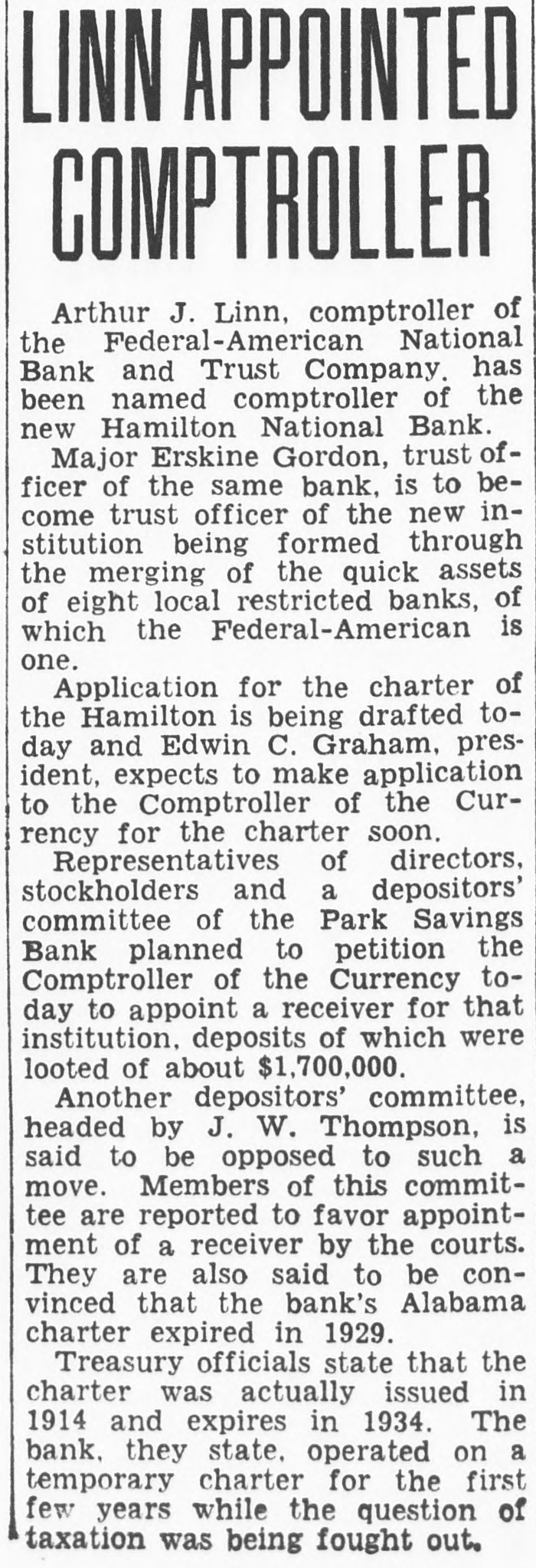 LINN APPOINTED COMPTROLLER Arthur J. Linn, comptroller of the Federal-American National Bank and Trust Company. has been named comptroller of the new Hamilton National Bank. Major Erskine Gordon, trust officer of the same bank, is to become trust officer of the new institution being formed through the merging of the quick assets of eight local restricted banks, of which the Federal-American is one. Application for the charter of the Hamilton is being drafted today and Edwin C. Graham, president, expects to make application to the Comptroller of the Currency for the charter soon. Representatives of directors, stockholders and a depositors' committee of the Park Savings Bank planned to petition the Comptroller of the Currency today to appoint a receiver for that institution. deposits of which were looted of about $1,700,000. Another depositors' committee, headed by J. W. Thompson, is said to be opposed to such a move. Members of this committee are reported to favor appointment of a receiver by the courts. They are also said to be convinced that the bank's Alabama charter expired in 1929. Treasury officials state that the charter was actually issued in 1914 and expires in 1934. The bank. they state, operated on a temporary charter for the first few years while the question of taxation was being fought out.