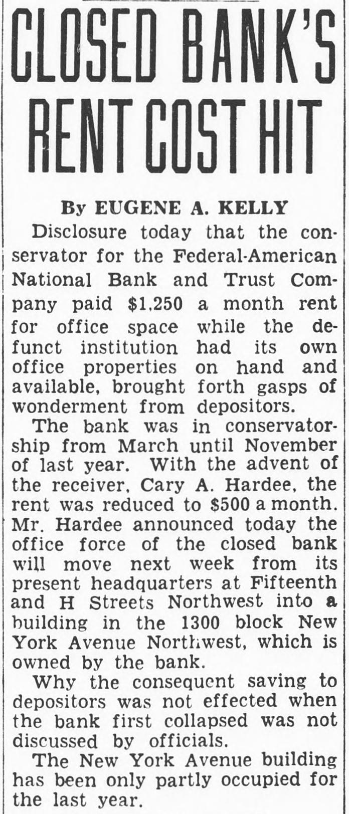 CLOSED BANK'S RENT COST HIT By EUGENE A. KELLY Disclosure today that the conservator for the Federal-American National Bank and Trust Company paid $1,250 a month rent for office space while the defunct institution had its own office properties on hand and available, brought forth gasps of wonderment from depositors. The bank was in conservatorship from March until November of last year. With the advent of the receiver, Cary A. Hardee, the rent was reduced to $500 a month. Mr. Hardee announced today the office force of the closed bank will move next week from its present headquarters at Fifteenth and H Streets Northwest into a building in the 1300 block New York Avenue Northwest, which is owned by the bank. Why the consequent saving to depositors was not effected when the bank first collapsed was not discussed by officials. The New York Avenue building has been only partly occupied for the last year.