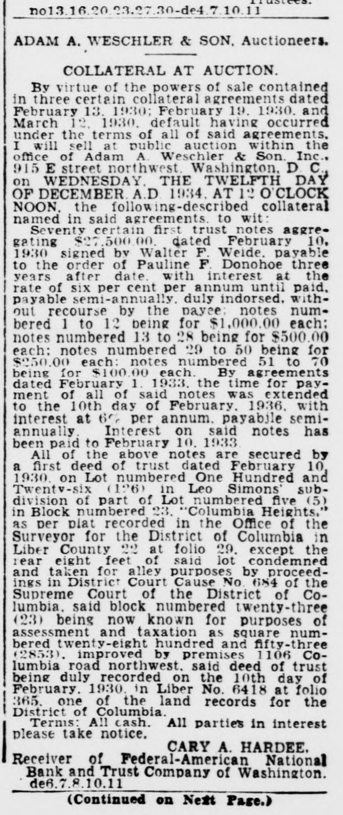 no13.16.20.23.27.30-de4.7.10.11 ADAM A. WESCHLER & SON. Auctioneers. COLLATERAL AT AUCTION. By virtue of the powers of sale contained in three certain collateral agreements dated February 13. 1930; February 19. 1930. and March 12. 1930. default having occurred under the terms of all of said agreements, I will sell at public auction within the office of Adam A Weschler & Son. Inc., 915 E street northwest. Washington, D C on WEDNESDAY, THE TWELFTH DAY OF DECEMBER A.D 1934 AT 12 O'CLOCK NOON. the following-described collateral named in said agreements. to wit: Seventy certain first trust notes aggregating $27,500.00 dated February 10. 1930 signed by Walter F. Weide. payable to the order of Pauline F Donohoe three years after date. with interest at the rate of six per cent per annum until paid. payable semi-annually. duly indorsed, without recourse by the payee: notes numbered 1 to 12 being for $1,000.00 each: notes numbered 13 to 28 being for $500.00 each; notes numbered 29 to 50 being for $250.00 each: notes numbered 51 to 70 being for $100.00 each. By agreements dated February 1. 1933. the time for payment of all of said notes was extended to the 10th day of February. 1936. with interest at 6% per annum. payabile semiannually Interest on said notes has been paid to February 10. 1933 All of the above notes are secured by a first deed of trust dated February 10, 1930 on Lot numbered One Hundred and Twentv-six (126) in Leo Simons subdivision of part of Lot numbered five (5) in Block numbered 23. "Columbia Heights." as per plat recorded in the Office of the Surveyor for the District of Columbia in Liber County 20 at folio 29 except the year eight feet of said lot condemned and taken for alley purposes by proceedings in District Court Cause No. 684 of the Supreme Court of the District of Columbia, said block numbered twenty-three (23) being now known for purposes of assessment and taxation as square numbered twenty-eight hundred and fifty-three (2853), improved by premises 1106 Columbia road northwest. said deed of trust being duly recorded on the 10th day of February. 1930. in Liber No. 6418 at folio 365, one of the land records for the District of Columbia Terms: All cash. All parties in interest please take notice. CARY A. HARDEE. Receiver of Federal-American National Bank and Trust Company of Washington. de6.7.8.10.11 (Continued on Next Page.)