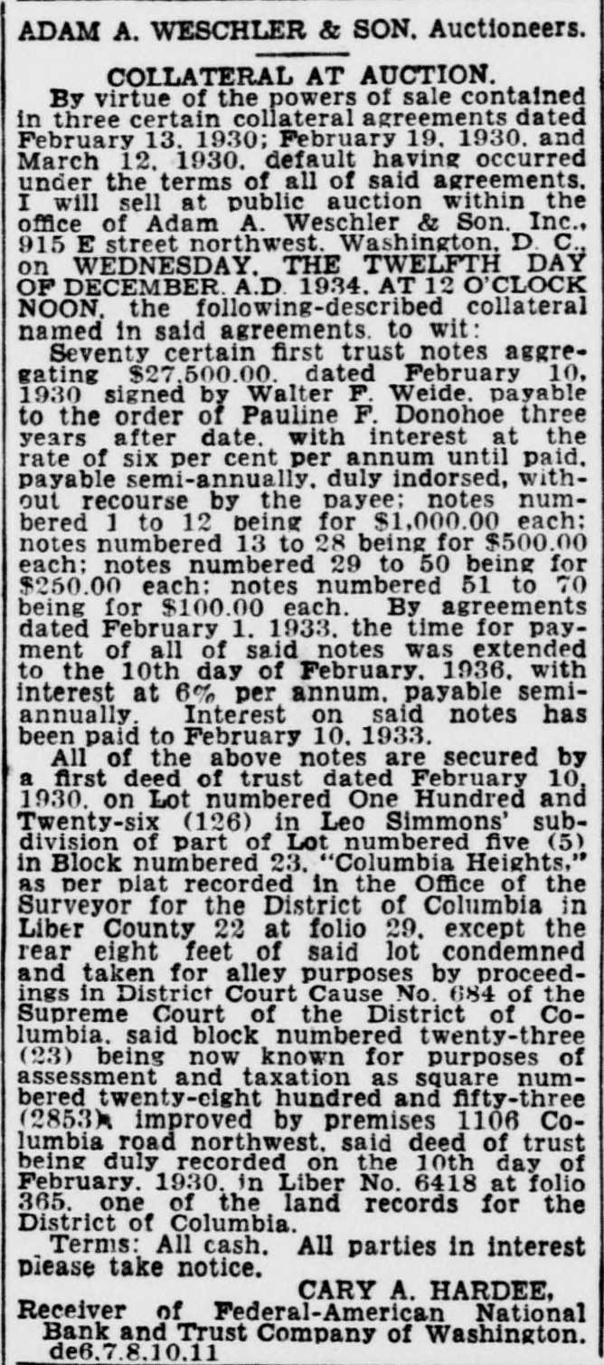 ADAM A. WESCHLER & SON. Auctioneers. COLLATERAL AT AUCTION. By virtue of the powers of sale contained in three certain collateral agreements dated February 13. 1930; February 19, 1930. and March 12. 1930. default having occurred under the terms of all of said agreements. I will sell at public auction within the office of Adam A. Weschler & Son. Inc., 915 E street northwest. Washington, D. C. on WEDNESDAY. THE TWELFTH DAY OF DECEMBER. A.D. 1934. AT 12 O'CLOCK NOON. the following-described collateral named in said agreements. to wit: Seventy certain first trust notes aggregating $27,500.00. dated February 10, 1930 signed by Walter F. Weide. payable to the order of Pauline F. Donohoe three years after date. with interest at the rate of six per cent per annum until paid. payable semi-annually. duly indorsed, without recourse by the payee; notes numbered 1 to 12 being for $1,000.00 each: notes numbered 13 to 28 being for $500.00 each; notes numbered 29 to 50 being for $250.00 each: notes numbered 51 to 70 being for $100.00 each. By agreements dated February 1. 1933. the time for payment of all of said notes was extended to the 10th day of February. 1936, with interest at 6% per annum. payable semiannually Interest on said notes has been paid to February 10. 1933. All of the above notes are secured by a first deed of trust dated February 10, 1930. on Lot numbered One Hundred and Twenty-six (126) in Leo Simmons' subdivision of part of Lot numbered five (5) in Block numbered 23. "Columbia Heights," as per plat recorded in the Office of the Surveyor for the District of Columbia in Liber County 22 at folio 29. except the rear eight feet of said lot condemned and taken for alley purposes by proceedings in District Court Cause No. 684 of the Supreme Court of the District of Columbia, said block numbered twenty-three (23) being now known for purposes of assessment and taxation as square numbered twenty-eight hundred and fifty-three (2853) improved by premises 1106 Columbia road northwest. said deed of trust being duly recorded on the 10th day of February. 1930. in Liber No. 6418 at folio 365. one of the land records for the District of Columbia. Terms: All cash. All parties in interest please take notice. CARY A. HARDEE. Receiver of Federal-American National Bank and Trust Company of Washington. de6.7.8.10.11