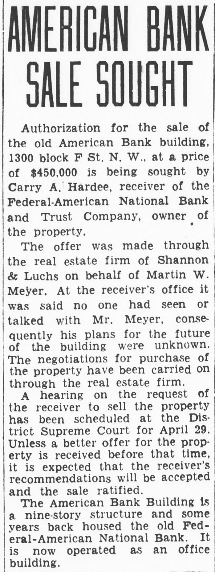 # AMERICAN BANK # SALE SOUGHT Authorization for the sale of the old American Bank building, 1300 block F St. N. W., at a price of $450,000 is being sought by Carry A. Hardee, receiver of the Federal-American National Bank and Trust Company, owner of the property. The offer was made through the real estate firm of Shannon & Luchs on behalf of Martin W. Meyer. At the receiver's office it was said no one had seen or talked with Mr. Meyer, consequently his plans for the future of the building were unknown. The negotiations for purchase of the property have been carried on through the real estate firm. A hearing on the request of the receiver to sell the property has been scheduled at the District Supreme Court for April 29. Unless a better offer for the property is received before that time, it is expected that the receiver's recommendations will be accepted and the sale ratified. The American Bank Building is a nine-story structure and some years back housed the old Federal-American National Bank. It is now operated as an office building.