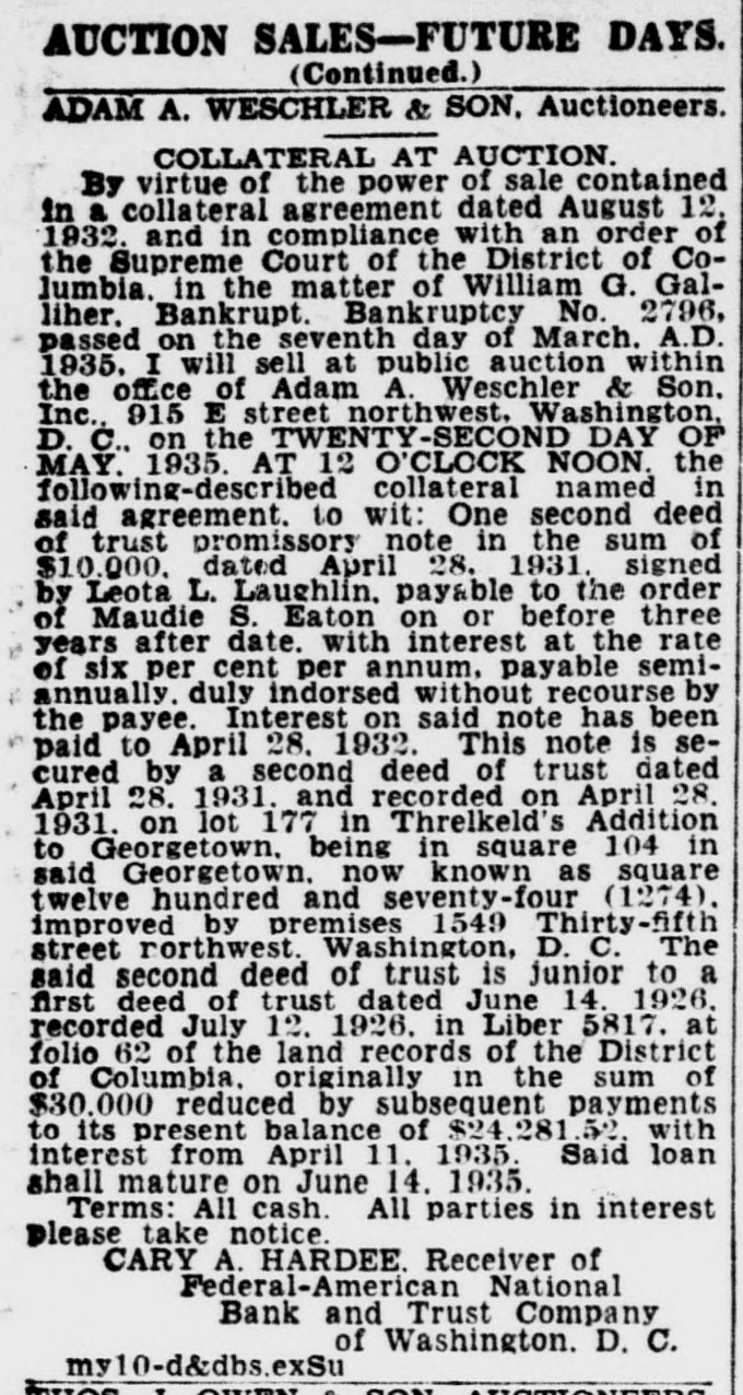 AUCTION SALES-FUTURE DAYS. (Continued.) ADAM A. WESCHLER & SON. Auctioneers. COLLATERAL AT AUCTION. By virtue of the power of sale contained in a collateral agreement dated August 12. 1932. and in compliance with an order of the Supreme Court of the District of Columbia. in the matter of William G. Galliher. Bankrupt. Bankruptcy No. 2796, passed on the seventh day of March. A.D. 1935. I will sell at public auction within the office of Adam A. Weschler & Son. Inc., 915 E street northwest. Washington, D. C., on the TWENTY-SECOND DAY OF MAY. 1935. AT 12 O'CLOCK NOON. the following-described collateral named in said agreement. to wit: One second deed of trust promissory note in the sum of $10.000, dated April 28. 1931. signed by Leota L. Laughlin. payable to the order of Maudie S. Eaton on or before three years after date. with interest at the rate of six per cent per annum, payable semiannually. duly indorsed without recourse by the payee. Interest on said note has been paid to April 28. 1932. This note is secured by a second deed of trust dated April 28. 1931. and recorded on April 28. 1931. on lot 177 in Threlkeld's Addition to Georgetown, being in square 104 in said Georgetown. now known as square twelve hundred and seventy-four (1274), improved by premises 1549 Thirty-fifth street northwest. Washington, D. C. The said second deed of trust is junior to a first deed of trust dated June 14. 1926, recorded July 12. 1926. in Liber 5817. at folio 62 of the land records of the District of Columbia. originally in the sum of $30.000 reduced by subsequent payments to its present balance of $24,281.52. with interest from April 11. 1935. Said loan shall mature on June 14. 1935. Terms: All cash. All parties in interest please take notice. CARY A. HARDEE. Receiver of Federal-American National Bank and Trust Company of Washington. D. C. my10-d&dbs.exSu