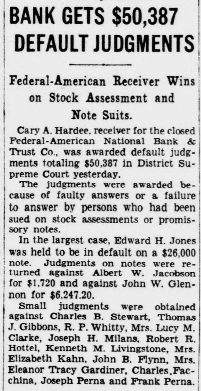 BANK GETS $50,387 DEFAULT JUDGMENTS Federal-American Receiver Wins on Stock Assessment and Note Suits. Cary A. Hardee, receiver for the closed Federal-American National Bank & Trust Co., was awarded default judgments totaling $50,387 in District Supreme Court yesterday. The judgments were awarded because of faulty answers or a failure to answer by persons who had been sued on stock assessments or promissory notes. In the largest case, Edward H. Jones was held to be in default on a $26,000 note. Judgments on notes were returned against Albert W. Jacobson for $1,720 and against John W. Glennon for $6,247.20. Small judgments were obtained against Charles B. Stewart, Thomas J. Gibbons, R. P. Whitty, Mrs. Lucy M. Clarke, Joseph H. Milans, Robert R. Hottel, Kenneth M. Livingstone, Mrs. Elizabeth Kahn, John B. Flynn, Mrs. Eleanor Tracy Gardiner, Charles, Facchina, Joseph Perna and Frank Perna.