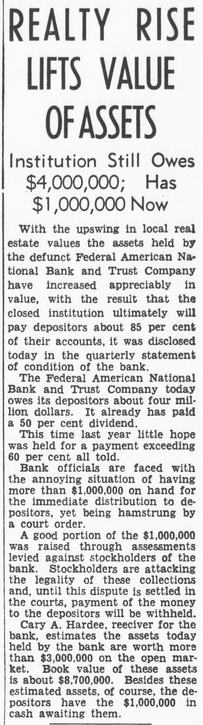 REALTY RISE LIFTS VALUE OF ASSETS Institution Still Owes $4,000,000; Has $1,000,000 Now With the upswing in local real estate values the assets held by the defunct Federal American Na. tional Bank and Trust Company have increased appreciably in value, with the result that the closed institution ultimately will pay depositors about 85 per cent of their accounts, it was disclosed today in the quarterly statement of condition of the bank. The Federal American National Bank and Trust Company today owes its depositors about four million dollars. It already has paid a 50 per cent dividend. This time last year little hope was held for a payment exceeding 60 per cent all told. Bank officials are faced with the annoying situation of having more than $1,000,000 on hand for the immediate distribution to depositors, yet being hamstrung by a court order. A good portion of the $1,000,000 was raised through assessments levied against stockholders of the bank. Stockholders are attacking the legality of these collections and, until this dispute is settled in the courts, payment of the money to the depositors will be withheld. Cary A. Hardee, reeciver for the bank, estimates the assets today held by the bank are worth more than $3,000,000 on the open market. Book value of these assets is about $8,700,000. Besides these estimated assets, of course, the depositors have the $1,000,000 in cash awaiting them.