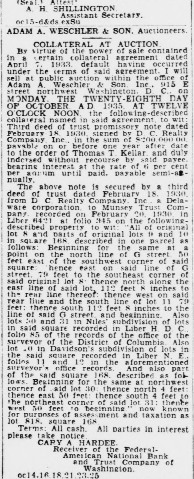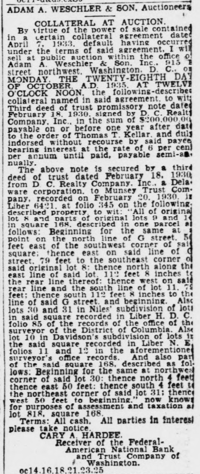 ADAM A. WESCHLER & SON. Auctioneers COLLATERAL AT AUCTION. By virtue of the power of sale contained in a certain collateral agreement dated April 7. 1933, default having occurred under the terms of said agreement. I will sell at public auction within the office of Adam A. Weschler & Son. Inc. 915 F street northwest. Washington. D. C., on MONDAY. THE TWENTY-EIGHTH DAY OF OCTOBER. A.D. 1935. AT TWELVP O'CLOCK NOON. the following-describes collateral named in said agreement. to wit: Third deed of trust promissory note dated February 18. 1930. signed by D. C. Realty Company. Inc., in the sum of $200,000.00 payable on or before one year after date to the order of Thomas T. Kellar. and duly indorsed without recourse by said payee bearing interest at the rate of 6 per cent per annum until paid, payable semi-a nually. The above note is secured by a third deed of trust dated February 18. 1930 from D C. Realty Company. Inc. a Dela. ware corporation. to Munsey Trust Com. pany, recorded on February 20. 1930. is Liber 6421. at folio 345 on the following. described property to wit: "All of original lot 8 and parts of original lots 9 and 14 in square 168. described in one parcel at follows: Beginning for the same at point on the north line of G street. 5 feet east of the southwest corner of sai a square; thence east on said line of street. 79 feet to the southeast corner of said original lot 8: thence north along the east line of said lot. 112 feet 8 inches to the rear line thereof: thence west on said rear line and the south line of lot 11. 78 feet; thence south 112 feet 8 inches to the line of said G street. and beginning. Also lots 30 and 31 in Niles' subdivision of loti in said square recorded in Liber H. D. C. folio 85 of the records of the office of the surveyor of the District of Columbia. Alse lot 10 in Davidson's subdivision of lots in the said square recorded in Liber N. E. folios 11 and 12 in the aforementione surveyor's office records. And also part of the said square 168, described as fol. lows: Beginning for the same at northwest corner of said lot 30: thence north 4 feet thence east 50 feet: thence south 4 feet to the northeast corner of said lot 31; thence west 50 feet to beginning." now known for purposes of assessment and taxation al lot 818. square 168. Terms: All cash. All parties in interest please take notice. CARY A. HARDEE. Receiver of the FederalAmerican National Bank and Trust Company of Washington. 16.18.21.23.25