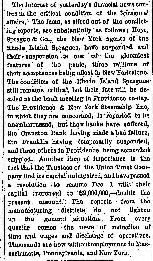 The interest of yesterday's financial nows contrea in the critical condition of tho Spragues' affairs. The facts, as sifted out of the conflicting reports, are substantially as follows: Hoyt, Spraguo & Co., the : Now York agents of the Rhode Island Spragues, have suspended, and their . suspension is one of the gloomiest features of the panic, three millions of their acceptances being afloat in New Yorkalone. The condition of the Rhode Island Spragues still remains critical, but their fato will bo docided at the bank meeting in Providence to-day. The Providence & New York Steamship line, in which they are concerned, is reported to be unembarrassed, but their banks have suffered, the Cranston Bank having made a bad failure, the Franklin having temporarily suspended, and three others in Providence being Bomowhat crippled. Another item of importance is the fact that the Trustees of the Union Trust Company find its capital unimpaired, and have passed resolution to resumo Dec. 1 with their a capital increased to $2,000,000,-doublo tho present amount.' The reports . from the manufacturing districts do not lighten up the general situation. From overy quarter coines the news of reduction of timo and wages and discharge of operatives. Thousands are now without employment in Massachusetts, Pennsylvania, and Now York.