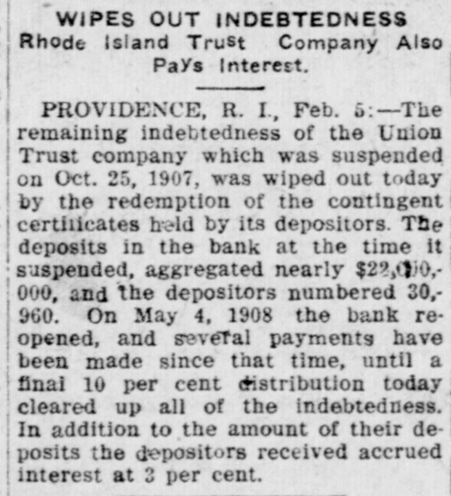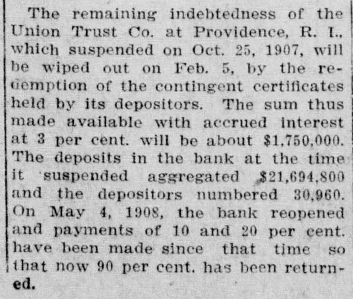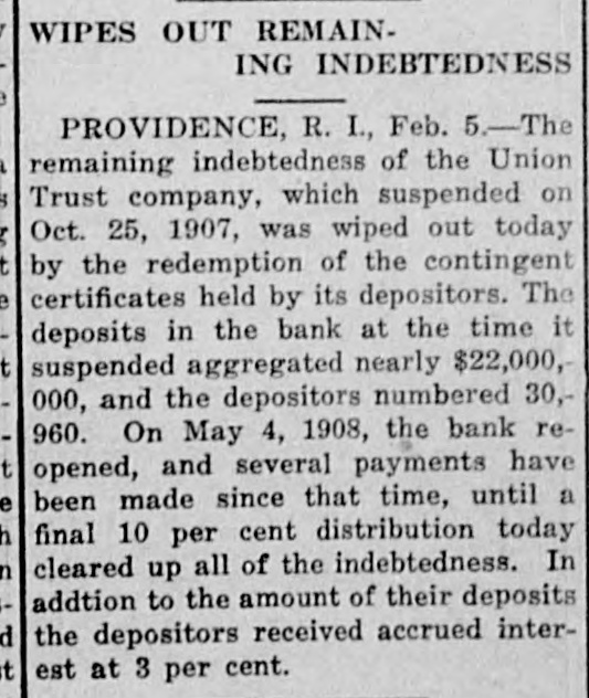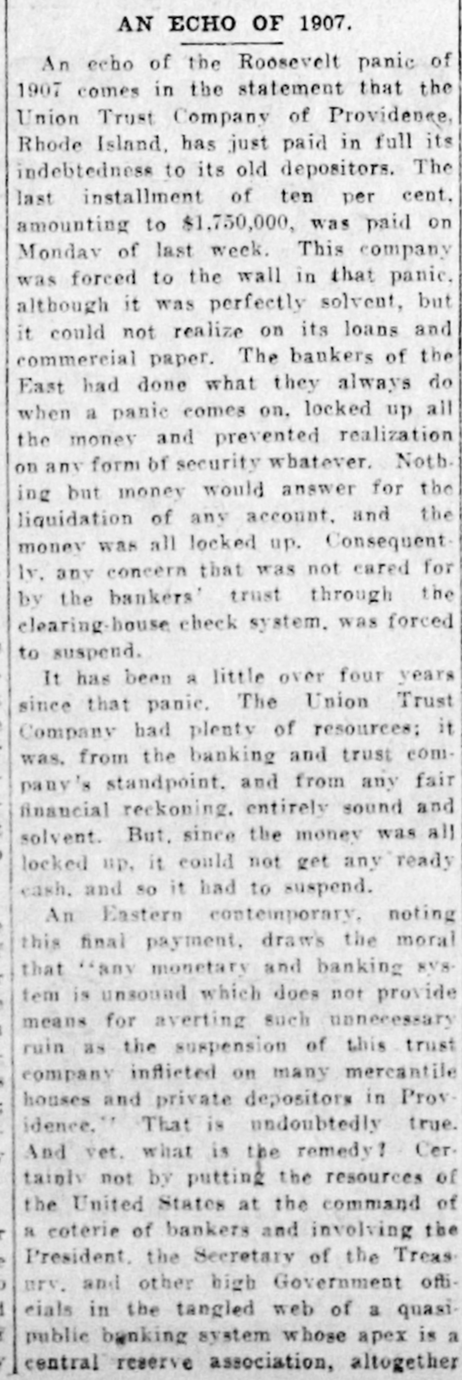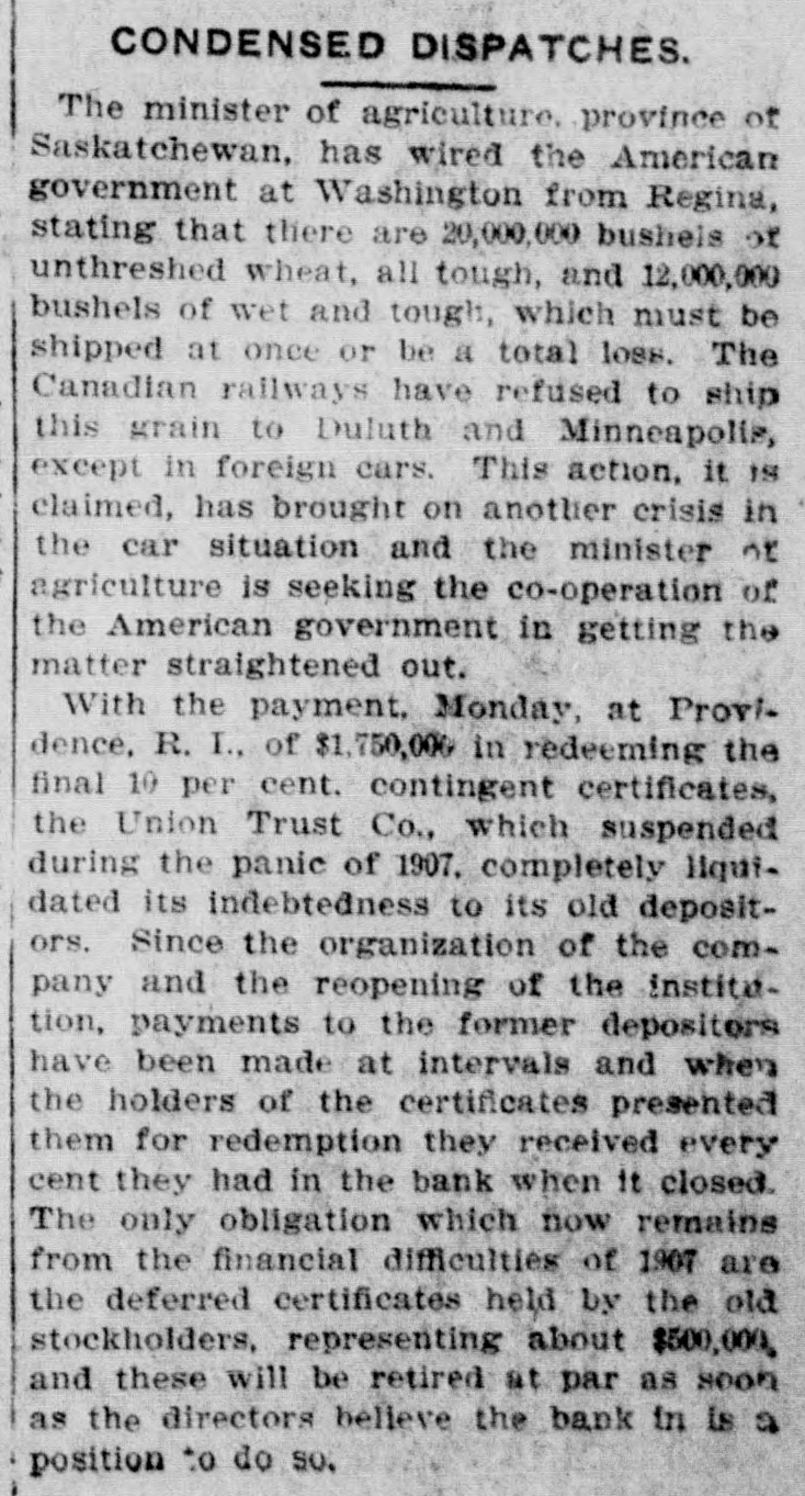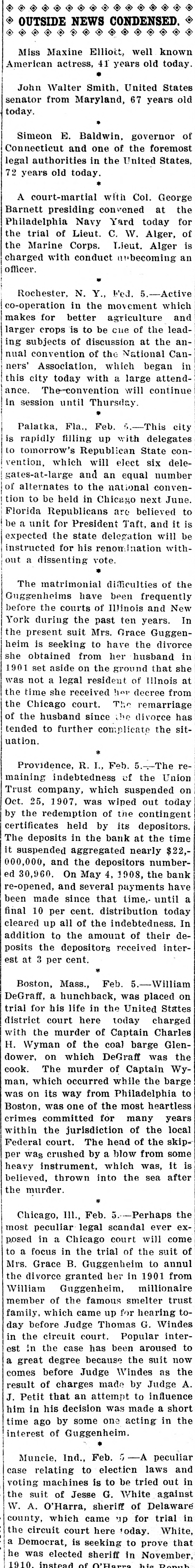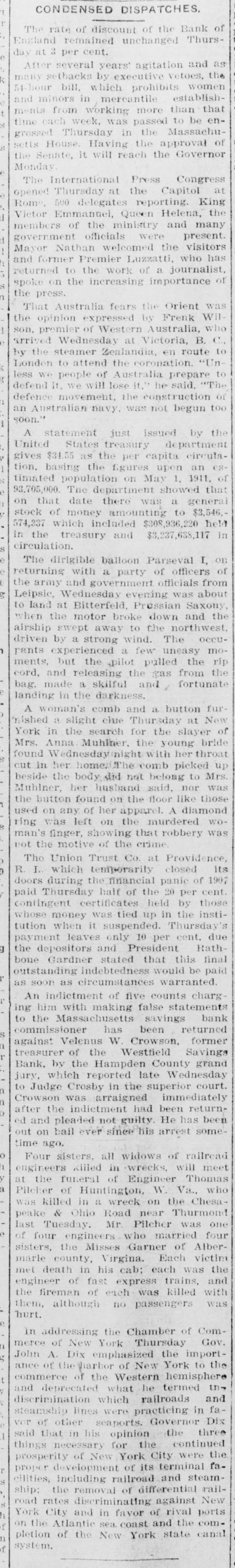The rate of discount of the Bank of remained unchanged Thursat 3 per cent. fter several years' agitation and as setbacks by executive vetoes, the bill, which prohibits women minors in mercantile establishfrom working more than that each week, was passed to be enThursday in the MassachuHouse. Having the approval of Senate, it will reach the Governor The International Press Congress Thursday at the Capitol at 500 delegates reporting. King Emmanuel, Queen Helena, the mbers of the ministry and many verment officials were present. Nathan welcomed the visitors former Premier Luzzatti, who has urned to the work of a journalist, on the increasing importance of press. "hat Australia fears the Orient was opinion expressed by Frenk Wilpremier of Western Australia, who Wednesday at Victoria, B. C., the steamer Zealandia, en route to to attend the coronation. "Unwe people of Australia prepare to It, we will lose it," he said. "The movement, the construction of Australian navy. was not begun too statement just issued by the States treasury department $34.55 as the per capita circulabasing the figures upon an espopulation on May 1, 1911. of 705,000. The department showed that that date there was a general of money amounting to $3,546.which included $308,936,220 held the treasury and $3,237,688,117 in culation. The dirigible balloon Parseval I, on urning with a party of officers of army and government officials from ipsic, Wednesday evening was about land at Bitterfeld, Pressian Saxony, the motor broke down and the swept away to the northwest, by a strong wind. The occuexperienced a few uneasy mobut the pilot pulled the rip and releasing the gas from the made a skilful and / fortunate in the darkness. woman's comb and a button fura slight clue Thursday at New in the search for the slayer of Anna Muhlner, the young bride Wednesday night with her throat in her homes The comb picked up the body did not belong to Mrs. ihlner, her husband said. nor was button found on the floor like those on any of her apparel. A diamond was left on the murdered wofinger, showing that robbery was the motive of the crime. The Union Trust Co. at Providence, I. which temporarily closed its during the financial panic of 1907 Thursday half of the 20 per cent. ntingent certificates held by those money was tied up in the instiwhen it suspended. Thursday's yment leaves only 10 per cent. due depositors and President RathGardner stated that this final tstanding indebtedness would be paid soon as circumstances warranted. indictment of five counts charghim with making false statements the Massachusetts savings bank mmissioner has been returned Velenus W. Crowson, former easurer of the Westfield Savings by the Hampden County grand which reported late Wednesday Judge Crosby in the superior court. owson was arraigned immediately the indictment had been returnand pleaded not guilty. He has been on bail ever since his arrest someago, Four sisters, all widows of railroad gineers killed in wrecks, will meet the funeral of Engineer Thomas of Huntington, W. Va., who killed in a wreck on the Chesa& Ohio Road near Thurmond