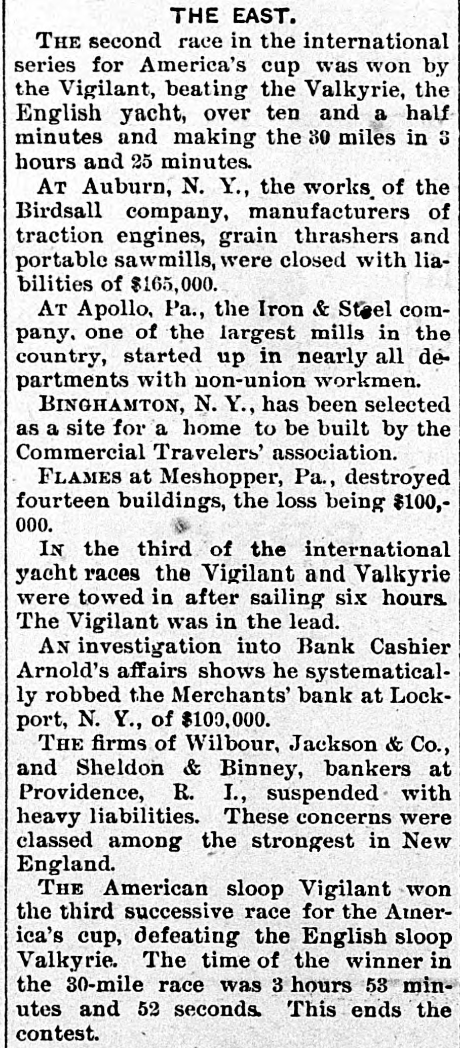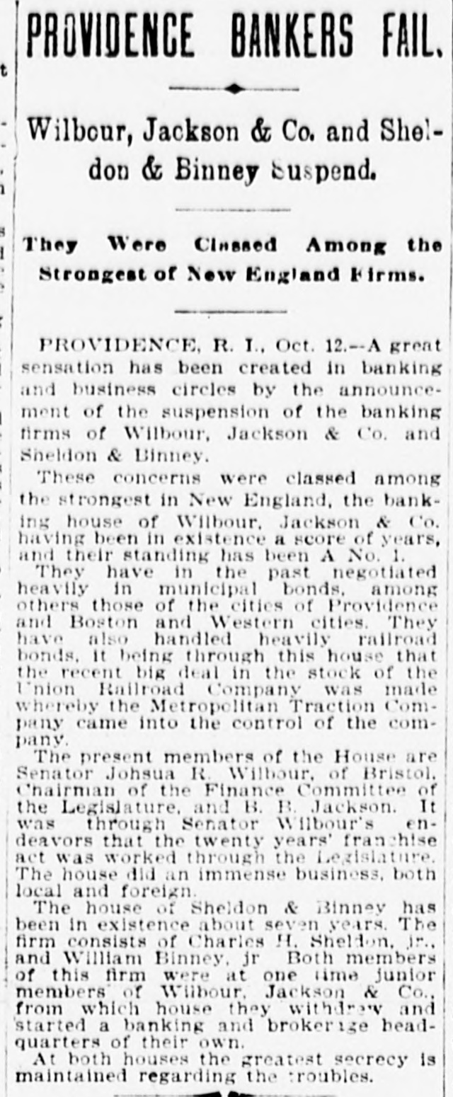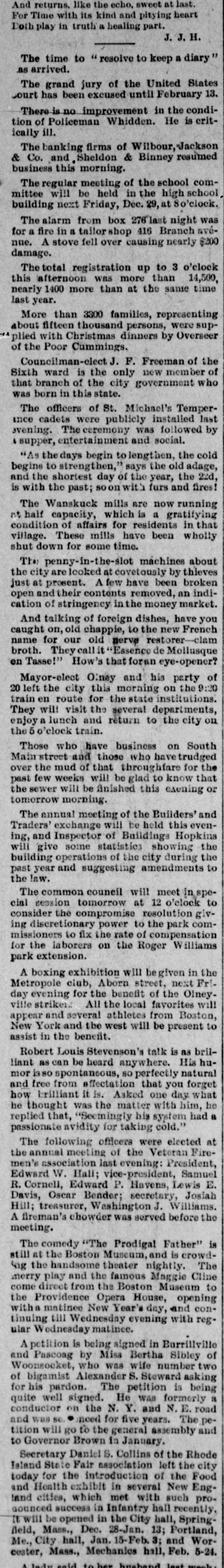 And returns. like the echo, sweet at last. For Time with its kind and pitying heart Doth play in truth a healing part. 'H 'f T The time to " resolve to keep a diary su The grand jury of the United States ourt has been excused until February 13. There is no improvement in the condition of Policeman Whidden. He is critTII itally The banking firms of Wilbour,Jackson & Co. and Sheldon & Binney resumed business this morning. The regular meeting of the school committee will be held in the high school building next Friday, Dec. 29, at So'elock. The alarm from box 276 last night was Branch 416 doqs tallor B up are B JOJ nue. A stove fell over causing nearly $200 damage. The total registration up to 3 o'clock this afternoon was more than 14,500, nearly 1400 more than at the same time last year. More than 3300 families, representing about fifteen thousand persons, were supplied with Christmas dinners by Overseer of the Poor Cummings. Councilman-elect J. F. Freeman of the Sixth ward is the only new member of that branch of the city government ho was born in this state. The officers of St. Michael's Temperince cadets were publicly installed last evening. The ceremony was followed by . supper, entertainment and social. "As the days begin to lengthen, the cold begins to strengthen," says the old adage, and the shortest day of the year, the 22d, is with the past; soon with furs and fires! The Wanskuck mills are now running nt half capacity, which is a gratifying condition of affairs for residents in that village. These mills have been wholly shut down for some time. The penny-in-the-slot máchines about the city are looked at covetously by thieves just at present. A few have been broken open and their contents removed, an indication of stringency in the money market. And talking of foreign dishes, have you caught on, old chappie, to the new French name for our old nerve restorer-clam broth. They call it "Essence de Mollusque en Tasse!" How's that foran eye-opener? Mayor-elect Oney and his party of 20 left the city this morning on the 9:20 train en route for the state institutions. They will visit the several departments, enjoy a lunch and return to the city on the 5 o'clock train. Those who have business on South Main street and those who have trudged over the mud of that throughfare for the past few weeks will be glad to know that the sewer will be finished this exening or tomorrow morning. The annual meeting of the Builders' and Traders' exchange will be held this evening, and Inspector of Buildings Hopkins will give some statistics showing the building operations of the city during the of signatures Surressins puu rear ised the law. The common council will meet in special session tomorrow at 12 o'clock to consider the compromise resolution giving discretionary power to the park commissioners to fix the rate of compensation for the laborers on the Roger Williams park extension. A boxing exhibition will begiven in the Metropole club, Aborn street, next Friday evening for the benefit of the Olneyville strikers All the local favorites will appear and several athletes from Boston, New York and the west will be present to assist in the benefit. Robert Louis Stevenson's talk is as brilliant as can be heard anywhere. His humor isso spontansous, so perfectly natural and free from affectation that you forget how brilliant it is. Asked one day what he thought was the matter with him, he replied that, "Seemingly his system had a passionate avidity for taking cold." The following officers were elected at the annual meeting of the Veteran Firemen's association last evening: President, Edward W. Hall; vice-president, Samuel R. Cornell, Edward P. Havens, Lewis E. Davis, Oscar Bender; secretary, Josiah Hill; treasurer, Washington J. Williams. A fireman's chowder was served before the meeting. The comedy "The Prodigal Father" is still at the Boston Museum, and is crowding the handsome theater nightly. The merry play and the famous Maggie Cline come direct from the Boston Museum to the Providence Opera House, opening with matinee New Year's day, and continuing till Wednesday evening with regular Wednesday matinee. A potition is being signed in Burrillville and Pascoag by Miss Bertha Sibley of