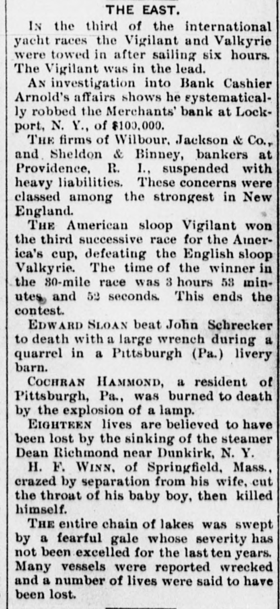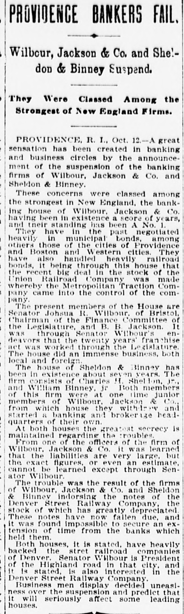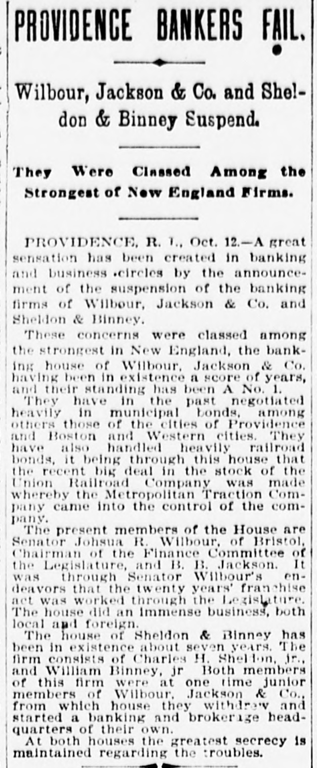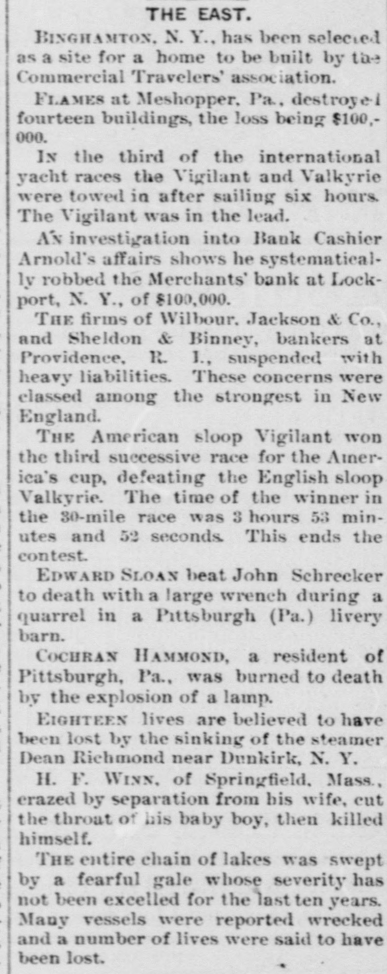 And returns. like the echo, sweet at last. For Time with its kind and pitying heart Doth play in truth a healing part. 'H 'f T The time to " resolve to keep a diary su The grand jury of the United States ourt has been excused until February 13. There is no improvement in the condition of Policeman Whidden. He is critTII itally The banking firms of Wilbour,Jackson & Co. and Sheldon & Binney resumed business this morning. The regular meeting of the school committee will be held in the high school building next Friday, Dec. 29, at So'elock. The alarm from box 276 last night was Branch 416 doqs tallor B up are B JOJ nue. A stove fell over causing nearly $200 damage. The total registration up to 3 o'clock this afternoon was more than 14,500, nearly 1400 more than at the same time last year. More than 3300 families, representing about fifteen thousand persons, were supplied with Christmas dinners by Overseer of the Poor Cummings. Councilman-elect J. F. Freeman of the Sixth ward is the only new member of that branch of the city government ho was born in this state. The officers of St. Michael's Temperince cadets were publicly installed last evening. The ceremony was followed by . supper, entertainment and social. "As the days begin to lengthen, the cold begins to strengthen," says the old adage, and the shortest day of the year, the 22d, is with the past; soon with furs and fires! The Wanskuck mills are now running nt half capacity, which is a gratifying condition of affairs for residents in that village. These mills have been wholly shut down for some time. The penny-in-the-slot máchines about the city are looked at covetously by thieves just at present. A few have been broken open and their contents removed, an indication of stringency in the money market. And talking of foreign dishes, have you caught on, old chappie, to the new French name for our old nerve restorer-clam broth. They call it "Essence de Mollusque en Tasse!" How's that foran eye-opener? Mayor-elect Oney and his party of 20 left the city this morning on the 9:20 train en route for the state institutions. They will visit the several departments, enjoy a lunch and return to the city on the 5 o'clock train. Those who have business on South Main street and those who have trudged over the mud of that throughfare for the past few weeks will be glad to know that the sewer will be finished this exening or tomorrow morning. The annual meeting of the Builders' and Traders' exchange will be held this evening, and Inspector of Buildings Hopkins will give some statistics showing the building operations of the city during the of signatures Surressins puu rear ised the law. The common council will meet in special session tomorrow at 12 o'clock to consider the compromise resolution giving discretionary power to the park commissioners to fix the rate of compensation for the laborers on the Roger Williams park extension. A boxing exhibition will begiven in the Metropole club, Aborn street, next Friday evening for the benefit of the Olneyville strikers All the local favorites will appear and several athletes from Boston, New York and the west will be present to assist in the benefit. Robert Louis Stevenson's talk is as brilliant as can be heard anywhere. His humor isso spontansous, so perfectly natural and free from affectation that you forget how brilliant it is. Asked one day what he thought was the matter with him, he replied that, "Seemingly his system had a passionate avidity for taking cold." The following officers were elected at the annual meeting of the Veteran Firemen's association last evening: President, Edward W. Hall; vice-president, Samuel R. Cornell, Edward P. Havens, Lewis E. Davis, Oscar Bender; secretary, Josiah Hill; treasurer, Washington J. Williams. A fireman's chowder was served before the meeting. The comedy "The Prodigal Father" is still at the Boston Museum, and is crowding the handsome theater nightly. The merry play and the famous Maggie Cline come direct from the Boston Museum to the Providence Opera House, opening with matinee New Year's day, and continuing till Wednesday evening with regular Wednesday matinee. A potition is being signed in Burrillville and Pascoag by Miss Bertha Sibley of