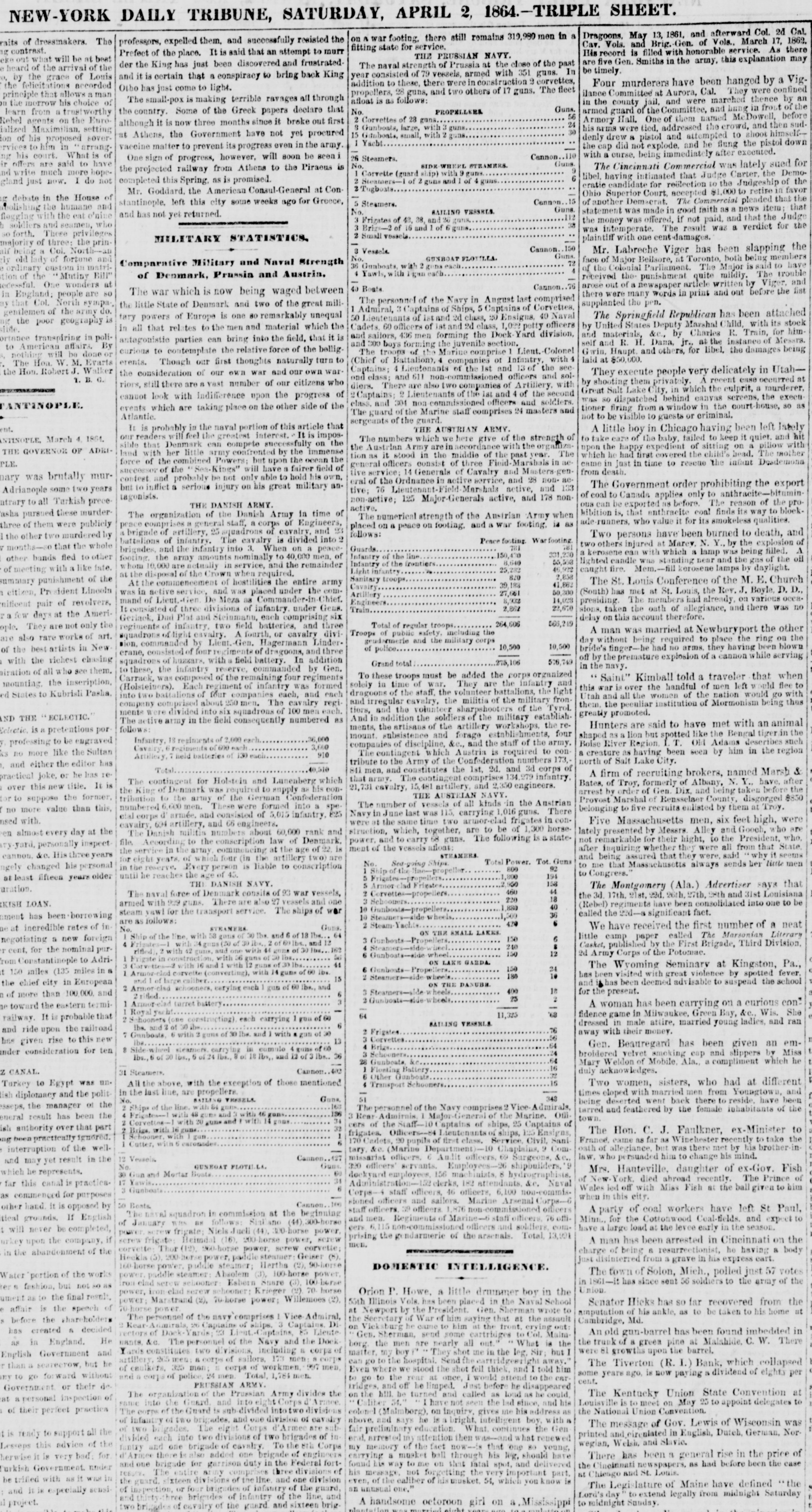 DAILY TRIBUNE, SATURDAY, APRIL 2, 1864.-TRIPLE SHEET. Dragoons, May 13, 1861, and afterward Col. 2d Cal. on A war footing. there still remains 319,980 in a of The dressmakers. professors, expelled them, and successfully resisted the Cav. Vols. and Brig. of Vols., March 17, 1862. fitting state for service. contrast. His record is filled with honorable service. As there Prefect of the place. It is said that an attempt to murr THE PRUSSIAN NAVY. be will at what best are five Gen. Smiths in the army, this explanation may der the King has just been discovered and frustratedThe naval strength of Prussia at the close of the past of of the the arrival be timely. year consisted of 79 vessels, armed with 351 guns. In of the Louis and it is certain that a conspiracy to bring back King grace by Four murderers have been hanged by a Vigaddition to these, there were in construction 3 corvettes, accorded Otho has just come to light. ilance Committee at Aurora, Cal. They were confined a propellers, 28 guns, and two others of 17 guns, The fleet allows man that The small-pox is making terrible ravages all through afloat is as follows: choice of his morrow in the county jail, and were marched thence by an Guns. armed guard of e Committee, and hung in front of the a from No. PROPELLER& trustworthy the country. Some of the Greek papers declare that 56 Corvettes of 28 the Euroagents on Armory Hall. One of them named McDowell, before although it is now three months since it broke out first 24 Gunboats, large, with his arms were tied, addressed the crowd, and then sudMaximilian, setting 30 at Athens, the Government have not yet procured 15 Gutoboats, small, with of his soverdenly drew 8 pistol and attempted to shoot himself-proposed Yacht in him to the cap did not explode, and he flung the pistol down vaccine matter to prevent its progress even in the army. arrang. of is What his court. with curse, being immediately after excented. Cannon 26 Steamers. One sign of progress, however, will soon be seen have to Guns. are offers said SIDE WHERL No. STEAMERS. The Cincinnati Commercial was lately sued for the projected railway from Athens to the Piraeus is more much write hopeCorvette (guard libel. having intimated that Judge Carter, Demo6 I do not now. completed this Spring, as is promised. Steamers-1 of guns and of guns. just cratic candidate for reëlection to the Judgeship of the Tugboats Mr. Goddard. the American Consul-General at ConOhio Superior Court, accepted $1,000 to retire favor of the House debate in Cannon. of another Democrat. The Commercial pleaded that the stantinople, left this city some weeks ago for Greece, Steamers. and humane the Guns. statement was made in good faith as news item; that BAILING VESSELS No. and has not yet returned. with o'nine eat the Frigates of 48, 38, the money was offered, if not paid, and that the Judge who and 38 seamen, 3 Brizs-2 of and of guns. was intemperate. The result was a verdict for the These privileges 2 Small vessels. MILITARY STATISTICS. plaintiff with one cent-damages. of the three: prin150 Cannon. Col. Vessels. North--an Mr. Labreche Viger bas been slapping the being Guns. flotilla. GUNBOAT and of fortune old face of Major Bellsore, at Toronto, both being members lady 72 Comparative Military and Naval Strength 36 Gunboats, with matriin of the Colonial Parliament. The Major is said to have ordinary Yawls, 1th Bill" of the of Denmark, Prussia and Austria. Mutiny received the- punishment quite mildly. The trouble One at wonders arose out of newspaper article written by Viger, and Cannon. 40 Boats so The war which is now being waged between are people there were many words in print and out before the fist England: The personnel of the Navy in August last comprised North Col. that sympasupplanted the pen. the little State of Denmark and two of the great millAdmiral, Captains of Ships, Captains Corvettes, the do. of army The Springfield Republican has been attached tary powers of Europe is one 80 remarkably unequal 50 Lientenants of 2d class, 20 Ensigns, 40 Naval is the geography poor by United States Deputy Marshal Child, with its stock Cadets, officers of and 2d class, officers in all that relates to the men and material which the and materials, &c., by Charles R. Train, for himand sailors, 436 men forming the Dock Yard division, in transpiring poliantagonistic parties can bring into the field, that it is self and R. H. Dana, jr., at the instance Messrs. and 300 boys forming the section. By affairs. American curious to contemplate the relative force of the belligGwin, Haupt. and others, for libel, the damages being The troops of the comprise be done will nothing laid at $50,000. (Chief of Battalion), companies of Infantry, with Evarts M. W. erents. Though our first thoughts naturally turn to The Hon. Captains; Lieutenants of the 1st and the secWalker J. Robert Hon. the consideration of our own war and our own warThey execute people very delicately in Utahond class: and 611 non-commissioned officers and sol1. B. G. by shooting them privately. recent case occurred at riors, still there are a vast number of our citizens who diers. There are also companies of Artillery, with Great Salt Lake in which the culprit, a murderer, ?Captains; 2 Lieutenants of the 1st and of the second cannot look with indifference upon the progress of was 80 dispatched behind canvas screens, the execuclass. and 304 non commissioned officers and soldiers. events which are taking place on the other side of the tioner firing from B window in the so as The guard of the Marine staff comprises 24 masters and Atlantic. not to be visible to guests or criminal. sergeants of the guard. AUSTRIAN ARMY. THE It is probably in the naval portion of this article that A little boy in Chicago having been left lately our readers will the greatest interest. It is impos4. 1864. March The numbers which we here give of the strength of to take care of the baby, tailed to keep it quiet. and hit sible that Denmark can c