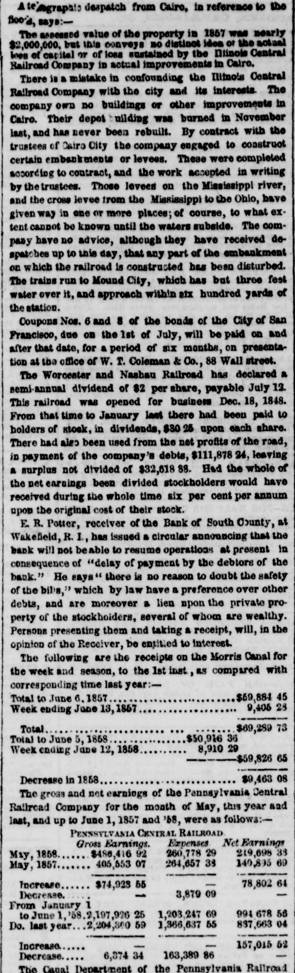 telegraphic despatch from Cairo, in reference to the flood, says:The assessed value of the property in 1857 was nearly $2,000,000, but this conveys no distinot idea of the actual loss of capital or of loss sustained by the Illinois Central Railroad Company in actual improvements in Cairo. There is a mistake in confounding the Ilitno's Central Railroad Company with the city and its interests. The company own no buildings or other improvements in Cairo. Their depot uilding was burned in November last, and has never been rebuilt. By contract with the trustees of Cairo City the company engaged to construct certain embankments or levees. These were completed according to contract, and the work accepted in writing by the trustees. Those levees on the Mississippi river, and the cross levee from the Mississippi to the Ohio, have given way in one or more places; of course, to what extent cannot be known until the waters subside. The company have no advice, although they have received despatches up to this day, that any part of the embankment on which the railroad is constructed has been disturbed. The trains run to Mound City, which has but three fest water over it, and approach within six hundred yards of the station. Coupons Nos. 6 and 8 of the bonds of the City of San Francisco, due on the 1st of July, will be paid on and after that date, for a period of six months, on presentation at the office of W. T. Coleman & Co., 88 Wall street. The Worcester and Nashau Railroad has declared a semi-annual dividend of $2 per share, payable July 12. This railroad was opened for business Dec. 18, 1848. From that time to January last there had been paid to holders of stock, in dividends, $30 upon each share. There had also been used from the net profits of the road, in payment of the company's debts, $111,878 24, leaving a surplus not divided of $32,618 88. Had the whole of the net earnings been divided stockholders would have received during the whole time six per cent per annum upon the original cost of their stock. E. R. Potter, receiver of the Bank of South County, at Wakefield, R. I, has issued a circular announcing that the bank will not beable to resume operations at present in consequence of "delay of payment by the debtors of the bank." He says" there is no reason to doubt the safety of the bills," which by law have a preference over other debts, and are moreover a lien upon the private property of the stockholders, several of whom are wealthy. Persons presenting them and taking a receipt, will, in the opinion of the Receiver, be enjitied to interest. The following are the receipts on the Morris Canal for the week and season, to the 1st inst, as compared with corresponding time last year:$59,881 45 Total to June 6. 1857 9,405 28 Week ending June 13, 1867 Total $69,289 73 $50,916 36 Total to June 5, 1858 8,910 29 Week ending June 12, 1858 $59,826 65 Decrease in 1858 $9,463 08 The gross and net earnings of the Pennsylvania Central Railroad Company for the month of May, this year and last, and up to June 1, 1857 and '58, were as follows:PENNSYLVANIA CENTRAL RAILROAD Net Earnings Expenses Gross Earnings. 219,698 33 260,778 29 $486,416 92 May, 1858 140,895 69 264,657 33 405,553 07 May, 1857 Increase 78,802 64 $74,923 55 1 Decrease. 3,879 09 From January 1 994678 56 1,203,247 69 to June 1, 58.2,197,926 25 837,663 04 1,366,637 55 Do. last year 2,204,300 59 Increase 157,015 52 Decrease. 163,389 86 6,374 34 The Canal Department of the Pennsylvania Railroad