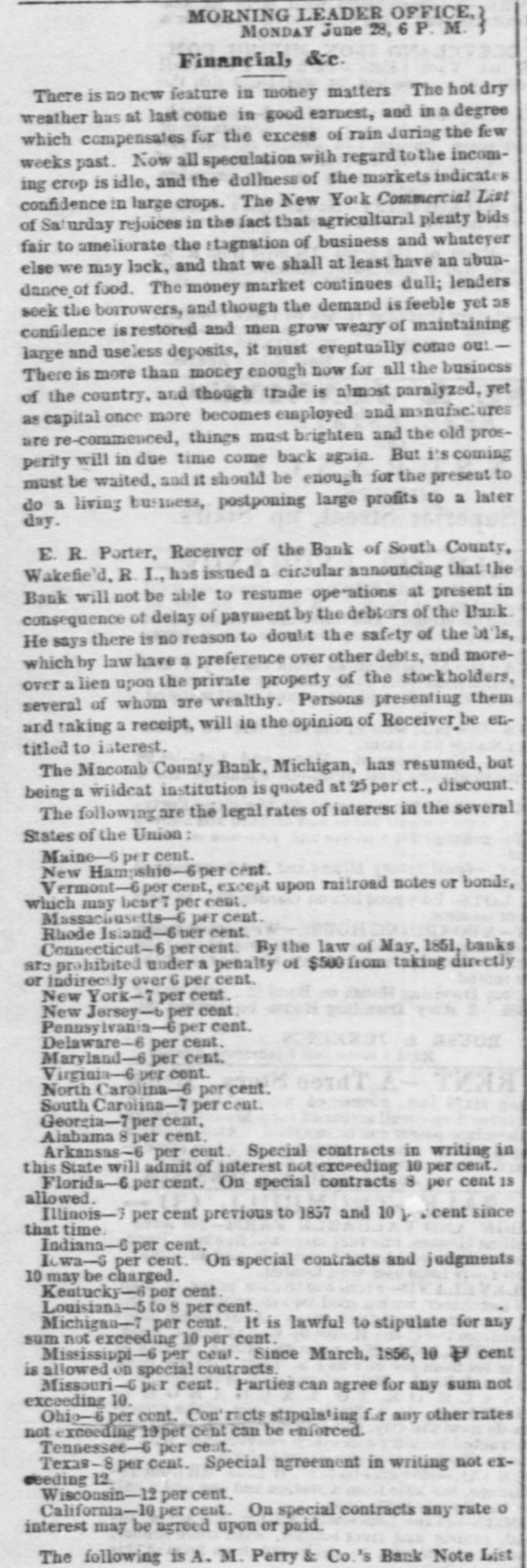 MORNING LEADER OFFICE, MONDAY June 28, 6 P. M. , Financial, &c. There is no new feature in money matters The hot dry weather has at last come in good earnest, and in a degree which compensates for the excess of rain during the few weeks past. Now all speculation with regard to the incoming crop is idle, and the dullness of the markets indicates confidence in large crops. The New York Commercial List of Saturday rejoices in the fact that agricultural plenty bids fair to ameliorate the stagnation of business and whateyer else we may lack, and that we shall at least have an abundance of food. The money market continues dull; lenders seek the borrowers, and though the demand is feeble yet as confidence is restored and men grow weary of maintaining large and useless deposits, it must eventually come outThere is more than money enough now for all the business of the country, and though trade is almost paralyzed, yet as capital once more becomes employed and manufacture are re-commenced, things must brighten and the old prosperity will in due time come back again. But its coming must be waited, and it should be enough for the present to do a living business, postponing large profits to a later day. E. R. Porter, Receiver of the Bank of South County, Wakefield. R. I., has issued a circular announcing that the Bank will not be able to resume operations at present in consequence of delay of payment by the debtors of the Bank. He says there is no reason to doubt the safety of the bils, which by law have a preference over other debts, and moreover a lien upon the private property of the stockholders, several of whom are wealthy. Persons presenting them and taking a receipt, will in the opinion of Receiver be entitled to interest. The Macomb County Bank, Michigan, has resumed, but being a wildcat institution is quoted at 25 per et., discount. The following are the legal rates of interest in the several States of the Union: Maine-6 per cent. New Hampshie-6per cent. Vermont-6 per cent, except upon railroad notes or bonds, which may bear? per cent. Massachusetts-6 per cent. Rhode Island-6 per cent. Connecticut-6 cent. By the law of May, 1851, banks are prohibited under a penalty of $500 from taking directly or indirectly over 6 per cent. New York-7 per cent. New Jersey-6 per cent Pennsylvania-6 per cent. Delaware-6 per cent. Maryland-6 per cent. Virginia-6 per cent. North Carolina-6 percent. South Carolina-7 per cent. Georgia-7 per cent, Alabama 8 per cent. Arkansas-6 per cent. Special contracts in writing in this State will admit of interest not exceeding 10 per cent. Florida-6 cent. On special contracts 8 per cent IS allowed. Illinois-3 per cent previous to 1857 and 10 ) cent since that time. Indiana-6 per cent. Iowa-S per cent. On special contracts and judgments 10 may be charged. Kentucky-6 per cent. Louisiana-5 to 8 per cent. Michigan-7 per cent. It is lawful to stipulate for any sum not exceeding 10 per cent. Mississippi-6 per cent. Since March, 1856, 10 P cent is allowed on special contracts. Missouri-6 per cent. Parties can agree for any sum not exceeding 10. Ohio-6 per cent. Con'racts stipulating for any other rates not exceeding 19pet cent can be enforced. Tennessee-6 per cent. Texas-8 per cent. Special agreement in writing not exfeeding 12. Wisconsin-12 per cent. California-10 per cent. On special contracts any rate 0 interest may be agreed upon or paid. The following is A. M. Perry & Co.'s Bank Note List