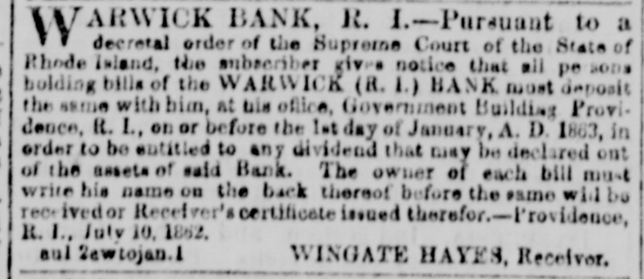 ARWICK BANK, R. I.-Pursuant to a decretal order of the Supreme Court of the State of Rhode Island, the subscriber gives notice that all pe SODE bolding bills of the WARWICK (R. 1.) BANK most deposit the same with him, at this office, Government Building Provi. dence, R. I., on or before the 1st day of January, A. D. 1863, in order to be entitled to any dividend that may be declared out of the assets of said Bank. The owner of each bill must write his name on the back thereof before the same will be rece lived or Receiver's certificate issued therefor.-Providence R. I., July 10. 1862. aul Zawtojan.1 WINGATE HAYES, Receiver.
