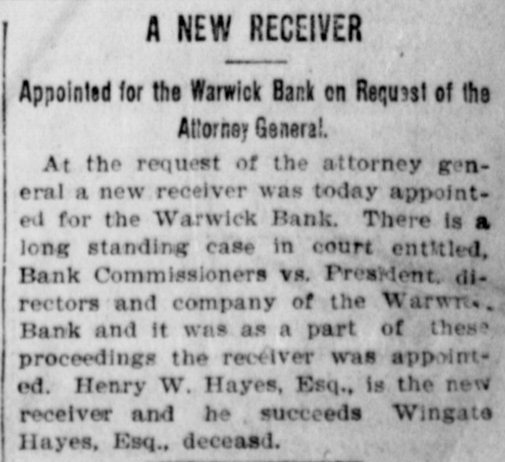 A NEW RECEIVER Appointed for the Warwick Bank on Request of the Attorney General. At the request of the attorney general a new receiver was today appointed for the Warwick Bank. There is a long standing case in court entitled, Bank Commissioners vs. President. directors and company of the Warwn. Bank and it was as a part of these proceedings the recéiver was appointed. Henry W. Hayes, Esq., is the new receiver and he succeeds Wingate Hayes, Esq., deceasd.