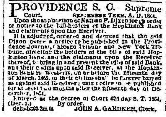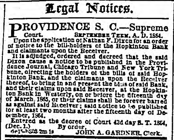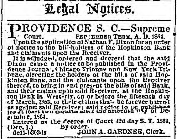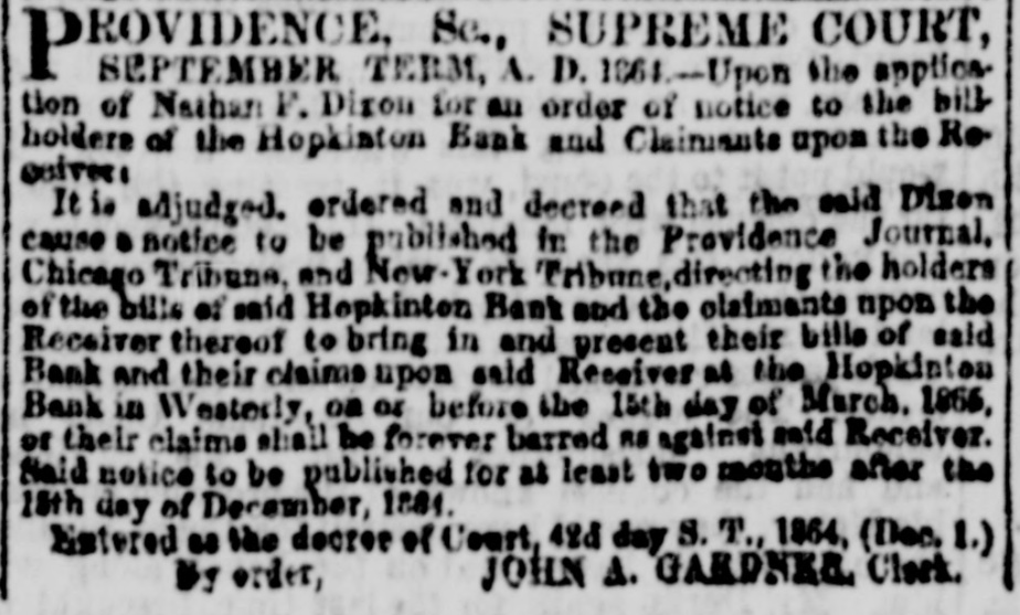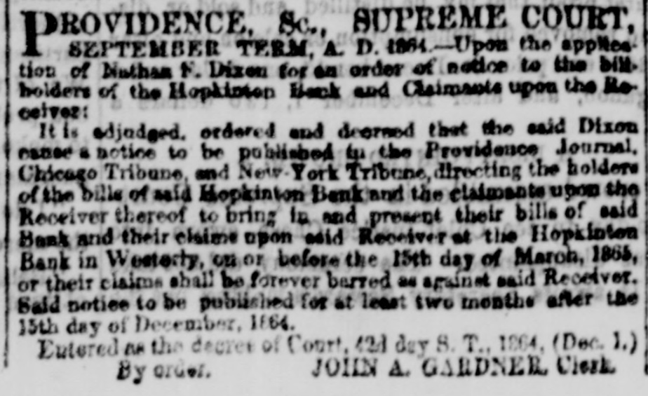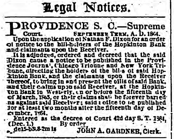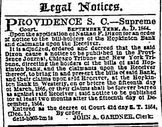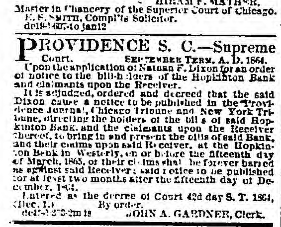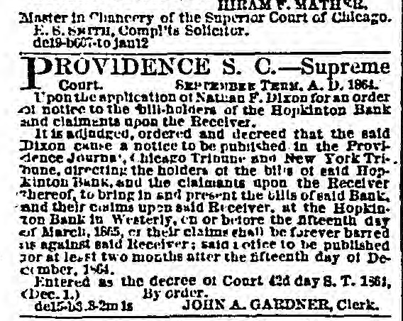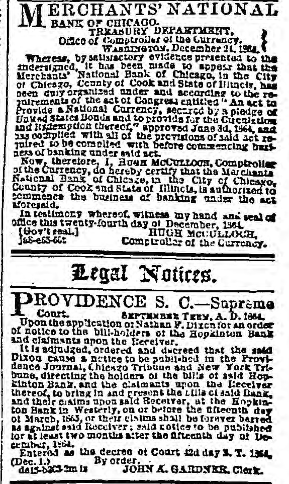 ERCHANTS' NATIONAL M BANK OF CHICAGO. TREASURY DEPARTMENT, Office of Comptroller of the Currency. WASHINGTON. December 21. 1964. Wheress, by satisfactory evidence presented to the undersigned, It has been made to appear that the Merchants' National Bank of Chicago, in the City of Chiesgo, County of Cook and State of Illincis, has been dury organized under and according to the TOjuirements of the act of Congress entitled An act to Provide a National Currency, secured by 3 pledge of United States Bonds and to provide for the Circulation and Redemption thereof," approved June 3d, 1864, and 133 complied with all of the previsions of said act required to be complied with before commencing bask ners of banking under said act. Now, therefore, 1, Boan MCCULLOON, Comptroller of the Currency, do hereby certify that the chants National Bank of Chicage, in the City of Chicago, County of Cooz and State of Minots, is authorized to commence Moresaid. the business of banking under the act In testimony whereof. witness my hand and seal of office this twenty-fourth day of December, 1364. [Gov't real] HUGH MCCULLOCH, ja8-e63-60t Comptroller of the Currency. Legal Notices. PROVIDENCE S. C.-Supreme TERY, A. D. 1864. Upon the application 01 Nathan F. Dixon for an order of notice to the bill-holders of the Hopkinton Bank and claimants upon the Bereiver. It is adjudged, ordered and decreed that the said Dixon cause & notice to be published in the Providence Journal, Chienzo Tribune and New York Tribune, directing the holders of the bills of said Hopkinton Bank. and the claimants upon the Receiver thereof, to bring in and present the Lills ci said Bank, and their claims upon sald Receiver, at the Hopkinton Bank in Westerly, on or before the unternth day of March, 1665, or their claims shall be forever barred as against said Receiver; said cotice to be published for at least two months after the fifteenth day at December, 1864. Entered as the decree of Court 12d day 3. T. 1364, By order. (Dec. 1.) de15-b203-2m is JOHN A. GARDNER. Clerk.