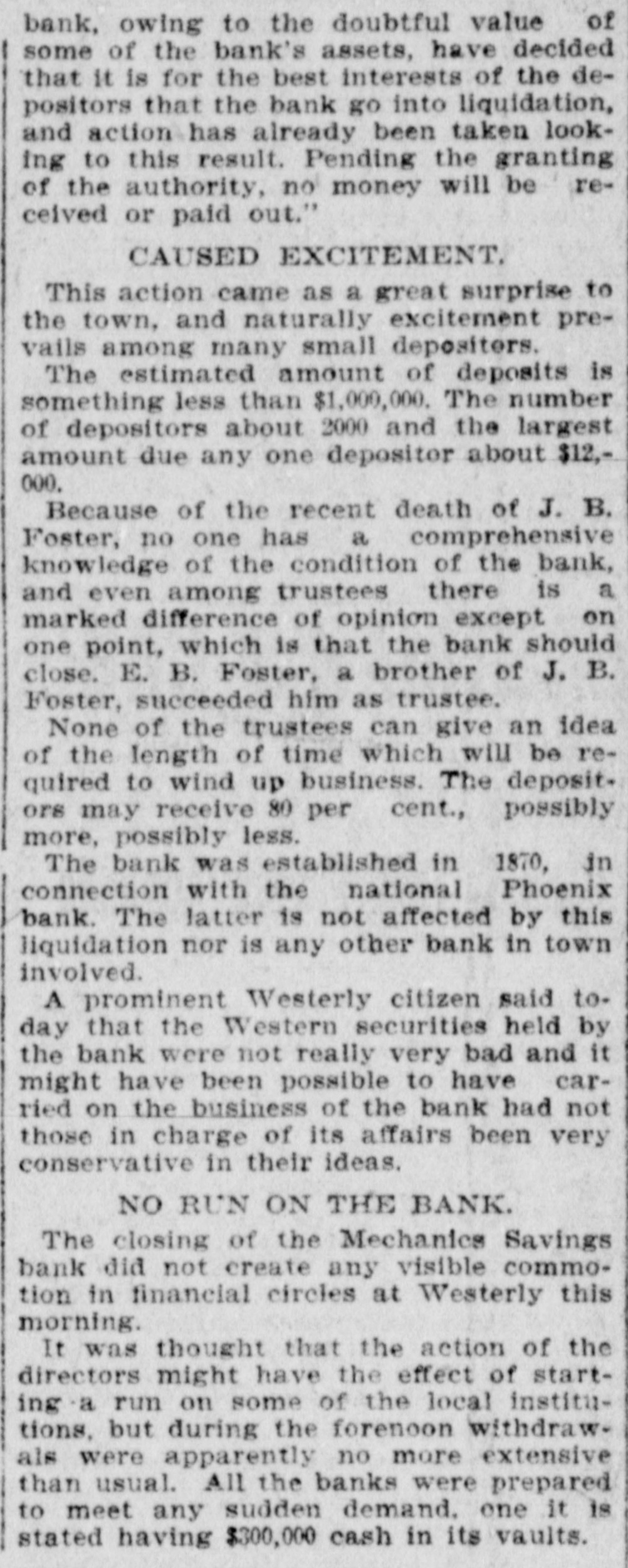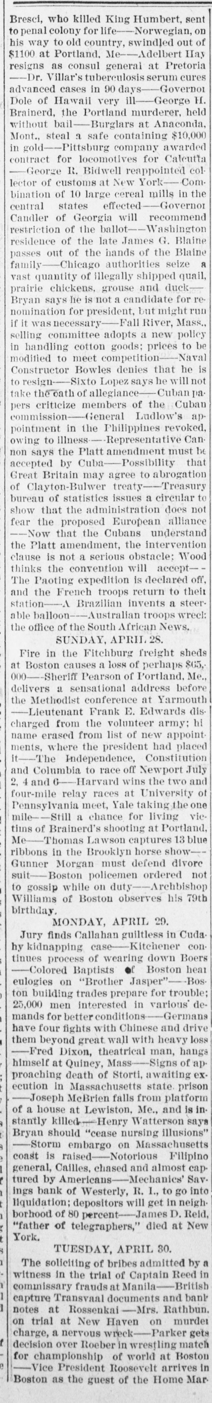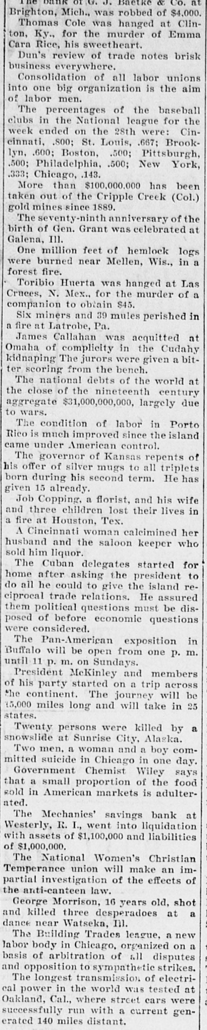 or Baetke & at Co. Brighton, Mich., was robbed of $4,000. Thomas Cole was hanged at Clinton, Ky., for the murder of Emma Cara Rice, his sweetheart. Dun's review of trade notes brisk business everywhere. Consolidation of all labor unions into one big organization is the aim of labor men. The percentages of the baseball clubs in the National league for the week ended on the 28th were: Cincinnati, .800; St. Louis, .667; Brooklyn, .600; Boston, .500; Pittsburgh, .500; Philadelphia, .500; New York, .333; Chicago, .143. More than $100,000,000 has been taken out of the Cripple Creek (Col.) gold mines since 1889. The seventy-ninth anniversary of the birth of Gen. Grant was celebrated at Galena, III. One million feet of hemlock logs were burned near Mellen, Wis., in a forest fire. Toribio Huerta was hanged at Las Cruces, N. Mex., for the murder of a companion to obtain $45. Six miners and 39 mules perished in a fire at Latrobe, Pa. James Callahan was acquitted at Omaha of complicity in the Cudahy kidnaping The jurors were given a bitter scoring from the bench. The national debts of the world at the close of the nineteenth century aggregate $31,000,000,000, largely due to wars. The condition of labor in Porto Rico is much improved since the island came under American control. The governor of Kansas repents of his offer of silver mugs to all triplets born during his second term. He has given 15 already. Job Copping, a florist, and his wife and three children lost their lives in a fire at Houston, Tex. A Cincinnati woman calcimined her husband and the saloon keeper who sold him liquor. The Cuban delegates started for home after asking the president to do all he could to give the island reciprocal trade relations. He assured them political questions must be disposed of before economic questions were considered. The Pan-American exposition in Buffalo will be open from one p. m. until 11 p. m. on Sundays. President McKinley and members of his party started on a trip across the continent. The journey will be 15,000 miles long and will take in 25 states. Twenty persons were killed by a snowslide at Sunrise City, Alaska. Two men, a woman and a boy committed suicide in Chicago in one day. Government Chemist Wiley says that a small proportion of the food sold in American markets is adulterated. The Mechanics' savings bank at Westerly, R. I., went into liquidation with assets of $1,100,000 and liabilities of $1,000,000. The National Women's Christian Temperance union will make an impartial investigation of the effects of the anti-canteen law. George Morrison, 16 years old, shot and killed three desperadoes at a dance near Watseka, Ill. The Building Trades league, a new labor body in Chicago, organized on a basis of arbitration of all disputes and opposition to sympathetic strikes. The longest transmission of electrical power in the world was tested at Oakland, Cal., where street cars were "