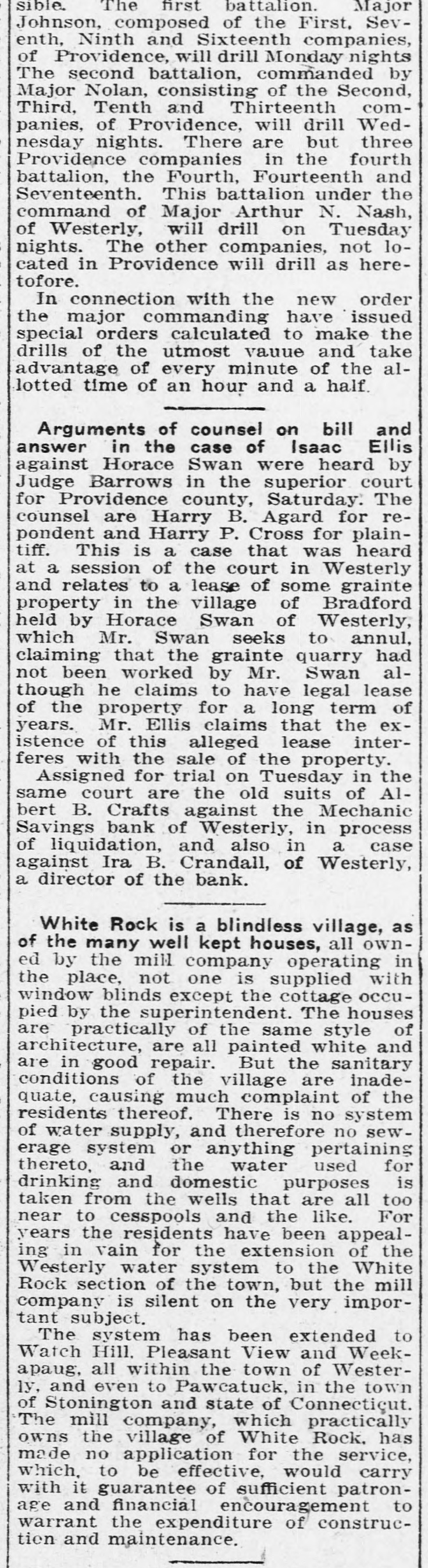 sible. The first battalion. Major Johnson, composed of the First, Sev- enth, Ninth and Sixteenth companies, of Providence, will drill Monday nights The second battalion, commanded by Major Nolan, consisting of the Second, Third, Tenth and Thirteenth com- panies, of Providence, will drill Wed- nesday nights. There are but three Providence companies in the fourth battalion, the Fourth, Fourteenth and Seventeenth. This battalion under the command of Major Arthur N. Nash, of Westerly, will drill on Tuesday nights. The other companies, not lo- cated in Providence will drill as here- tofore. In connection with the new order the major commanding have issued special orders calculated to make the drills of the utmost vauue and take advantage of every minute of the al- lotted time of an hour and a half. ### Arguments of counsel on bill and answer in the case of Isaac Ellis against Horace Swan were heard by Judge Barrows in the superior court for Providence county, Saturday. The counsel are Harry B. Agard for re- pondent and Harry P. Cross for plain- tiff. This is a case that was heard at a session of the court in Westerly and relates to a lease of some grainte property in the village of Bradford held by Horace Swan of Westerly, which Mr. Swan seeks to annul, claiming that the grainte quarry had not been worked by Mr. Swan al- though he claims to have legal lease of the property for a long term of years. Mr. Ellis claims that the ex- istence of this alleged lease inter- feres with the sale of the property. Assigned for trial on Tuesday in the same court are the old suits of Al- bert B. Crafts against the Mechanic Savings bank of Westerly, in process of liquidation, and also in a case against Ira B. Crandall, of Westerly, a director of the bank. White Rock is a blindless village, as of the many well kept houses, all own- ed by the mill company operating in the place, not one is supplied with window blinds except the cottage occu- pied by the superintendent. The houses are practically of the same style of architecture, are all painted white and are in good repair. But the sanitary conditions of the village are inade- quate, causing much complaint of the residents thereof. There is no system of water supply, and therefore no sew- erage system or anything pertaining thereto, and the water used for drinking and domestic purposes is taken from the wells that are all too near to cesspools and the like. For years the residents have been appeal- ing in vain for the extension of the Westerly water system to the White Rock section of the town, but the mill company is silent on the very impor- tant subject. The system has been extended to Watch Hill, Pleasant View and Week- apaug, all within the town of Wester- ly, and even to Pawcatuck, in the town of Stonington and state of Connecticut. The mill company, which practically owns the village of White Rock, has made no application for the service, which, to be effective, would carry with it guarantee of sufficient patron- age and financial encouragement to warrant the expenditure of construc- tien and maintenance.