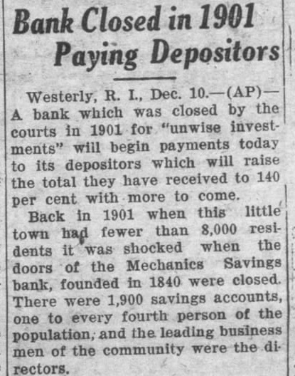 Bank Closed in 1901 Paying Depositors Westerly, R. L., Dec. (AP) A bank which was closed by the courts in 1901 for "unwise investments" will begin payments today to its depositors which will raise the total they have received to 140 per cent with more to come. Back in 1901 when this little town had fewer than 8,000 residents it was shocked when the doors of the Mechanics Savings bank, founded in 1840 were closed. There were 1,900 savings accounts, one to every fourth person of the population, and the leading business men of the community were the directors.