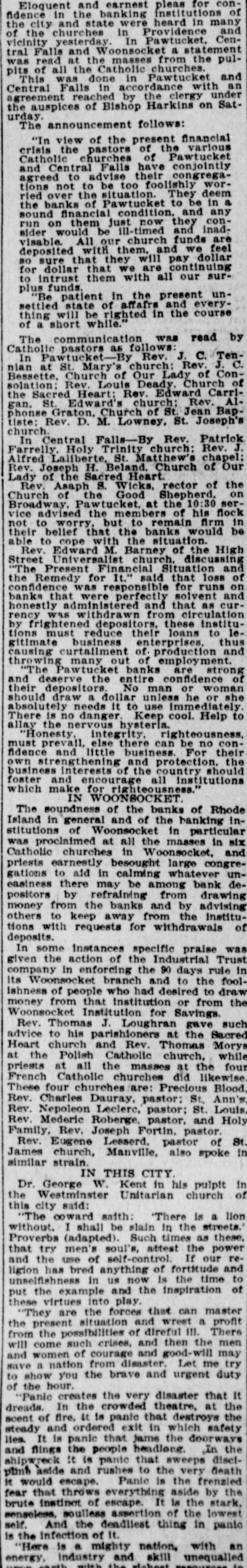 Eloquent and earnest pleas for confidence in the banking Institutions of the city and state were heard in many of the churches in Providence and vicinity yesterday. In Pawtucket, Central Falls and Woonsocket a statement was read at the masses from the pulpits of all the Catholic churches. This was done in Pawtucket and Central Falls in accordance with an agreement reached by the clergy under the auspices of Bishop Harkins on Saturday. The announcement follows: "In view of the present financial crisis the pastors of the various Catholic churches of Pawtucket and Central Falls have conjointly agreed to advise their congregations not to be too foolishly worried over the situation. They deem the banks of Pawtucket to be in a sound financial condition. and any run on them just now they consider would be ill-timed and inadvisable. All our church funds are deposited with them, and we feel so sure that they will pay dollar for dollar that we are continuing to intrust them with all our surplus funds. 'Be patient in the present unsettled state of affairs and everything will be righted in the course of a short while. The communication was read by Catholic pastors as follows: In Pawtucket-By Rev. J. C. Tennian at St. Mary's church: Rev. J. C. Bessette, Church of Our Lady of Consolation: Rev. Louis Deady, Church of the Sacred Heart; Rev. Edward Carrigan, St. Edward's church; Rev. A1phonse Graton, Church of St. Jean Baptiste: Rev. D. M. Lowney, St. Joseph's church. In Central Falls-By Rev. Patrick Farrelly Holy Trinity church: Rev. J. Alfred Laliberte, St. Matthew's chapel; Rev. Joseph H. Beland. Church of Our Lady of the Sacred Heart. Rev. Asaph S. Wicks, rector of the Church of the Good Shepherd, on Broadway, Pawtucket, at the 10:30 service advised the members of his flock not to worry, but to remain firm in their belief that the banks would be able to cope with the situation. Rev. Edward M. Barney of the High Street Universalist church, discussing "The Present Financial Situation and the Remedy for It." said that loss of confidence was responsible for runs on banks that were perfectly solvent and honestly administered and that as currency was withdrawn from circulation by frightened depositors, these institutions must reduce their loans to legitimate business enterprises, thus causing curtailment of production and throwing many out of employment. "The Pawtucket banks are strong and deserve the entire confidence of their depositors. No man or woman should draw a dollar unless he or she absolutely needs it to use immediately. There is no danger. Keep cool. Help to allay the nervous hysteria. "Honesty, integrity, righteousness, must prevail, else there can be no confidence and little business. For their own strengthening and protection. the business interests of the country should foster and encourage all institutions which make for righteousness.' IN WOONSOCKET. The soundness of the banks of Rhode Island in general and of the banking institutions of Woonsocket in particular was proclaimed at all the masses in six Catholic churches in Woonsocket, and priests earnestly besought large congregations to aid in calming whatever uneasiness there may be among bank depositors by refraining from drawing money from the banks and by advising others to keep away from the institutions with requests for withdrawals of deposits. In some instances specific praise was given the action of the Industrial Trust company in enforcing the 90 days rule in its Woonsocket branch and to the foolishness of people who had desired to draw money from that institution or from the Woonsocket Institution for Savings. Rev. Thomas J. Loughran gave such advice to his parishioners at the Sacred Heart church and Rev. Thomas Morys at the Polish Catholic church, while priests at all the masses at the four French Catholic churches did likewise. These four churches are: Precious Blood. Rev. Charles Dauray, pastor; St. Ann's Rev. Nepoleon Leclerc, pastor; St. Louis, Rev. Mederic Roberge, pastor, and Holy Family, Rev. Joseph Fortin, pastor. Rev. Eugene Lesserd. pastor of St. James church, Manville, also spoke in similar strain. IN THIS CITY. Dr. George W. Kent in his pulpit in the Westminster Unitarian church of this city said: "The coward saith: "There is a lion without. I shall be slain in the streets. Proverbs (adapted). Such times as these, that try men's soul's, attest the power and the use of self-control. If our religion has bred anything of fortitude and unselfishness in us now is the time to put the example and the inspiration of these virtues into play. "They are the forces that can master the present situation and wrest a profit from the possibilities of direful 111. There will come such crises, and then the men and women of courage and good-will may save a nation from disaster. Let me try to show you the brave and urgent duty of the hour. "Panic creates the very disaster that It dreads. In the crowded theatre, at the scent of fire, It is panic that destroys the steady and ordered exit in which safety lies. It is panic that jame the doorways and flings the people headlong. in the shipwreck It is panic that sweeps discipline aside and rushes to the very death It would escape. Panic is the frenzied fear that throws everything aside by the brute instinct of escape. It is the stark, senseless. soulless assertion of the lowest self. And the deadliest thing in panic is the infection of it. "Here is a. mighty nation, with an energy, industry and skill unequalled richest