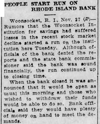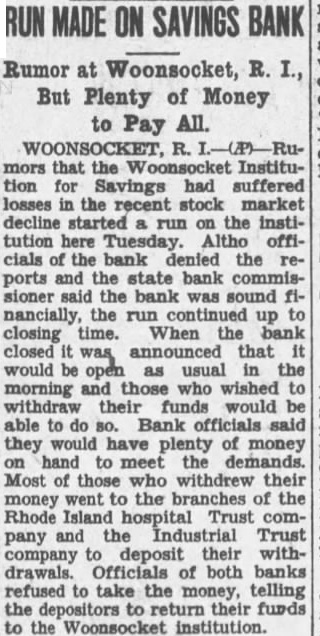 Rumor at Woonsocket, But Plenty of Money to Pay All. mors that Institution for Savings had suffered losses in the recent stock market decline started run on the institution here Tuesday. Altho officials the bank denied the reports state bank commissioner said the bank was sound nancially, the run continued up to closing time. When bank closed announced that would be open usual in the morning those who wished withdraw their funds would be able do Bank officials said they would have plenty money hand meet demands. Most of those who withdrew their money went the branches of the Rhode Island hospital Trust company Industrial Trust company deposit their drawals. Officials of both banks refused to take the money, telling the return their funds the Woonsocket institution.