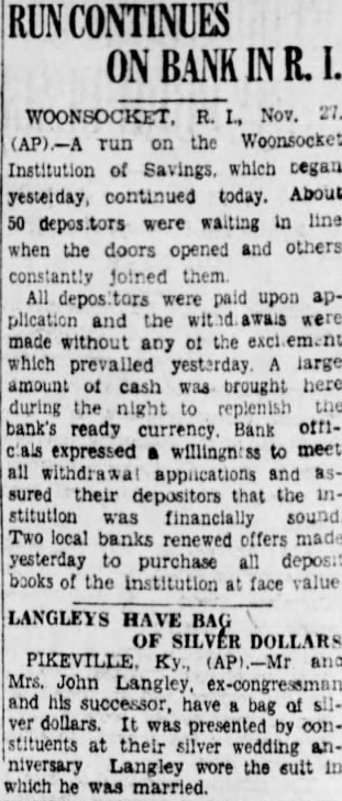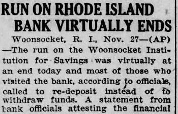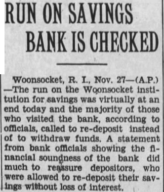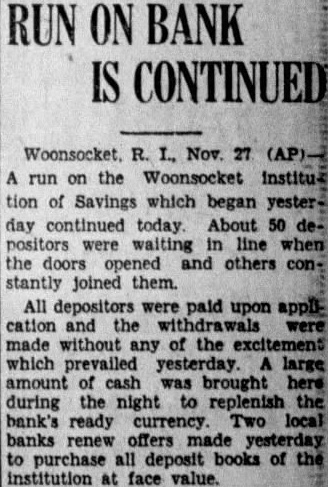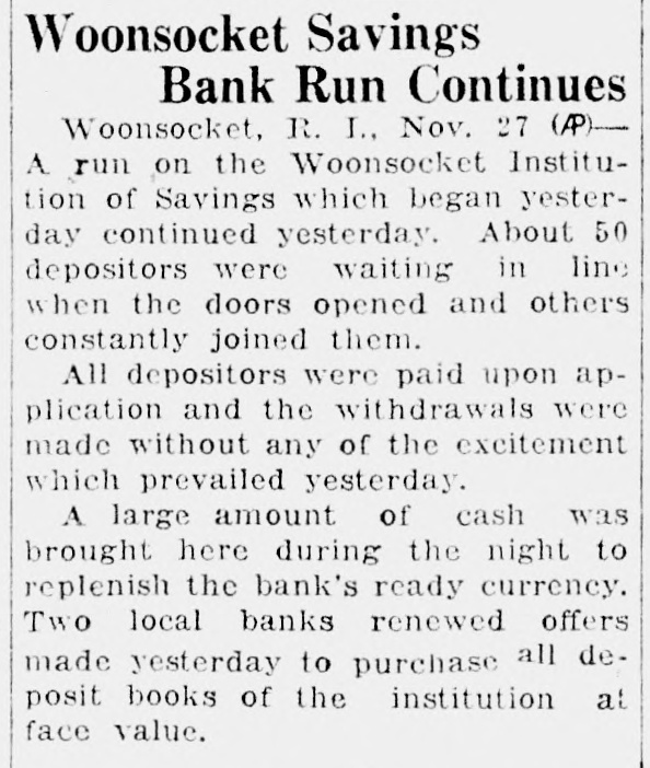 Woonsocket. Nov. run on the Woonsocket tion Savings which began yesterday continued today. About 50 waiting the and others stantly joined them. All paid and the made without any of the which prevailed large amount cash was brought during the night to replenish bank's Two banks made purchase deposit books of face value.