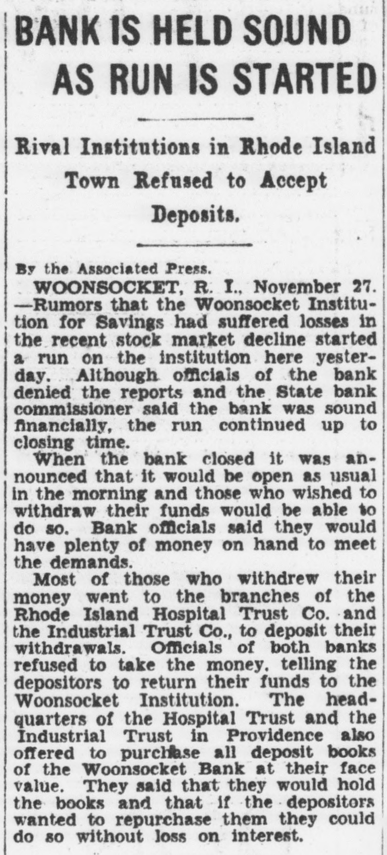 BANK IS HELD SOUND AS RUN IS STARTED Rival Institutions in Rhode Island Town Refused to Accept Deposits. By the Associated Press. WOONSOCKET, R. I., November 27. -Rumors that the Woonsocket Institution for Savings had suffered losses in the recent stock market decline started a run on the institution here yesterday. Although officials of the bank denied the reports and the State bank commissioner said the bank was sound financially, the run continued up to closing time. When the bank closed it was announced that it would be open as usual in the morning and those who wished to withdraw their funds would be able to do so. Bank officials said they would have plenty of money on hand to meet the demands. Most of those who withdrew their money went to the branches of the Rhode Island Hospital Trust Co. and the Industrial Trust Co., to deposit their withdrawals. Officials of both banks refused to take the money. telling the depositors to return their funds to the Woonsocket Institution. The headquarters of the Hospital Trust and the Industrial Trust in Providence also offered to purchase all deposit books of the Woonsocket Bank at their face value. They said that they would hold the books and that if the depositors wanted to repurchase them they could do 80 without loss on interest.
