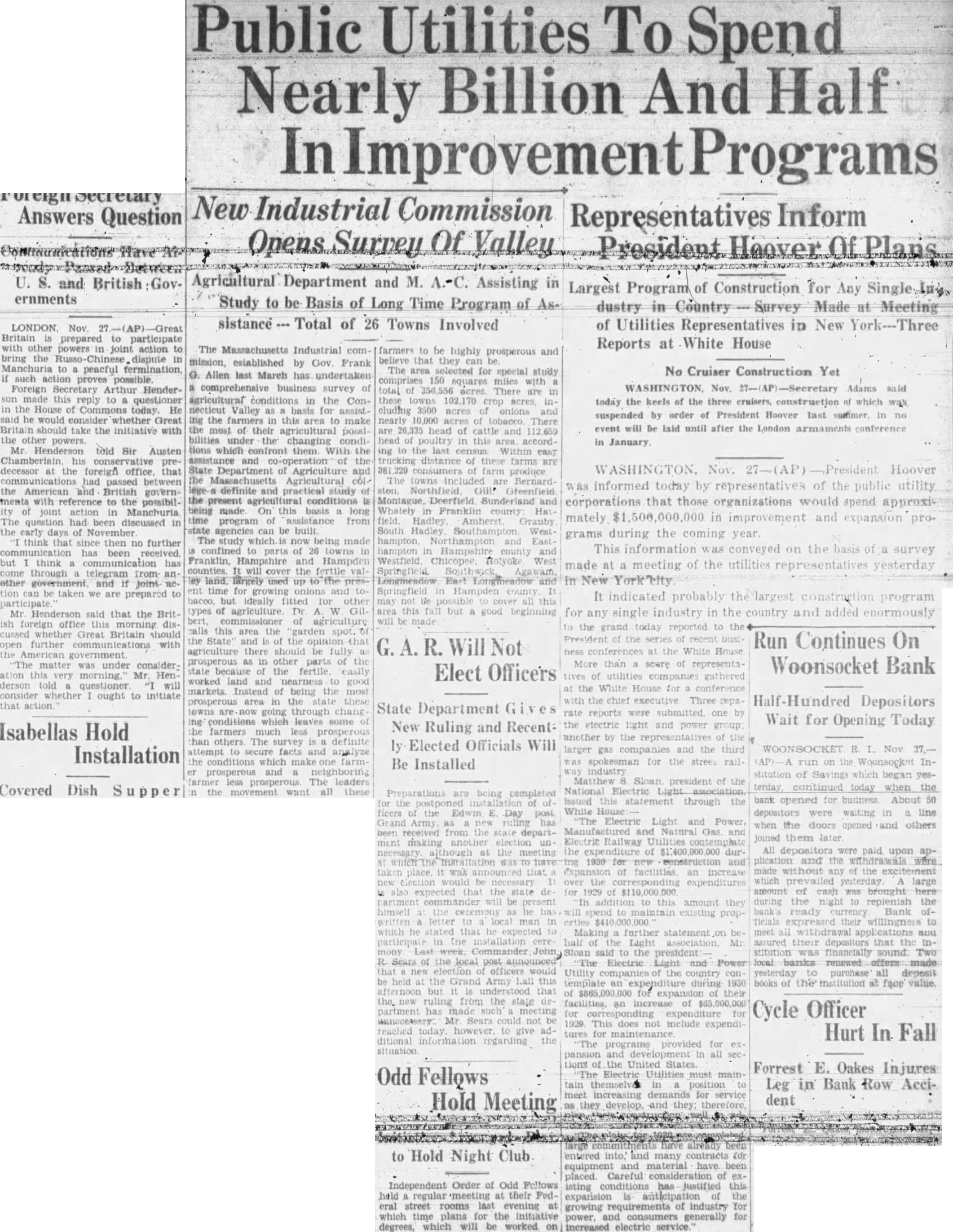 It indicated probably for any single industry in the country and the grand today reported to President of the series of recent Run Continues On ness the White House More than scare of representa- Woonsocket Bank tives of utilities companies gathered the White House for conference the chief executive Three Half-Hundred Depositors rate reports submitted. one by Wait for Opening Today the light power group: another by the representatives of the larger companies and the third WOONSOCKET Nov gas spokesman for the street rail- on the Woonsocket Inindustry stitution of Savings which began yesMatthew Sloan president of the terday, continued today when the National bank opened for About 50 statement through the White House waiting in line were "The Electric Light when the doors opened and others Natural Gas joined them later Railway expenditure of dur- All depositors were paid upon 1930 for and the withdrawals were an increase made without the excitement the expenditures which yesterday large for 1929 amount of cash brought this amount they the night replenish the existing ready currency Bank ofTicials expressed their willingness to further statement meet withdrawal applications half assured their depositors that the Stoan to the president stitution financially sound. Two Electric Light and Power banks renewed offers Utility the country con purchase all deposit template an during 1930 books of the institution face value. of expansion of their an of Cycle Officer for expenditure for 1929. This does not include expendifor Hurt In Fall tures maintenance The programs provided for pansion all tions the United States. Forrest E. Oakes Injures Electric Utilities must tain themselv position Leg in Bank Row Accimeet increasing demands for service dent they and they entered and many contracts for and material have been placed. Careful consideration of isting conditions has justified this expansion the growing requirements of industry for power, consumers generally for increased electric service.