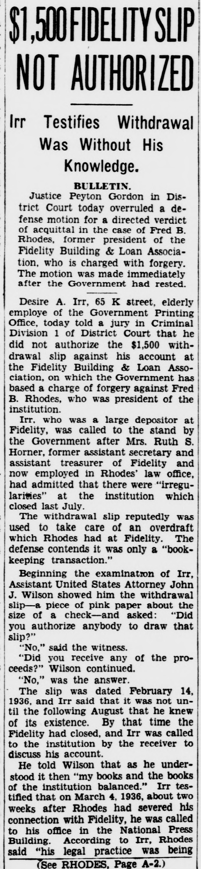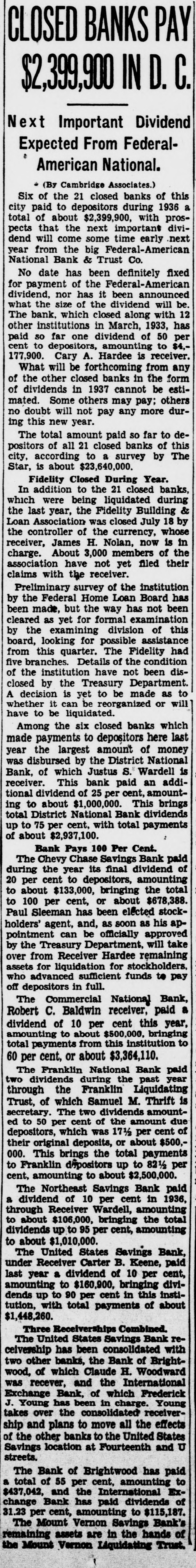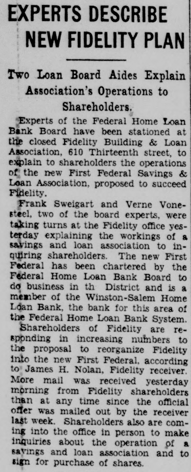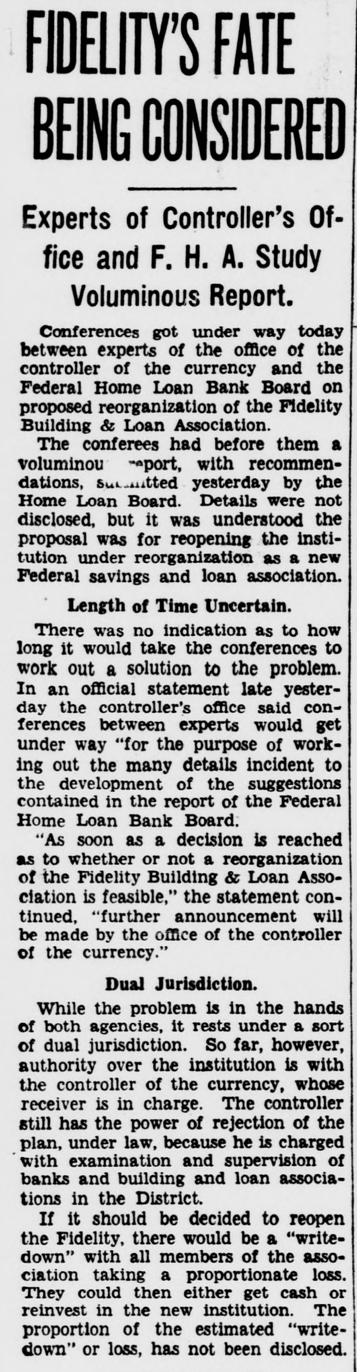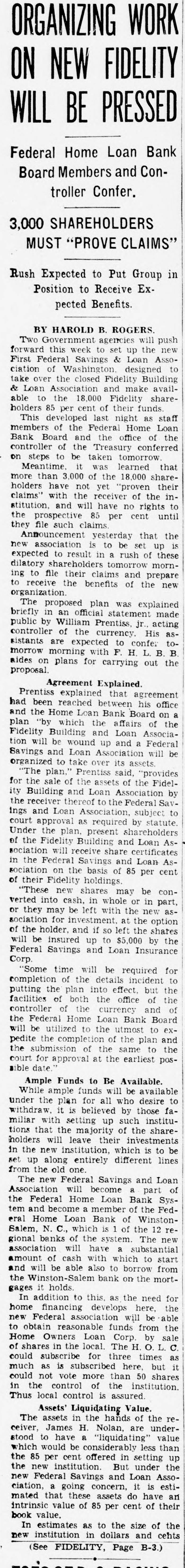 FIDELITY BUILDING EX-TRUSTEES BID TOTALK REOPENING Shareholders Seek Joint Session to Clear Up Questions. FORMER HEADS OFFER REORGANIZATION PLAN Affiliation With Federal Home Loan Bank Board Urged. Loftus Silent. Representatives of the Fidelity Building & Loan Association sharewill holders today invite institution the former trustees of that defunct to a joint meeting to discuss the problem of reopening. Loftus, chairman of the Fidelity Shareholders' said Don A. Committee, sought "to the proposed meeting was clear up, if possible, some of the questions which have arisen" since the house was 18, banking closed, of the Currency July by order of Controller O'Connor. The trustees, through their secreMarcus Borchardt, are sponsoring tary, a reorganization plan the which Federal proposes affiliation with Home Loan Band Board. Loftus Refrains From Comment. Loftus. however, who held a meeting of his committee last night in his Hotel Washington room, refrained from comment on this proposal. He said: "The committee has not indorsed so public will it any print, plan nor appearing until far all in the facts are known." Action on the trustee plan is imuntil O'Connor's examiners have loan possible association's completed their books. digest of the Losses to date are estimated at "in excess of $200,000," with $13.000 allegedly misappropriated by Fred B. Rhodes, former president, who is free in $5,000 bail on a larceny charge. $200.000 insists inLoftus, figure however, and disputed the crashed the stitution is in fair condition. The purpose of last night's Shareto as holders' decide definitely Committee to meeting the first "was functions toward finding the true facts about the institution and its condition, and the reasons why any substantial losses could have been possible." True Facts Must Be Known. Before any conclusions as to further action can be drawn these "true facts" must be known. it is granted by Loftus, Borchardt. O'Connor and Receiver M. L. Barnett, jr. Loftus and his colleagues decided to request to this from committee Barnett "that the he turn over use of some of the unused office space and that he assume the cost of a stenographer or office help and telephone service so as to enable the committee to assist and relieve the receiver from undue requests by depositor-shareholders and borrowing shareholders for information which would require much of his valuable time from his much-needed duties." Present with Loftus at the threehour hotel room discussion were John C. Huntington, Fred M. Thring and G. C. Hanna. The fifth committee member, H. G. Cavanaugh, was absent on a vacation trip. The five were chosen Sunday by 500 of Fidelity's 18,000 shareholders at an afternoon session called by Loftus, who heads a real estate development on the outskirts of Alexandria, Va.