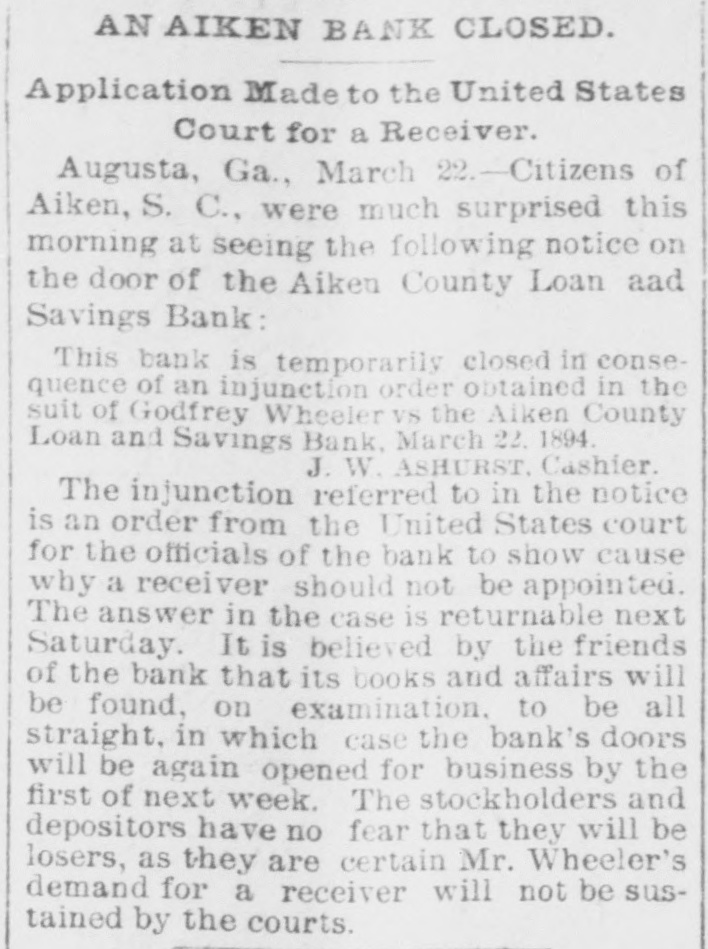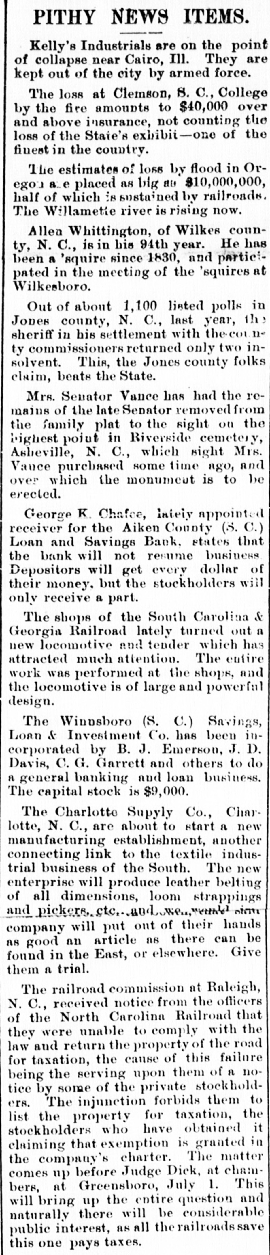 PITHY NEWS ITEMS. Kelly's Industrials are on the point of collapse near Cairo, Ill. They are kept out of the city by armed force. The loss at Clemson, S. C., College by the fire amounts to $40,000 over the and above insurance, not counting loss of the State's exhibit-one of the finest in the country. The estimates of loss by flood in Oregon a.e placed as big all $10,000,000, half of which is sustained by railroads. The Willamette river is rising now. Allen Whittington, of Wilkes county,N.C., is in his 94th year. He has been a 'squire since 1830, and participated in the meeting of the 'squires at Wilkesboro. Out of about 1,100 listed polls in Jones county, N. C., last year, the sheriff in his settlement with the-count ty commissioner returned only two insolvent. This, the Jones county folks claim, beats the State. Mrs. Senator Vance has had the remains of the late Senator removed from the family plat to the sight on the highest poiut in Riverside cemetery, Asheville, N. C., which sight Mrs. Vance purchased some time ago, and over which the monument is to be erected. George K. Chafee, intely appointed receiver for the Aiken County (S. C.) Loan and Savings Bank. states that the bank will not resume business Depositors will get every dollar of their money, but the stockholders will only receive a part. The shops of the South Carolina & Georgia Railroad lately turned out a new locomotive and tender which has attracted much attention. The entire work was performed at the shops, and the locomotive is of large and powerful design. The Winnsboro (S. C.) Savings, Loan & Investment Co. has been incorporated by B. J. Emerson, J. D. Davis, C.G. Garrett and others to do A general banking and loan business. The capital stock is $9,000. The Charlotte Supply Co., Charlotte, N. C., are about to start a new manufacturing establishment, another connecting link to the textile industrial business of the South. The new enterprise will produce leather belting of all dimensions, loom strappings and niem company will put out of their hands be good an article as there can as found in the East, or elsewhere. Give them a trial. The railroad commission at Raleigh, N. C., received notice from the officers of the North Carolina Railroad that they were unable to comply with the law and return the property of the road for taxation, the cause of this failure being the serving upon them of a notice by some of the private stockholders. The injunction forbids them to list the property for taxation, the stockholders who have obtained it claiming that exemption is granted in the company's charter. The matter comes up before Judge Dick, at chambers, at Greensboro, July 1. This will bring up the entire question and naturally there will be considerable public interest, as all the railroadssave this one pays taxes.
