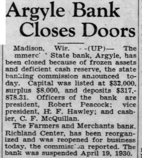 May 23rd was the 52nd anniversary of the Mineral Point tornado. Jacob Miller of Boscobel died recently. He was a Civil war veteran. Robert Zickerman, 12 year old lad of Livingston, was kicked in the head by a horse. He was found lying in the field. Several stitches were required to close the cuts. The city of Pra. had du Chien had $36,000 on deposit in the Peoples State bank when it suspended. The city had to negotiate a loan of $16,000 to carry on operations. Prof. Kexel who has been teaching in the Cuba City Schools for four years has been engaged as principal of the Ridgeway School. Riley Livingston, present principal, continues his studies at the university. Mrs. Anna Bridges died Wednesday after a long illness at the home of Mrs. Llu Bridges. Funeral services were held at the Concklin Funeral Home at one o'clock Friday. Interment was made at Mineral Point.Platteville News. The Mike Grea store and dance hall and the Korth garage at Hillpoint were destroyed by fire Thursday night. The Loganville fire laddies helped to combat the blaze and two of them, Wm. Voss and Paul Roewer, received burns. The loss was $10,000.
