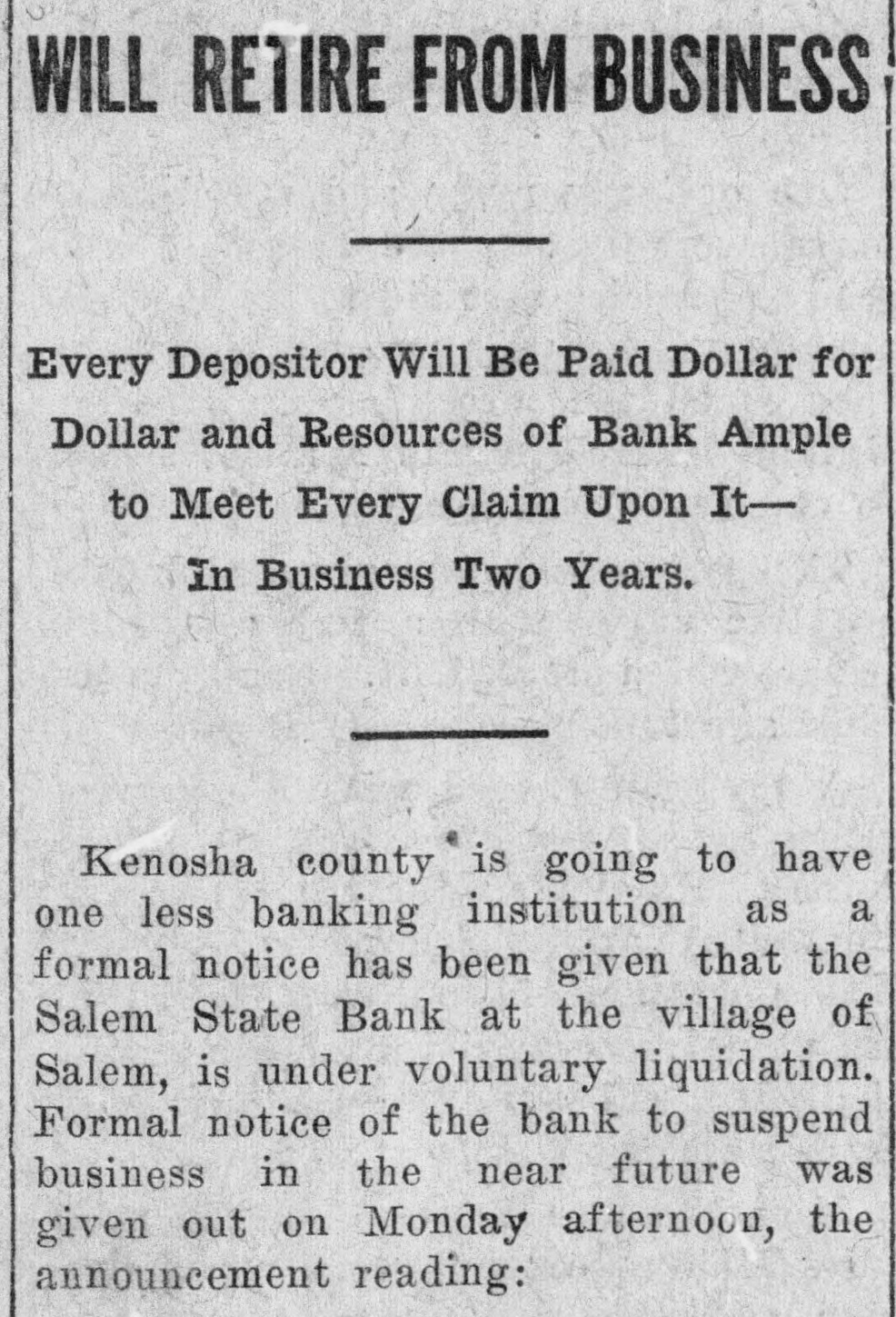 WILL RETIRE FROM BUSINESS Every Depositor Will Be Paid Dollar for Dollar and Resources of Bank Ample to Meet Every Claim Upon ItIn Business Two Years. Kenosha county is going to have one less banking institution as a formal notice has been given that the Salem State Bank at the village of Salem, is under voluntary liquidation. Formal notice of the bank to suspend business in the near future was given out on Monday afternoon, the announcement reading: