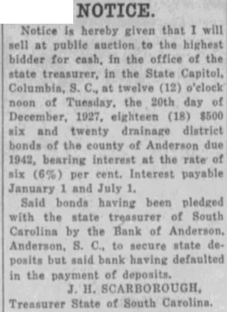 Notice is hereby given that will sell at public auction to the highest bidder for cash, in the office of the state treasurer, in the State Capitol, Columbia, S. C., at twelve (12) o'elock noon of Tuesday. the 20th day of December, 1927, eighteen (18) $500 six and twenty drainage district bonds of the county of Anderson due 1942, bearing interest at the rate of six (6%) per cent. Interest payable January and July Said bonds having been pledged with the state treasurer of South Carolina by the Bank of Anderson. Anderson, S. C., to secure state deposits but said bank having defaulted in the payment of deposits. H. SCARBOROUGH, Treasurer State of South Carolina.