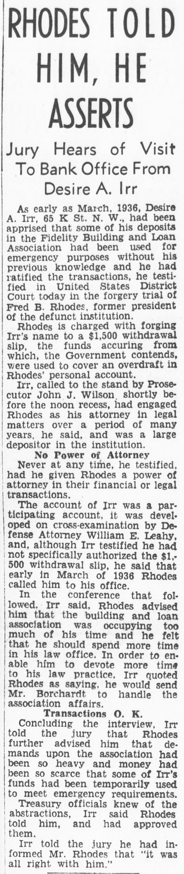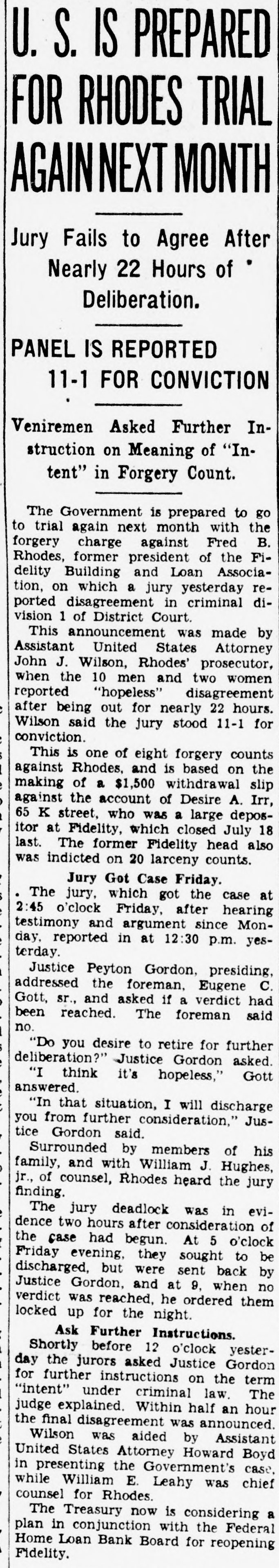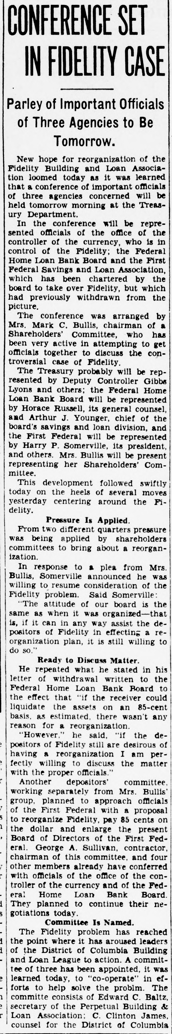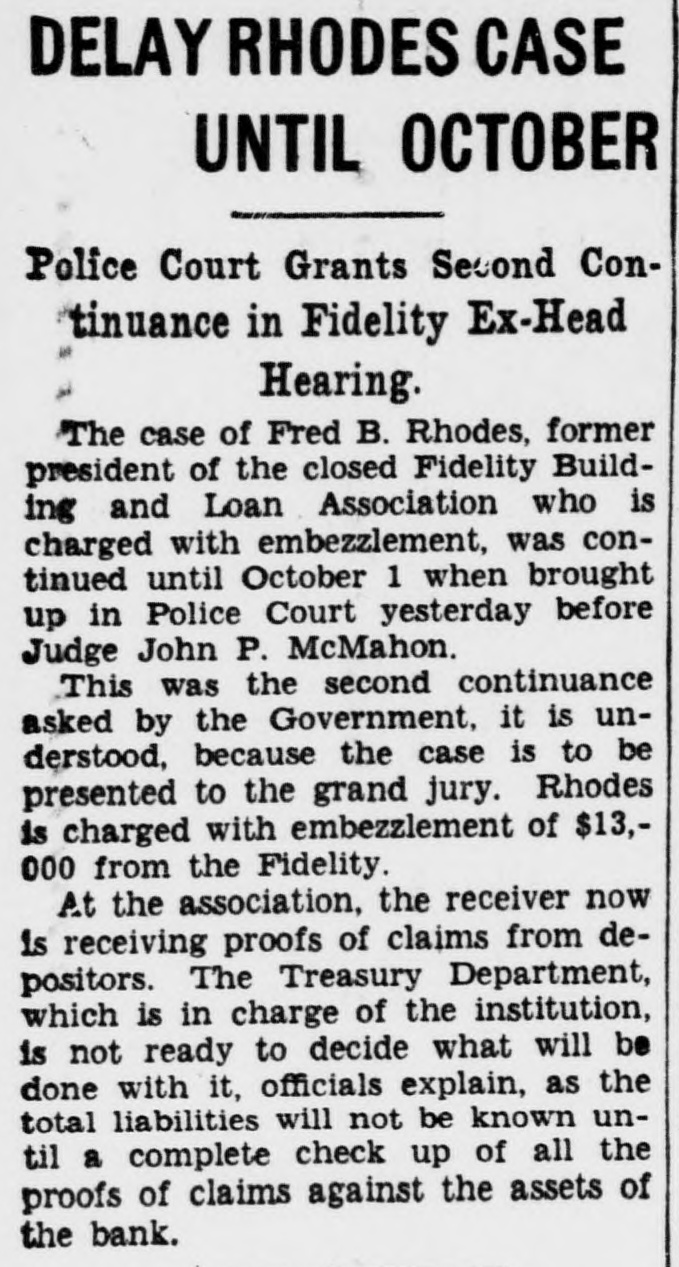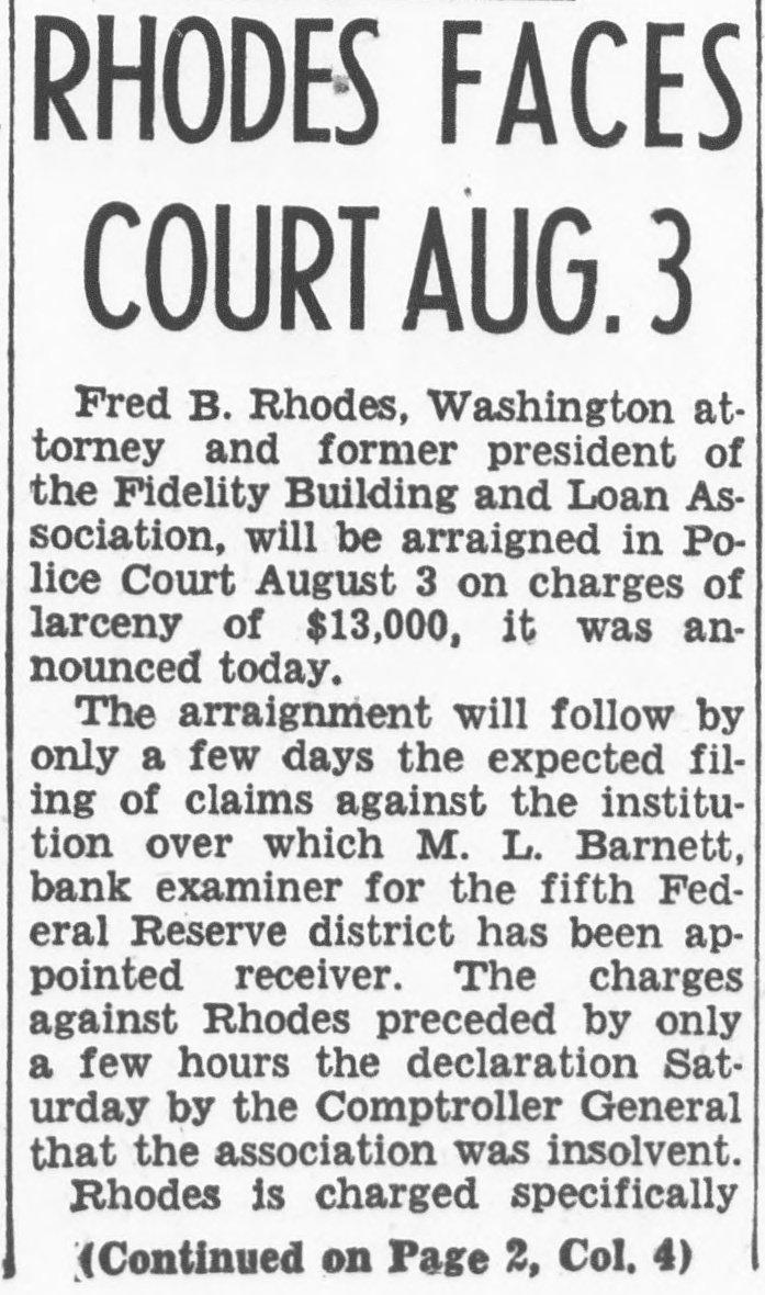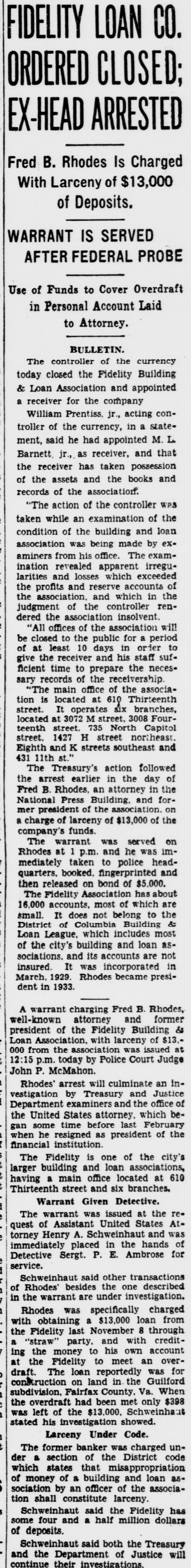 CO. LOAN FIDELITY OSED; ORDERED EX -HEAD ARRESTED Is B. Fred Rhodes Charged of With Larceny $13,000 of Deposits. IS SERVED WARRANT PROBE AFTER FEDERAL to of Use Cover Funds Overdraft in Laid Account Personal to Attorney. BULLETIN. of the The currency controller the closed today Fidelity Building and appointed Association company con& a receiver Loan Prentiss. for the jr., acting in a stateWilliam the currency, appointed M. L. troller of he had and that receiver and of the ment, Barnett. said jr., as has receiver, taken the books possession and the assets association. was action the records of the of the controller of "The while an examination building and by loan excondition taken of the being made The examassociation from was his officeren apparent exceeded irreau aminers ination revealed losses which accounts the of larities and and reservweight and in renthe the profits association the controller insolvent. dered of the for judgment the association of association period "All offices the public in orier be closed least to 10 days and his staff necesgive of at the time receiver to the Acient records of office the of the Thirteenth associasary "The main at 618x branches, tion is It operates street. 3008 Capitol street. K street. located at street, located 3072 M 735 street North northeast. Four- and Eighth and teenth 1427 H streets southeast followed 431 11th st. action day of The arrest Treasury's earlier an in attorney the and in for- the Fred the B. Rhodes, Press Building. on a charge of funds. mer National of the of $13,000 of the on served company's The warrant was and he was head- imRhodes at taken 1 p.m. Angerprinted police and mediately booked. bond of $5,000. then of which quarters. released Association on has about are Fidelity most to the The accounts. not belong & 16,000 does Building small. It of Columbia includes most asand Loan District League. building which and loan are not of the city's its accounts an in incorporated March. dent in 1933. sociations. insured. 1929. It Rhodes was became presiA Rhodes. warrant charging attorney Fred and Building B. former & S13.president well-known of the with Fidelity larceny was issued of at 000 12:15 Loan from Associatassociation p.m. the today by Police Court an Judge inJohn Rhodes P. McMahon. arrest Treasury will culminate and office Justice of vestigation by examiners and and the which beDepartment States attorney. last February of the gan the United some resigned time before as president financial when he institution of the city's The Fidelity and is one loan associations. at 610 building office located larger having a main and six branches. Thirteenth street Detective. reWarrant Given at the warrant was United issued States was Atquest A. the the The of Assistaschweinhaut hands and of Sergt. Detective torney immediately Henry placed P. in E. Ambrose for transactions service. said other one described of the warrant Schwein besides Rhodes are under the investigation. charged the through in with Rhodes obtaining was last a specifically November $13,000 with loan 8 credit- from overing "straw Fidelity the Fidelity money party. to to and his meet own an was account for the loan reportedly Guilford at construction draft. The Fairfax on land County, in met only s300 the Va. When $398 subdivision, overdraft had $13,000. been Schweinhaut stated the was left his of investigation the showed. Code. unLarceny Under charged former banker the was District code The a section of misappropriation by larceny. der of which money states of an a that building officer of and the loan associa- ashas tion sociation shall constitute the Fidelity some Schweinhaut four and a said half million dollars continue of Schweinhaut deposits. Department said both of the Justice Treasury will and the their investigations