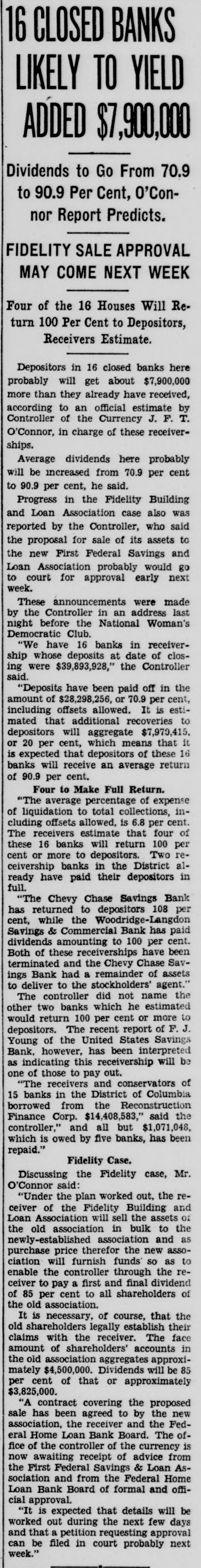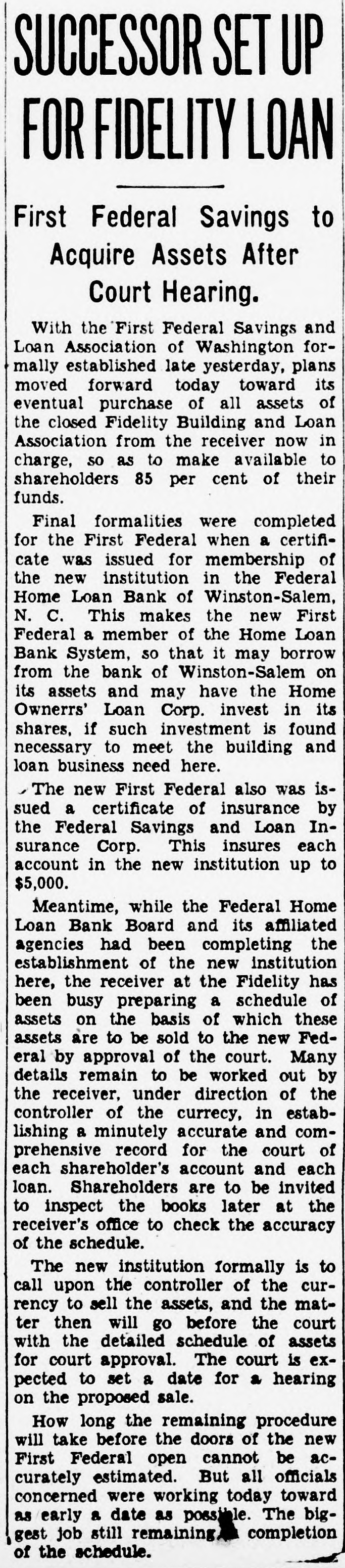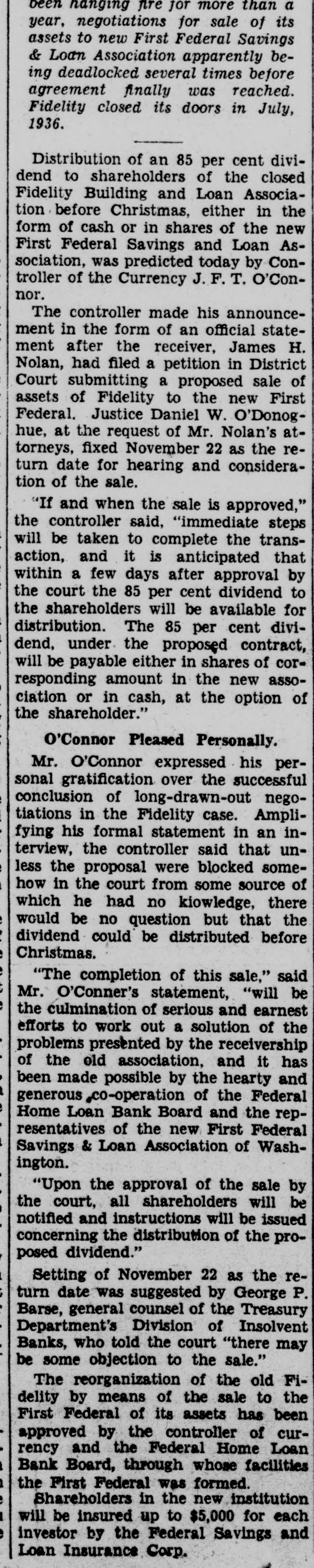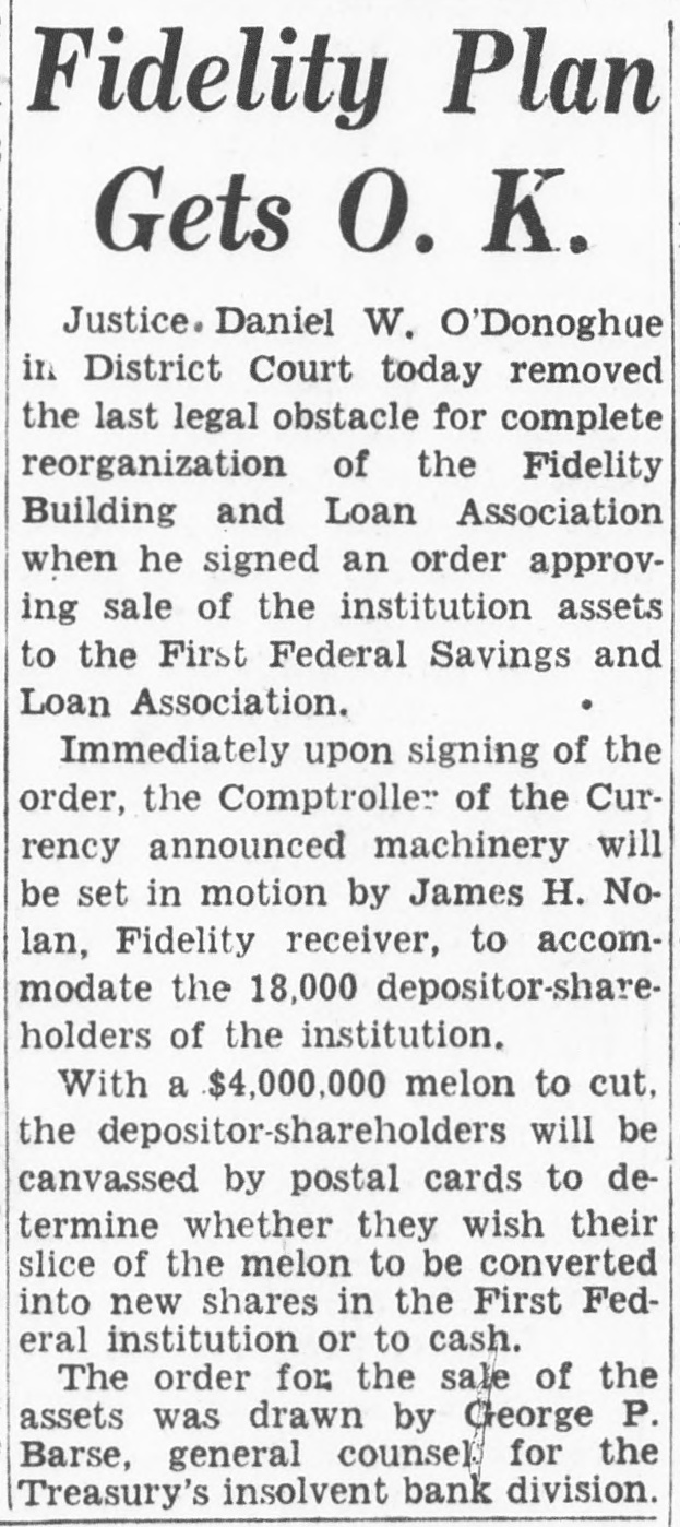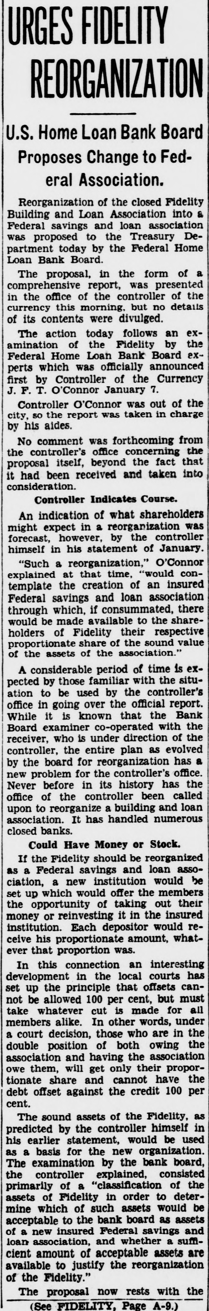 CO. LOAN FIDELITY OSED; ORDERED EX -HEAD ARRESTED Is B. Fred Rhodes Charged of With Larceny $13,000 of Deposits. IS SERVED WARRANT PROBE AFTER FEDERAL to of Use Cover Funds Overdraft in Laid Account Personal to Attorney. BULLETIN. of the The currency controller the closed today Fidelity Building and appointed Association company con& a receiver Loan Prentiss. for the jr., acting in a stateWilliam the currency, appointed M. L. troller of he had and that receiver and of the ment, Barnett. said jr., as has receiver, taken the books possession and the assets association. was action the records of the of the controller of "The while an examination building and by loan excondition taken of the being made The examassociation from was his officeren apparent exceeded irreau aminers ination revealed losses which accounts the of larities and and reservweight and in renthe the profits association the controller insolvent. dered of the for judgment the association of association period "All offices the public in orier be closed least to 10 days and his staff necesgive of at the time receiver to the Acient records of office the of the Thirteenth associasary "The main at 618x branches, tion is It operates street. 3008 Capitol street. K street. located at street, located 3072 M 735 street North northeast. Four- and Eighth and teenth 1427 H streets southeast followed 431 11th st. action day of The arrest Treasury's earlier an in attorney the and in for- the Fred the B. Rhodes, Press Building. on a charge of funds. mer National of the of $13,000 of the on served company's The warrant was and he was head- imRhodes at taken 1 p.m. Angerprinted police and mediately booked. bond of $5,000. then of which quarters. released Association on has about are Fidelity most to the The accounts. not belong & 16,000 does Building small. It of Columbia includes most asand Loan District League. building which and loan are not of the city's its accounts an in incorporated March. dent in 1933. sociations. insured. 1929. It Rhodes was became presiA Rhodes. warrant charging attorney Fred and Building B. former & S13.president well-known of the with Fidelity larceny was issued of at 000 12:15 Loan from Associatassociation p.m. the today by Police Court an Judge inJohn Rhodes P. McMahon. arrest Treasury will culminate and office Justice of vestigation by examiners and and the which beDepartment States attorney. last February of the gan the United some resigned time before as president financial when he institution of the city's The Fidelity and is one loan associations. at 610 building office located larger having a main and six branches. Thirteenth street Detective. reWarrant Given at the warrant was United issued States was Atquest A. the the The of Assistaschweinhaut hands and of Sergt. Detective torney immediately Henry placed P. in E. Ambrose for transactions service. said other one described of the warrant Schwein besides Rhodes are under the investigation. charged the through in with Rhodes obtaining was last a specifically November $13,000 with loan 8 credit- from overing "straw Fidelity the Fidelity money party. to to and his meet own an was account for the loan reportedly Guilford at construction draft. The Fairfax on land County, in met only s300 the Va. When $398 subdivision, overdraft had $13,000. been Schweinhaut stated the was left his of investigation the showed. Code. unLarceny Under charged former banker the was District code The a section of misappropriation by larceny. der of which money states of an a that building officer of and the loan associa- ashas tion sociation shall constitute the Fidelity some Schweinhaut four and a said half million dollars continue of Schweinhaut deposits. Department said both of the Justice Treasury will and the their investigations