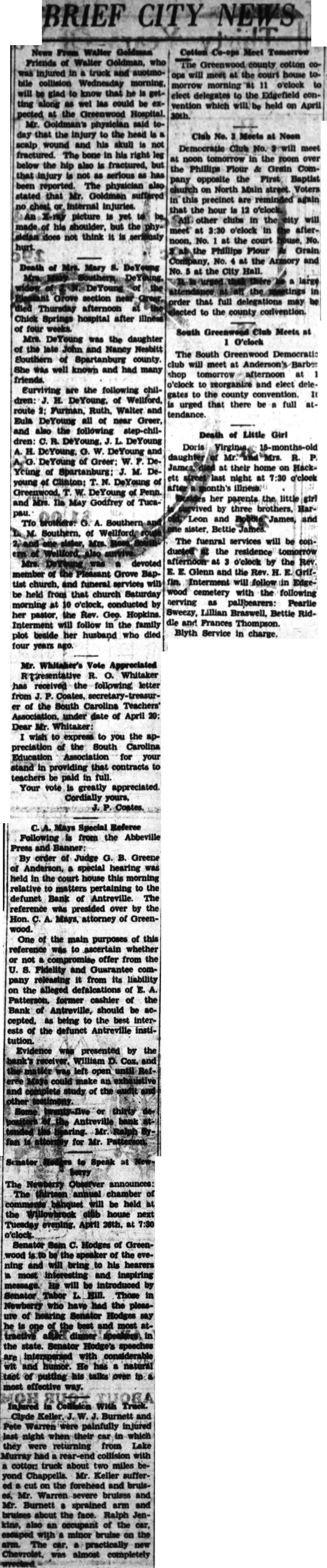 BRIEF CITY NEWS News From Walter Friends of Walter Goldman, who injured in truck bile collision Wednesday morning, will glad to know that he is getting along as wel las could be expected at the Greenwood Hospital. Mr. Goldman's physician said today that the injury to the head is scalp wound and his skull is not fractured. The bone in his right leg below the hip also is fractured, but that injury is not as serious as has been reported. The physician also stated that Mr. Goldman suffered chest or internal injuries. picture is yet his shoulder, but the sician not think is Death of Mary DeYoung Pleasant Grove section near died Thursday afternoon Chick Springs hospital after illness of four weeks. Mrs. DeYoung was the daughter of the late John and Nancy Nesbitt Southern of Spartanburg county. She was well known and had many friends. Eurviving are the following children: H. DeYoung, of Wellford, route Furman, Ruth, Walter and Eula DeYoung all of near Greer, and also the following step-children: C. R. DeYoung. J. L. DeYoung DeYoung. G. W. DeYoung and DeYoung of Greer: W. DeYoung of Spartanburg: J. M. Deyoung of Clinton: N. DeYoung of Greenwood, T. W. DeYoung of Penn. and Mrs. Ila May Godfrey of Tucapau. brothers: Southern of Mrs. Mrs. devoted member of the Pleasant Grove Baptist church, and funeral services will be held from that church Saturday morning at 10 o'clock, conducted by her pastor, the Rev. Geo. Hopkins. Interment will follow in the family plot beside her husband who died four years ago. Mr. Whitaker's Vote Appreciated R presentative R. O. Whitaker has received the following letter from J. Coates, er of the South Carolina Teachers' under date of April 20: Dear Mr. Whitaker: wish to express to you the appreciation of the South Carolina Education Association for your stand in providing that contracts to teachers be paid in full. Your vote is greatly appreciated. Cordially yours, Mays Special Referee Following is from the Abbeville Press and Banner: By order of Judge G. B. Greene of Anderson, a special hearing was held in the court house this morning relative to matters pertaining to the defunct Bank of Antreville. The reference was presided over by the Hon. Mays, attorney of Greenwood. One of the main purposes of this reference was to ascertain whether or not offer from the U. S. Fidelity and Guarantee company releasing it from its liability on the alleged defalcations of E. A. Patterson. former cashier of the Bank of Antreville, should be accepted. as being to the best interests of the defunct Antreville institution. Evidence was presented by the bank's receiver. William Cox. and left open until could an and complete study of the sudit and other Antreville bank tended Ralph fan is for Mr. to Speak at The Newberry Observer announces: The thirteen annual chamber of banquet will be held at the Willowbrook club house next Tuesday evening. April 26th. at 7:30 o'clock. Senator Sam C. Hodges of Greenwood be the speaker of the evening and will bring to his hearers a most interesting and inspiring message. He will be by Senator Tabor Those in Newberry who have had the pleasure of hearing Senator Hodges say is one of the best and most atdinner in the state. Senator Hodge's speeches interspersed with considerable wit and humor. He has natural tact of putting his talks over in most effective way. Injured Collision With Truck. Clyde Keller. Burnett and Pete Warren were painfully injured last night when their car in which they were returning from Lake Murray had rear-end collision with cottor: truck about two miles beyond Chappells. Mr. Keller suffera cut on the forehead and bruises, Mr. Warren severe bruises and Mr. Burnett sprained arm and bruises about the face. Ralph Jenkins, also an occupant of the car, escaped with minor bruise on the arm. The car, practically new Chevrolet, was almost completely Cotton Meet Tomorrow The Greenwood cotton coops will meet at the court house tomorrow morning 11 o'clock elect delegates to the Edgefield convention which held on April Club No. Meets at Noon Democratic Club No. meet at noon tomorrow in the room over the Phillips Flour & Grain Company opposite the First Baptist church on North Main street. Voters this precinct are reminded again that the hour is 12 o'clock. other clubs in will meet at 3:30 o'elock in afternoon, No. at the court No. the Phillips Flour Grain Company, No. at the Armory and No. at the City Hall. large in that full delegations may be elected to the county convention. South Greenwood Club Meets at O'clock The South Greenwood Democratic club will meet at Anderson's Barber shop tomorrow afternoon at o'clock to reorganize and elect delegates to the county convention. is urged that there be full attendance. Death of Little Girl Doris Virginia 15-months-old daughter R. at their home on Hackett night at 7:30 o'clock Desides her parents the little girl survived by three brothers, Harand and The fuenral services will be condusted at the residence tomorrow afternoon at 3 o'clock by the Rev E. E. Glenn and the Rev. H. Griffin. Interment will follow in Edgewood cemetery with the following serving as pallbearers: Pearlie Sweezy, Lillian Braswell, Bettie Riddie and Frances Thompson. Blyth Service in charge.