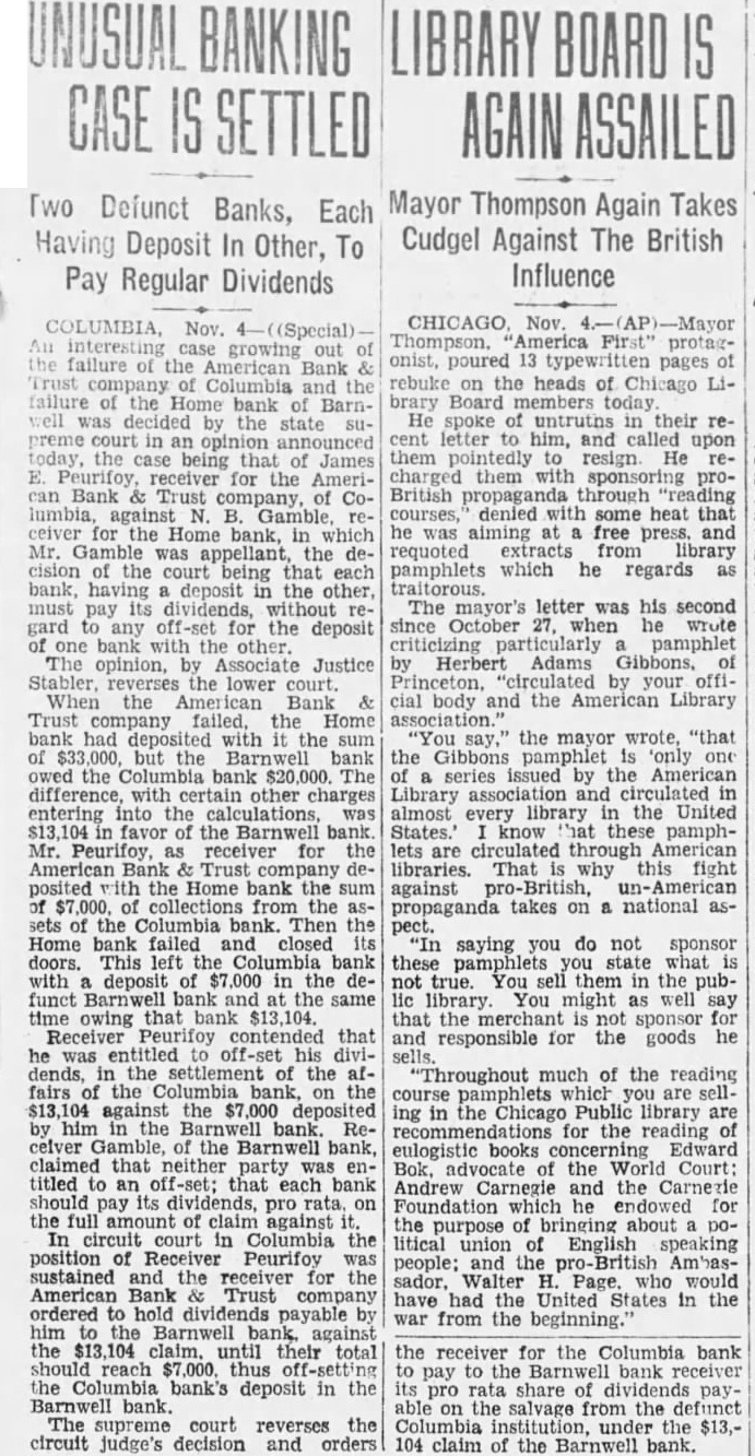 CHICAGO, Nov. Thompson. First" protagonist, poured 13 pages rebuke on the heads of Chicago Board members today. He spoke in their reletter to him, and called upon them resign He recharged them with sponsoring proBritish propaganda through courses, denied with some heat that he was aiming at free press. and requoted extracts from library pamphlets which he regards as traitorous. The mayor's letter was his second since October when wrute criticizing pamphlet by Herbert Adams Gibbons, by your cial body and the American Library the mayor wrote, "that the Gibbons pamphlet is 'only series issued by the American Library and circulated almost every library in the United States.' know these pamphlets are circulated through American libraries. That why this fight against pro-British, propaganda takes on a national aspect. "In saying you do not sponsor these you state what not true. You sell them the publibrary You might as well say that the not sponsor for and responsible for the goods he sells. "Throughout much of the reading course which you are selling in the Chicago Public library are for the reading eulogistic books concerning Edward Bok, advocate the World Court: Andrew Carnegie and the Carnezie Foundation endowed for the purpose of about political union English speaking people; and the Ambassador, Walter Page. who would have had the United States in the war from the beginning. the receiver for the Columbia bank to to the Barnwell bank receiver its pro rata share paythe salvage from the the $13,104 claim of the Barnwell bank.