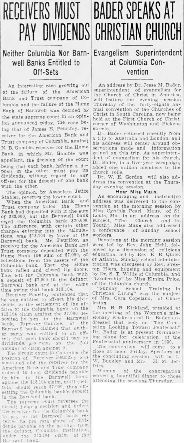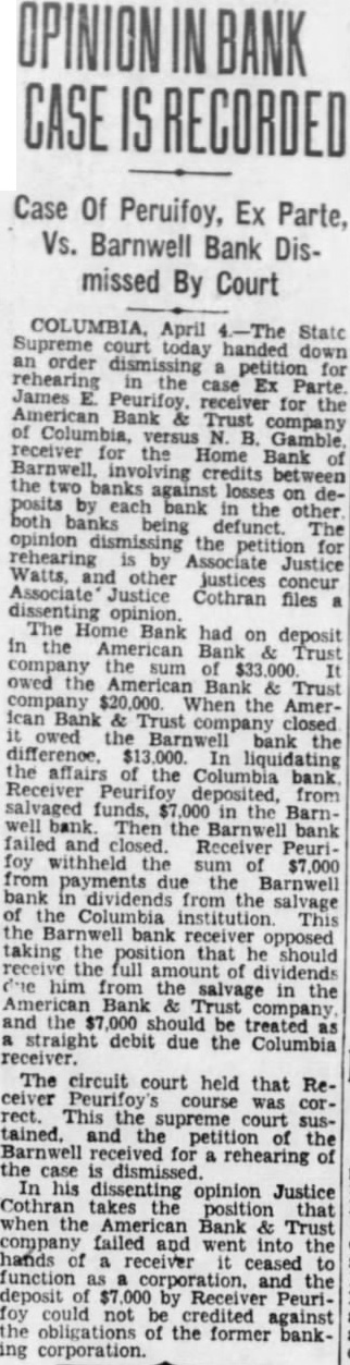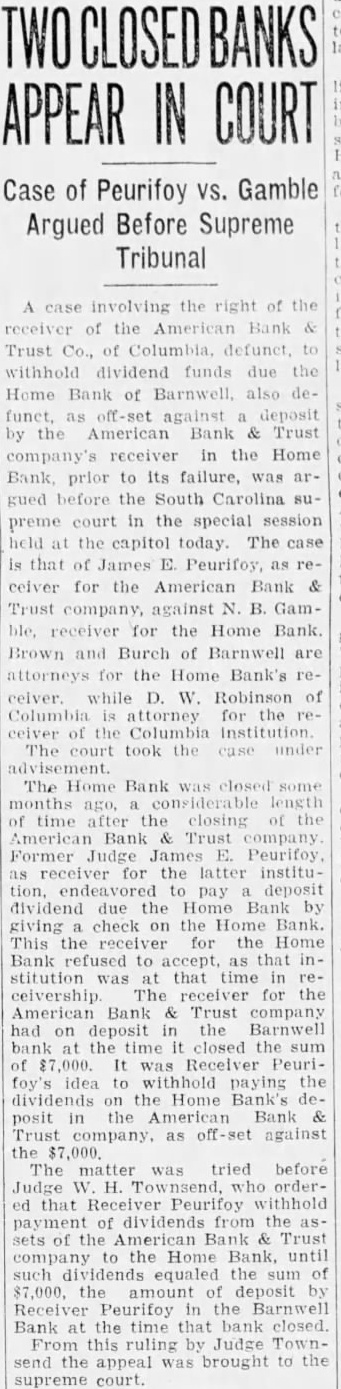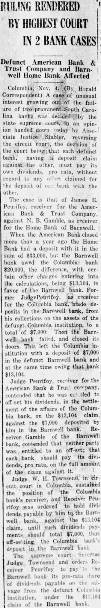 COLUMBIA, Nov. out failure the American Bank Trust Columbia and the failure of the Home bank of Barn decided by the state today, the case being James receiver for the AmeriBank Trust Columbia, against Gamble ceiver for Home bank, in which Mr. Gamble was appellant, the cision the court being that each bank, having deposit in other, must pay dividends, without gard any the deposit bank the other. The opinion, by Associate Justice the lower court. When Bank Trust failed, the Home bank had deposited with the sum of but the bank owed the bank The difference, with other charges entering into the $13,104 in favor of the Barnwell bank. as receiver for the American Bank Trust company deposited the Home bank the sum collections from the the Columbia bank. Then the Home bank failed and closed its doors. This left bank with deposit in the defunct Barnwell at the same owing that bank $13,104. Receiver Peurifoy contended that was entitled his dividends, the settlement of the fairs of the Columbia bank, the against the $7,000 deposited him in the Barnwell Recelver the Barnwell bank, claimed that neither party was titled to an that bank should pay its dividends, pro the full of claim against circuit court in Columbia the position of Receiver Peurifoy sustained and the receiver for American Bank Trust ordered to hold dividends payable him to the Barnwell bank against the $13,104 claim. until their total should reach $7,000. thus the bank's deposit in the bank. The court reverses the circuit judge's decision and orders