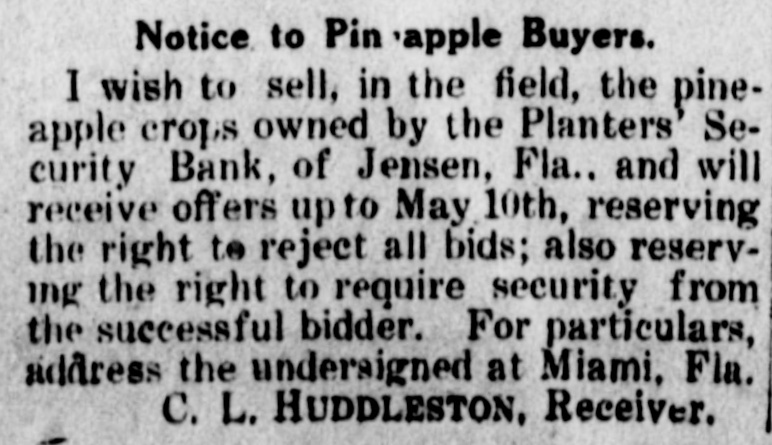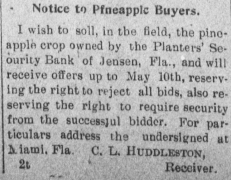 Notice to Pin apple Buyers. I wish to sell, in the field, the pineapple crops owned by the Planters Security Bank, of Jensen, Fla.. and will receive offers upto May 10th, reserving the right te reject all bids; also reservmg the right to require security from the successful bidder. For particulars, address the undersigned at Miami, Fla. C. L. HUDDLESTON, Receiver.